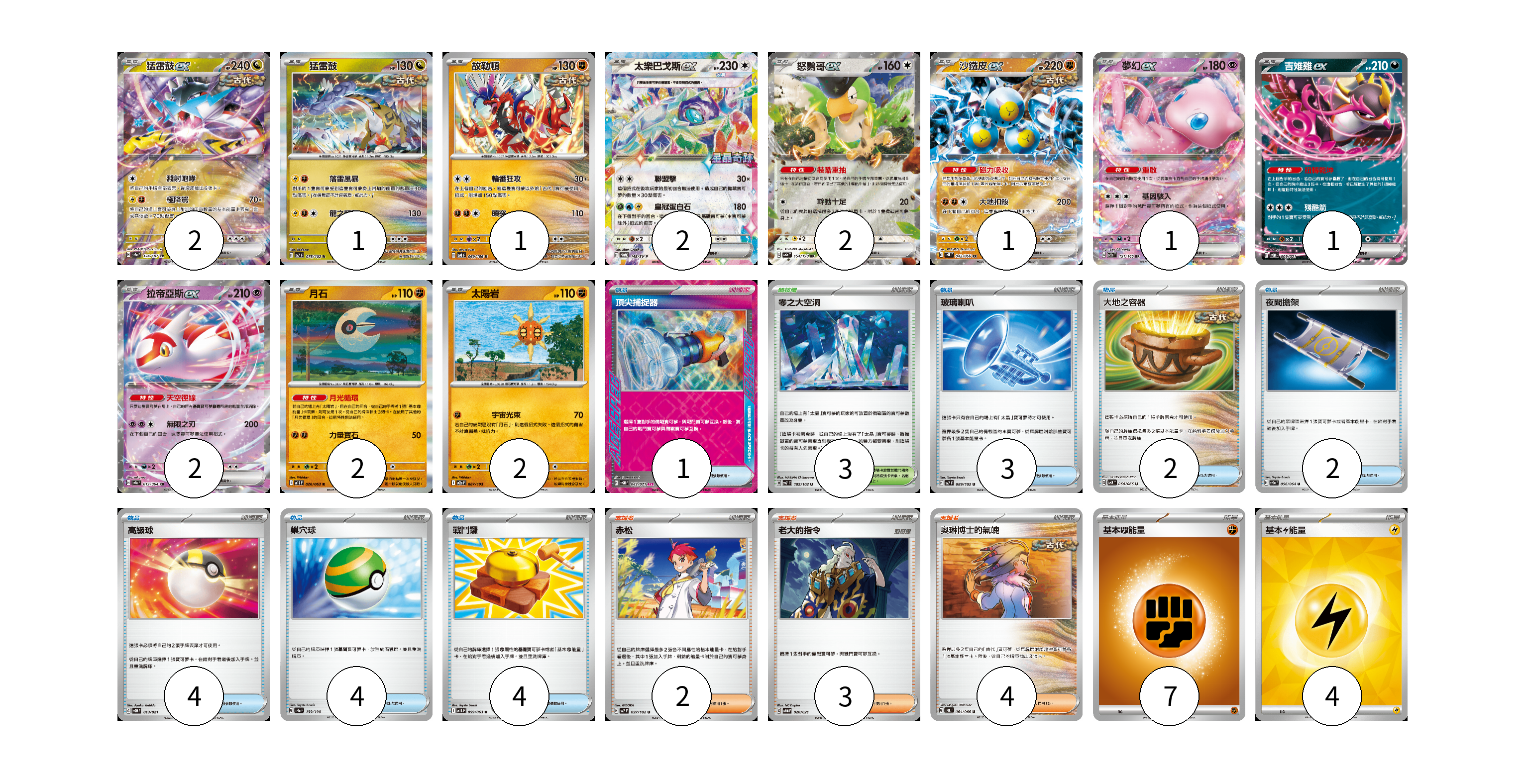 牌組構築方案 以此牌組為基礎新構築牌組 顯示卡面 顯示列表 寶可夢卡(17) 2 1 1 2 2 1 1 1 2 2 2 物品卡(20) 1 3 2 2 4 4 4 支援者卡(9) 2 3 4 競技場卡(3) 3 能量卡(11) 7 4 寶可夢卡(17) 卡牌名稱 張數 卡牌名稱 張數 猛雷鼓ex SV8a 124/187 02 猛雷鼓 SV7 075/102 01 故勒頓 SV8 069/106 01 太樂巴戈斯ex SV-P 148/SV-P 02 怒鸚哥ex SV4a 154/190 02 沙鐵皮ex SV4K 042/066 01 夢幻ex SV2a 151/165 01 吉雉雞ex SVOM 009/021 01 拉帝亞斯ex SV7a 019/064 02 月石 M1L 026/063 02 太陽岩 M2a 087/193 02 物品卡(20) 卡牌名稱 張數 卡牌名稱 張數 頂尖捕捉器 SV5M 062/071 01 玻璃喇叭 SV7 089/102 03 大地之容器 SV4K 060/066 02 夜間擔架 SV6a 056/064 02 高級球 SVOM 013/021 04 巢穴球 SV4a 159/190 04 戰鬥鑼 M1L 059/063 04 支援者卡(9) 卡牌名稱 張數 卡牌名稱 張數 赤松 SV7 097/102 02 老大的指令 SVOM 020/021 03 奧琳博士的氣魄 SV4K 064/066 04 競技場卡(3) 卡牌名稱 張數 卡牌名稱 張數 零之大空洞 SV7 102/102 03 能量卡(11) 卡牌名稱 張數 卡牌名稱 張數 基本【鬥】能量 M-P FIG 07 基本【雷】能量 SVQP LIG 04 以此牌組為基礎新構築牌組 牌組編碼 QTcbPF-iPpUvZ-ciknEv copy 列印牌組單 牌組編碼已複製 分享至SNS