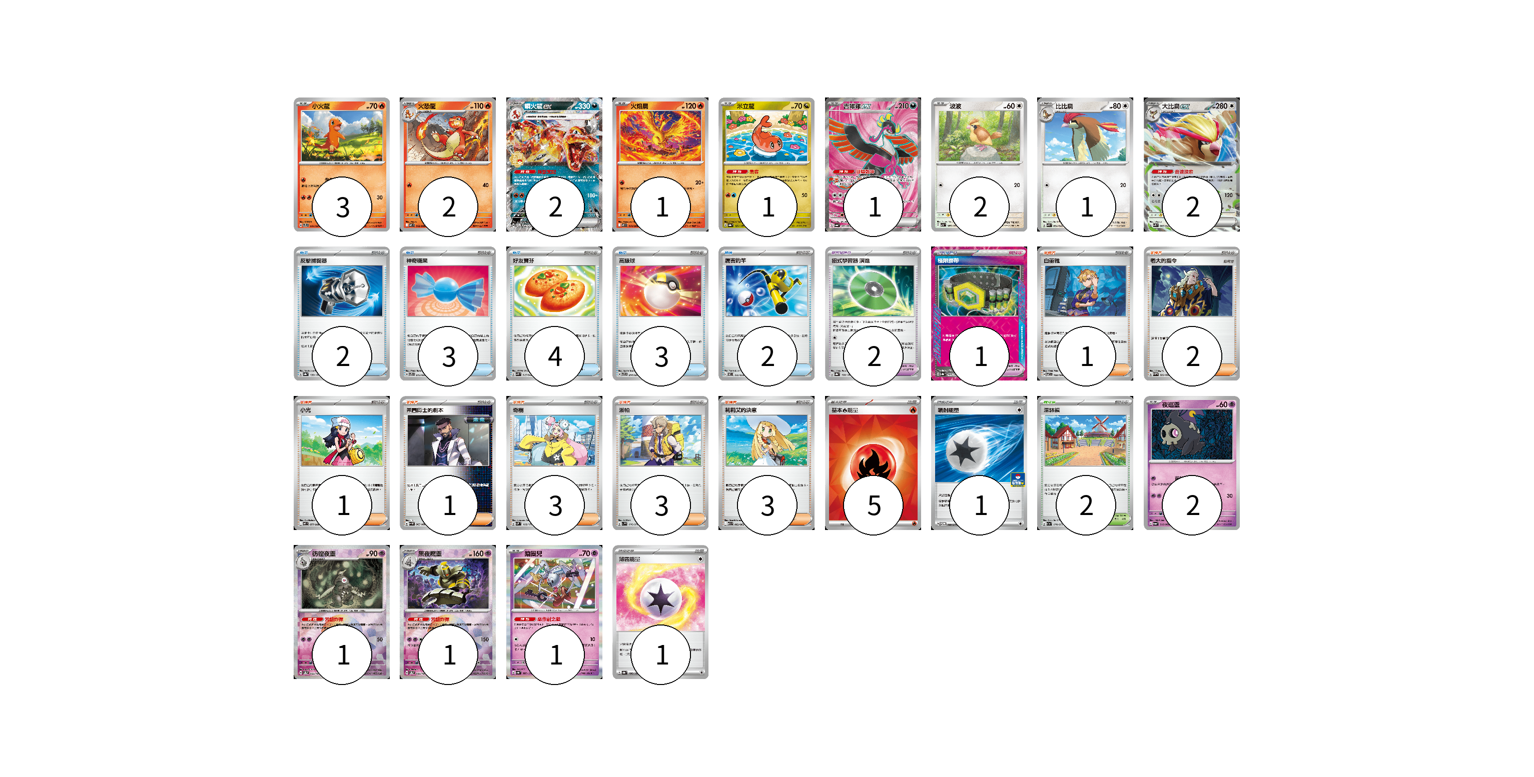 牌組構築方案 以此牌組為基礎新構築牌組 顯示卡面 顯示列表 寶可夢卡(22) 3 2 2 1 1 1 2 1 2 2 2 1 1 1 寶可夢道具(3) 2 1 物品卡(12) 2 3 4 3 支援者卡(14) 1 2 1 1 3 3 3 競技場卡(2) 2 能量卡(7) 5 1 1 寶可夢卡(22) 卡牌名稱 張數 卡牌名稱 張數 小火龍 SVTL 001/021 03 火恐龍 M2 012/080 02 噴火龍ex SV-P 166/SV-P 02 火焰鳥 M2 014/080 01 米立龍 SV8a 121/187 01 吉雉雞ex SV6a 081/064 01 波波 SV3 087/108 02 比比鳥 SVK 004/042 01 大比鳥ex SVK 005/042 02 厲害釣竿 SVEL 010/020 02 夜巡靈 SV6a 018/064 02 彷徨夜靈 SV8a 065/187 01 黑夜魔靈 SV8a 066/187 01 鑰圈兒 SV4a 087/190 01 寶可夢道具(3) 卡牌名稱 張數 卡牌名稱 張數 招式學習器 演進 SV8a 160/187 02 極限腰帶 SV8a 159/187 01 物品卡(12) 卡牌名稱 張數 卡牌名稱 張數 反擊捕捉器 SV8a 139/187 02 神奇糖果 SVTS 015/022 03 好友寶芬 SVK 015/042 04 高級球 SVTR 014/021 03 支援者卡(14) 卡牌名稱 張數 卡牌名稱 張數 白蕾雅 SV7 100/102 01 老大的指令 SVHM 022/022 02 小光 M2 077/080 01 弗圖博士的劇本 SV4M 065/066 01 奇樹 SVM 160/175 03 派帕 SV1V 076/078 03 莉莉艾的決意 M1L 062/063 03 競技場卡(2) 卡牌名稱 張數 卡牌名稱 張數 深缽鎮 SV1a 070/073 02 能量卡(7) 卡牌名稱 張數 卡牌名稱 張數 基本【火】能量 SVK FIR 05 噴射能量 SV-P 180/SV-P 01 薄霧能量 SV8a 186/187 01 以此牌組為基礎新構築牌組 牌組編碼 QUZOqq-qwJfia-gLmnrV copy 列印牌組單 牌組編碼已複製 分享至SNS