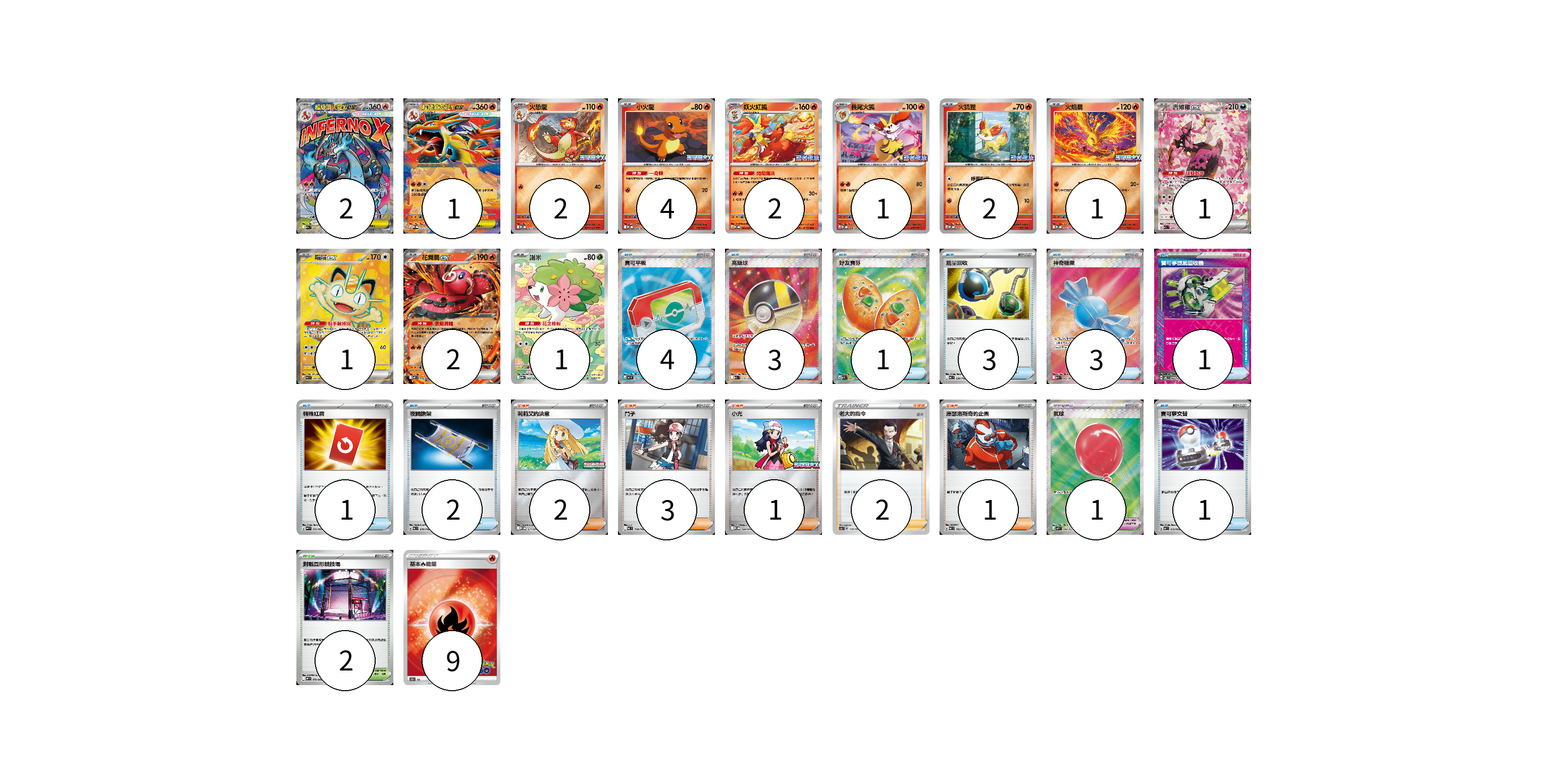 牌組構築方案 以此牌組為基礎新構築牌組 顯示卡面 顯示列表 寶可夢卡(20) 2 1 2 4 2 1 2 1 1 1 2 1 寶可夢道具(1) 1 物品卡(19) 4 3 1 3 3 1 1 2 1 支援者卡(9) 2 3 1 2 1 競技場卡(2) 2 能量卡(9) 9 寶可夢卡(20) 卡牌名稱 張數 卡牌名稱 張數 超級噴火龍Xex M2a 223/193 02 超級噴火龍Yex M-P 073/M-P 01 火恐龍 M-P 021/M-P 02 小火龍 M-P 020/M-P 04 妖火紅狐 M-P 094/M-P 02 長尾火狐 M-P 086/M-P 01 火狐狸 M-P 085/M-P 02 火焰鳥 M-P 022/M-P 01 吉雉雞ex M2a 244/193 01 喵喵ex M3 100/080 01 花舞鳥ex M2 018/080 02 謝米 SV9a 066/063 01 寶可夢道具(1) 卡牌名稱 張數 卡牌名稱 張數 氣球 M1L 084/063 01 物品卡(19) 卡牌名稱 張數 卡牌名稱 張數 寶可平板 M3 103/080 04 高級球 M2a 216/193 03 好友寶芬 M1S 081/063 01 能量回收 MC 636/742 03 神奇糖果 M1S 082/063 03 寶可夢旋風回收機 SV6 093/101 01 特殊紅牌 M4 072/083 01 夜間擔架 MC 670/742 02 寶可夢交替 MJ 019/022 01 支援者卡(9) 卡牌名稱 張數 卡牌名稱 張數 莉莉艾的決意 M-P 011/M-P 02 鬥子 MC 718/742 03 小光 M-P 028/M-P 01 老大的指令(坂木) SCA 118/135 02 庫瑟洛斯奇的企圖 MC 705/742 01 競技場卡(2) 卡牌名稱 張數 卡牌名稱 張數 對戰圓形競技場 M2 079/080 02 能量卡(9) 卡牌名稱 張數 卡牌名稱 張數 基本火能量 S10b FIR 09 以此牌組為基礎新構築牌組 牌組編碼 QUzZoW-hzMnOm-TnSYJA copy 列印牌組單 牌組編碼已複製 分享至SNS
