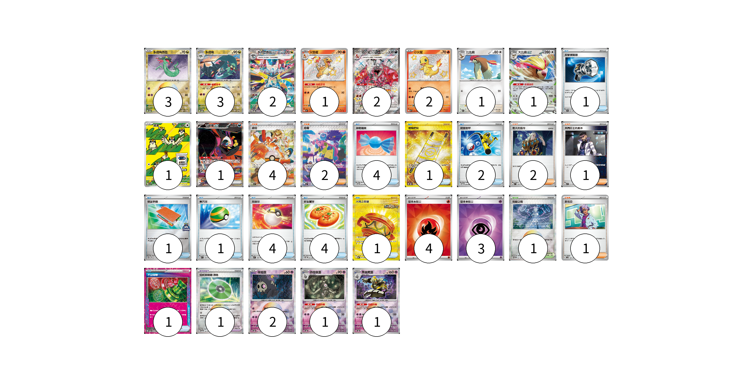 牌組構築方案 以此牌組為基礎新構築牌組 顯示卡面 顯示列表 寶可夢卡(21) 3 3 2 1 2 2 1 1 1 1 2 1 1 寶可夢道具(1) 1 物品卡(20) 1 4 1 2 1 1 4 4 1 1 支援者卡(10) 4 2 2 1 1 競技場卡(1) 1 能量卡(7) 4 3 寶可夢卡(21) 卡牌名稱 張數 卡牌名稱 張數 多龍梅西亞 SV8a 118/187 03 多龍奇 SV8a 119/187 03 多龍巴魯托ex SV8a 221/187 02 火恐龍 SV4a 211/190 01 噴火龍ex SV4a 331/190 02 小火龍 SV4a 210/190 02 比比鳥 SVK 004/042 01 大比鳥ex SVK 005/042 01 波波 SV3 118/108 01 吉雉雞ex SV6a 089/064 01 夜巡靈 SV8a 064/187 02 彷徨夜靈 SV8a 065/187 01 黑夜魔靈 SV8a 066/187 01 寶可夢道具(1) 卡牌名稱 張數 卡牌名稱 張數 招式學習器 演進 SV8a 160/187 01 物品卡(20) 卡牌名稱 張數 卡牌名稱 張數 反擊捕捉器 SVK 009/042 01 神奇糖果 SVTM 013/022 04 夜間擔架 SV8 137/106 01 厲害釣竿 SVOD 010/020 02 朋友手冊 SV-P 182/SV-P 01 巢穴球 SVM 133/175 01 高級球 SVM 134/175 04 好友寶芬 SVOD 011/020 04 大地之容器 SV6a 093/064 01 不公印章 SV5a 053/066 01 支援者卡(10) 卡牌名稱 張數 卡牌名稱 張數 派帕 SV4a 353/190 04 奇樹 SV4a 350/190 02 老大的指令 SVM 172/175 02 弗圖博士的劇本 SVK 034/042 01 吉尼亞 SVD 129/139 01 競技場卡(1) 卡牌名稱 張數 卡牌名稱 張數 阻礙之塔 SV8a 181/187 01 能量卡(7) 卡牌名稱 張數 卡牌名稱 張數 基本【火】能量 SVM FIR 04 基本【超】能量 SVM PSY 03 以此牌組為基礎新構築牌組 牌組編碼 QXPhKD-yVIMQx-iGWsPz copy 列印牌組單 牌組編碼已複製 分享至SNS