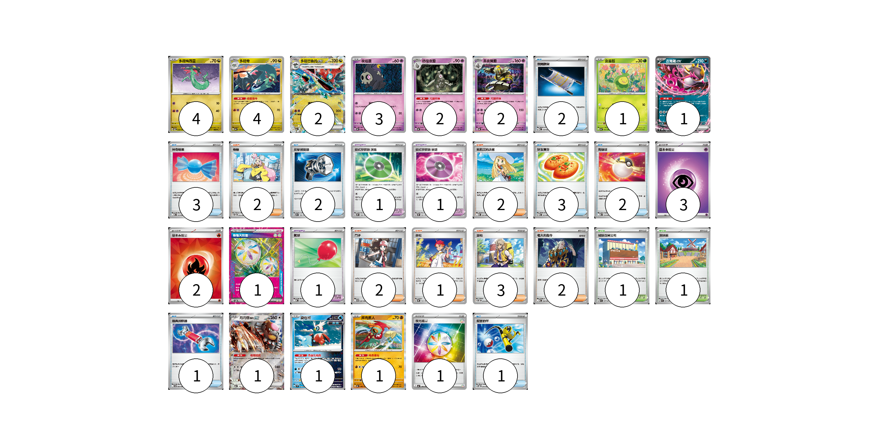 牌組構築方案 以此牌組為基礎新構築牌組 顯示卡面 顯示列表 寶可夢卡(22) 4 4 2 3 2 2 1 1 1 1 1 寶可夢道具(3) 1 1 1 物品卡(14) 2 3 2 3 2 1 1 支援者卡(12) 2 2 2 1 3 2 競技場卡(2) 1 1 能量卡(7) 3 2 1 1 寶可夢卡(22) 卡牌名稱 張數 卡牌名稱 張數 多龍梅西亞 SV6 079/101 04 多龍奇 SV8a 119/187 04 多龍巴魯托ex SV8a 120/187 02 夜巡靈 SV8a 064/187 03 彷徨夜靈 SV8a 065/187 02 黑夜魔靈 SV8a 066/187 02 含羞苞 SV8a 001/187 01 吉雉雞ex SVOD 004/020 01 月月熊 赫月ex SV8a 134/187 01 鐵包袱 SV4M 020/066 01 摔角鷹人 SV8a 084/187 01 寶可夢道具(3) 卡牌名稱 張數 卡牌名稱 張數 招式學習器 演進 SV8a 160/187 01 招式學習器 衰退 SV8a 161/187 01 氣球 MBD 018/022 01 物品卡(14) 卡牌名稱 張數 卡牌名稱 張數 夜間擔架 MBD 016/022 02 神奇糖果 MBG 013/022 03 反擊捕捉器 SV8a 139/187 02 好友寶芬 MBD 013/022 03 高級球 MBD 014/022 02 道具拆除器 SV11W 080/086 01 厲害釣竿 SVOD 010/020 01 支援者卡(12) 卡牌名稱 張數 卡牌名稱 張數 奇樹 SVOD 016/020 02 莉莉艾的決意 MBD 021/022 02 鬥子 SV11W 085/086 02 赤松 SV8a 163/187 01 派帕 SVOD 018/020 03 老大的指令 MBD 020/022 02 競技場卡(2) 卡牌名稱 張數 卡牌名稱 張數 城鎮百貨公司 SVK 037/042 01 深缽鎮 SVK 039/042 01 能量卡(7) 卡牌名稱 張數 卡牌名稱 張數 基本【超】能量 MBD PSY 03 基本【火】能量 SVQL FIR 02 新衝天能量 SV5K 071/071 01 夜光能量 SV4a 190/190 01 以此牌組為基礎新構築牌組 牌組編碼 QXtFeW-JCjfSE-vIPhAB copy 列印牌組單 牌組編碼已複製 分享至SNS