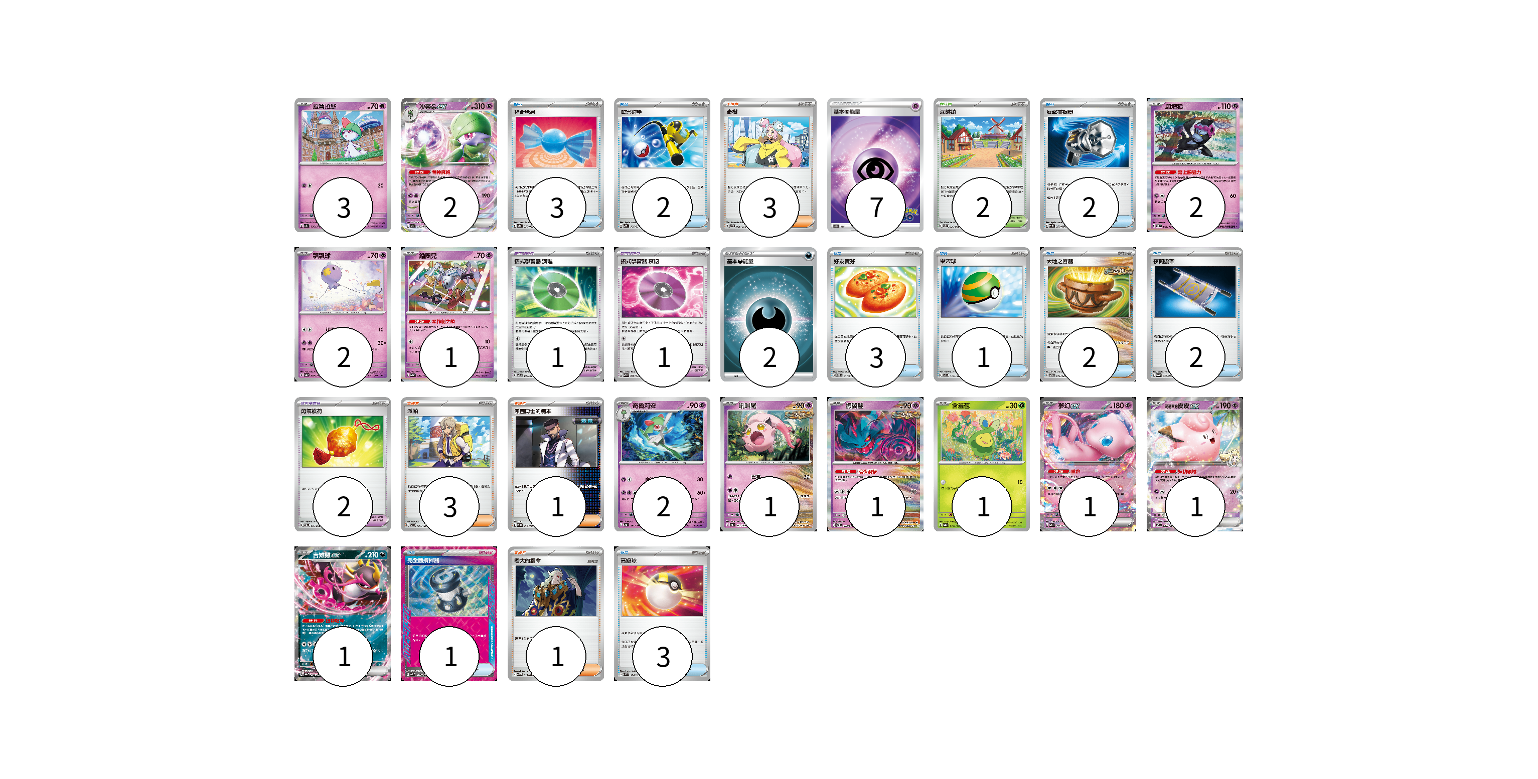 牌組構築方案 以此牌組為基礎新構築牌組 顯示卡面 顯示列表 寶可夢卡(18) 3 2 2 2 1 2 1 1 1 1 1 1 寶可夢道具(4) 1 1 2 物品卡(19) 3 2 2 3 1 2 2 1 3 支援者卡(8) 3 3 1 1 競技場卡(2) 2 能量卡(9) 7 2 寶可夢卡(18) 卡牌名稱 張數 卡牌名稱 張數 拉魯拉絲 SV1S 026/078 03 沙奈朵ex SV1S 028/078 02 願增猿 SV6 055/101 02 飄飄球 SV4a 083/190 02 鑰圈兒 SV4a 087/190 01 奇魯莉安 SV4a 081/190 02 吼叫尾 SV4K 032/066 01 振翼髮 SV5K 033/071 01 含羞苞 SV8a 001/187 01 夢幻ex SVK 001/042 01 莉莉艾的皮皮ex SV9 033/100 01 吉雉雞ex SV8a 104/187 01 寶可夢道具(4) 卡牌名稱 張數 卡牌名稱 張數 招式學習器 演進 SVTL 017/021 01 招式學習器 衰退 SVK 026/042 01 勇氣護符 SVEM 016/020 02 物品卡(19) 卡牌名稱 張數 卡牌名稱 張數 神奇糖果 SV3a 053/062 03 厲害釣竿 SV2P 066/071 02 反擊捕捉器 SV4M 059/066 02 好友寶芬 SVTG 011/019 03 巢穴球 SVD 118/139 01 大地之容器 SVTS 011/022 02 夜間擔架 SV6a 056/064 02 完全體攪拌器 SVK 017/042 01 高級球 SVM 134/175 03 支援者卡(8) 卡牌名稱 張數 卡牌名稱 張數 奇樹 SVF 029/038 03 派帕 SVD 137/139 03 弗圖博士的劇本 SV4M 065/066 01 老大的指令 SVHM 022/022 01 競技場卡(2) 卡牌名稱 張數 卡牌名稱 張數 深缽鎮 SVF 036/038 02 能量卡(9) 卡牌名稱 張數 卡牌名稱 張數 基本超能量 S10b PSY 07 基本惡能量 SLD DAR 02 以此牌組為基礎新構築牌組 牌組編碼 QaGZFm-zEbrLf-rTysUT copy 列印牌組單 牌組編碼已複製 分享至SNS
