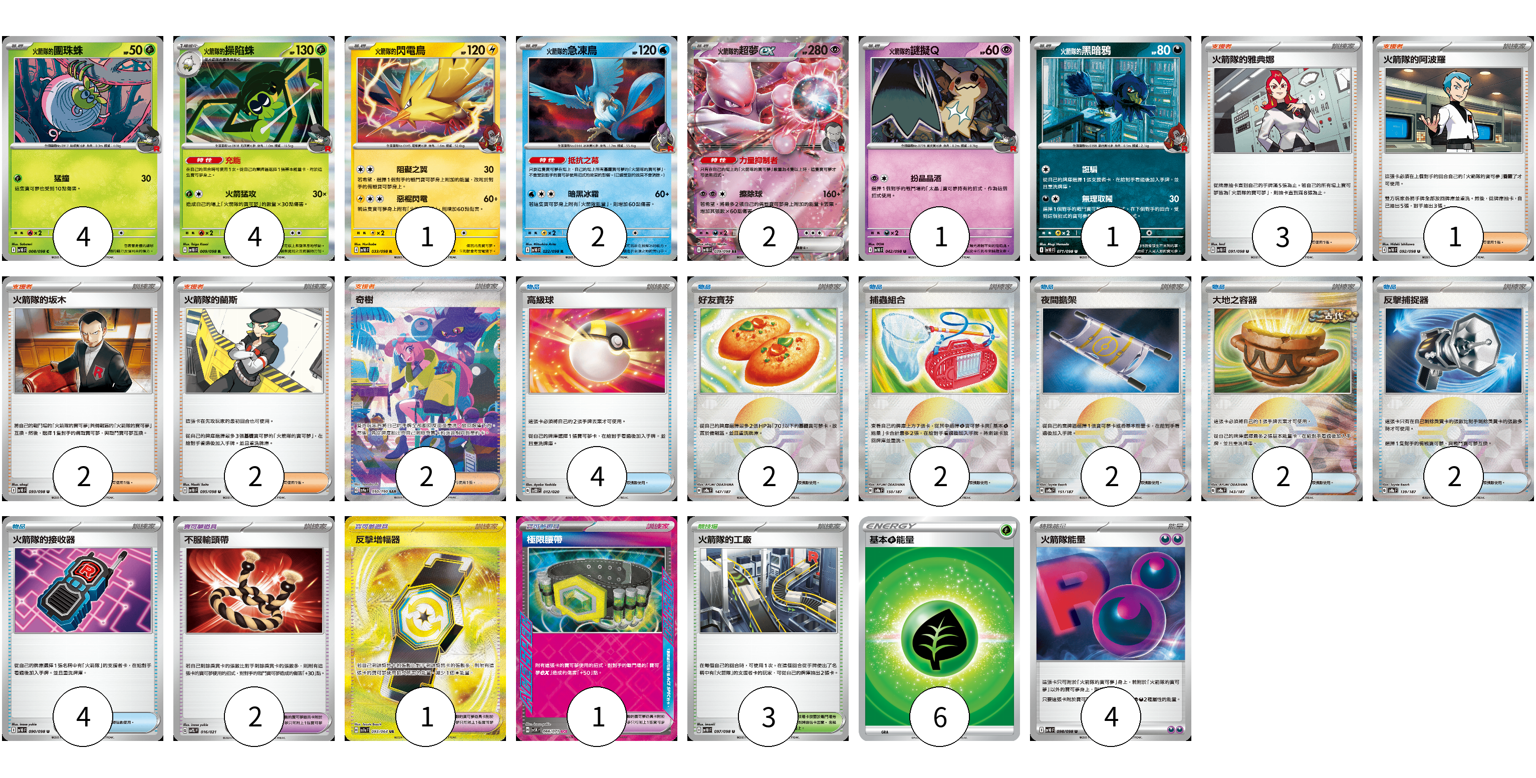 牌組構築方案 以此牌組為基礎新構築牌組 顯示卡面 顯示列表 寶可夢卡(15) 4 4 1 2 2 1 1 寶可夢道具(4) 2 1 1 物品卡(18) 4 2 2 2 2 2 4 支援者卡(10) 3 1 2 2 2 競技場卡(3) 3 能量卡(10) 6 4 寶可夢卡(15) 卡牌名稱 張數 卡牌名稱 張數 <火箭隊的>團珠蛛 SV10 008/098 04 <火箭隊的>操陷蛛 SV10 009/098 04 <火箭隊的>閃電鳥 SV10 033/098 01 <火箭隊的>急凍鳥 SV10 022/098 02 <火箭隊的>超夢ex SV10 039/098 02 <火箭隊的>謎擬Q SV10 042/098 01 <火箭隊的>黑暗鴉 SV10 071/098 01 寶可夢道具(4) 卡牌名稱 張數 卡牌名稱 張數 不服輸頭帶 SVTL 016/021 02 反擊增幅器 SV7a 093/064 01 極限腰帶 SV5K 066/071 01 物品卡(18) 卡牌名稱 張數 卡牌名稱 張數 高級球 SVOD 012/020 04 好友寶芬 SV8a 147/187 02 捕蟲組合 SV8a 150/187 02 夜間擔架 SV8a 151/187 02 大地之容器 SV8a 143/187 02 反擊捕捉器 SV8a 139/187 02 火箭隊的接收器 SV10 090/098 04 支援者卡(10) 卡牌名稱 張數 卡牌名稱 張數 火箭隊的雅典娜 SV10 091/098 03 火箭隊的阿波羅 SV10 092/098 01 火箭隊的坂木 SV10 093/098 02 火箭隊的蘭斯 SV10 095/098 02 奇樹 SV4a 350/190 02 競技場卡(3) 卡牌名稱 張數 卡牌名稱 張數 火箭隊的工廠 SV10 097/098 03 能量卡(10) 卡牌名稱 張數 卡牌名稱 張數 基本【草】能量 SI GRA 06 火箭隊能量 SV10 098/098 04 以此牌組為基礎新構築牌組 牌組編碼 QcWXPH-gnnUxh-VEHyFS copy 列印牌組單 牌組編碼已複製 分享至SNS