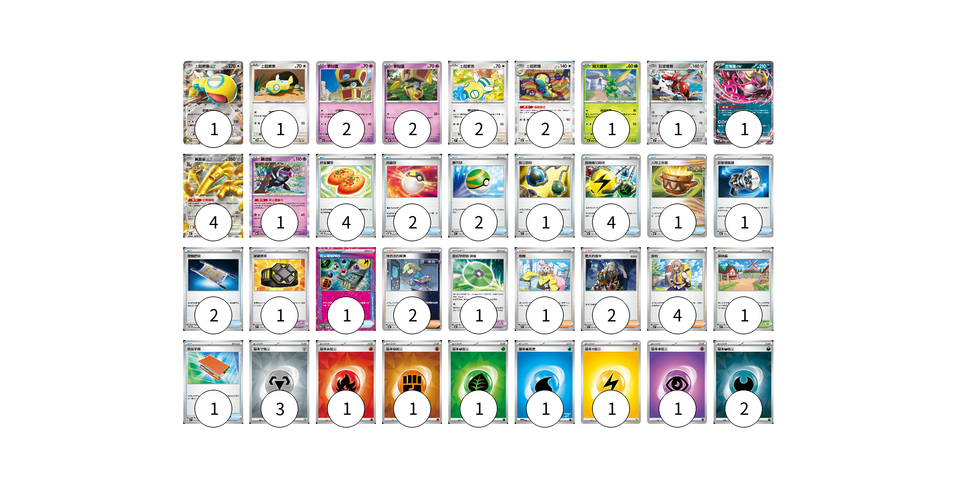 牌組構築方案 以此牌組為基礎新構築牌組 顯示卡面 顯示列表 寶可夢卡(18) 1 1 2 2 2 2 1 1 1 4 1 寶可夢道具(2) 1 1 物品卡(19) 4 2 2 1 4 1 1 2 1 1 支援者卡(9) 2 1 2 4 競技場卡(1) 1 能量卡(11) 3 1 1 1 1 1 1 2 寶可夢卡(18) 卡牌名稱 張數 卡牌名稱 張數 土龍節節ex SV9 079/100 01 土龍弟弟 SV9 078/100 01 索財靈 SV7a 024/064 02 索財靈 SV8a 073/187 02 土龍弟弟 SVM 095/175 02 土龍節節 SV8a 130/187 02 飛天螳螂 SV4a 004/190 01 巨鉗螳螂 SV4a 129/190 01 吉雉雞ex SVOD 004/020 01 賽富豪ex SV8a 117/187 04 願增猿 SV8a 075/187 01 寶可夢道具(2) 卡牌名稱 張數 卡牌名稱 張數 硬硬束帶 SVM 139/175 01 招式學習器 演進 SV8a 160/187 01 物品卡(19) 卡牌名稱 張數 卡牌名稱 張數 好友寶芬 SVOD 011/020 04 高級球 SVOD 012/020 02 巢穴球 SVM 133/175 02 能量回收 SVM 125/175 01 超級能量回收 SV8a 141/187 04 大地之容器 SV8a 143/187 01 反擊捕捉器 SV8a 139/187 01 夜間擔架 SVOM 016/021 02 能量輸送PRO SV7a 052/064 01 朋友手冊 SVK 014/042 01 支援者卡(9) 卡牌名稱 張數 卡牌名稱 張數 暗碼迷的解讀 SV8a 165/187 02 奇樹 SVK 031/042 01 老大的指令 SVK 036/042 02 派帕 SVK 035/042 04 競技場卡(1) 卡牌名稱 張數 卡牌名稱 張數 深缽鎮 SVK 039/042 01 能量卡(11) 卡牌名稱 張數 卡牌名稱 張數 基本【鋼】能量 SVOD MET 03 基本【火】能量 SVK FIR 01 基本【鬥】能量 SVK FIG 01 基本【草】能量 SVK GRA 01 基本【水】能量 SVI WAT 01 基本【雷】能量 SVTR LIG 01 基本【超】能量 SVTS PSY 01 基本【惡】能量 SVK DAR 02 以此牌組為基礎新構築牌組 牌組編碼 QkavLz-sqYSxP-NfMOOU copy 列印牌組單 牌組編碼已複製 分享至SNS