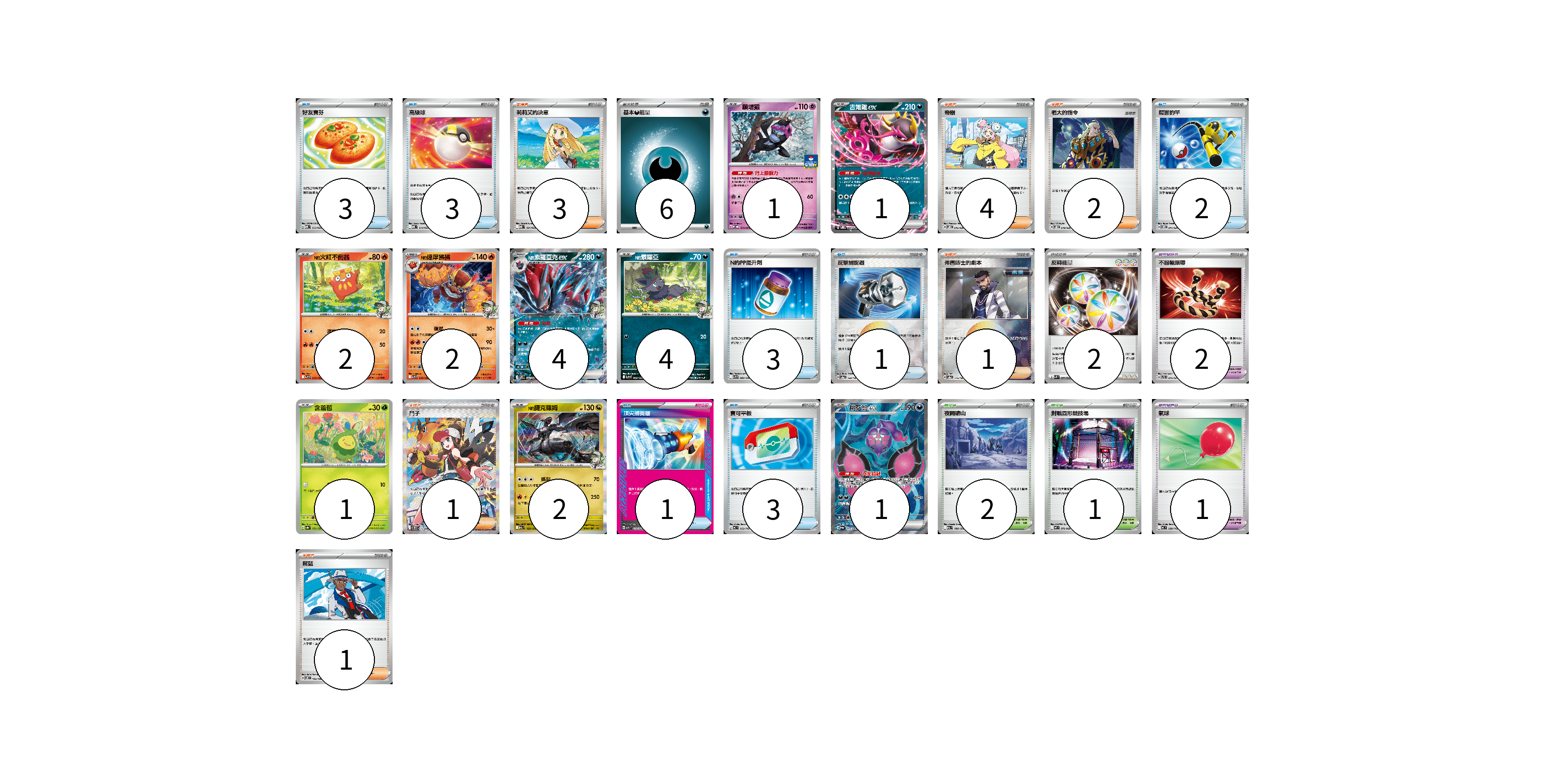 牌組構築方案 以此牌組為基礎新構築牌組 顯示卡面 顯示列表 寶可夢卡(18) 1 1 2 2 4 4 1 2 1 寶可夢道具(3) 2 1 物品卡(16) 3 3 2 3 1 1 3 支援者卡(12) 3 4 2 1 1 1 競技場卡(3) 2 1 能量卡(8) 6 2 寶可夢卡(18) 卡牌名稱 張數 卡牌名稱 張數 願增猿 M-P 014/M-P 01 吉雉雞ex SVOD 004/020 01 N的火紅不倒翁 SV9 015/100 02 N的達摩狒狒 SV9 016/100 02 N的索羅亞克ex SV9 061/100 04 N的索羅亞 SV9 060/100 04 含羞苞 SV8a 001/187 01 N的捷克羅姆 M2a 129/193 02 桃歹郎ex SV6a 082/064 01 寶可夢道具(3) 卡牌名稱 張數 卡牌名稱 張數 不服輸頭帶 SVTL 016/021 02 氣球 MC 688/742 01 物品卡(16) 卡牌名稱 張數 卡牌名稱 張數 好友寶芬 MBD 013/022 03 高級球 MBD 014/022 03 厲害釣竿 SVOM 011/021 02 N的PP提升劑 SV9 089/100 03 反擊捕捉器 SV8a 139/187 01 頂尖捕捉器 MBG 014/022 01 寶可平板 MC 662/742 03 支援者卡(12) 卡牌名稱 張數 卡牌名稱 張數 莉莉艾的決意 MBD 021/022 03 奇樹 SVOD 016/020 04 老大的指令 SVOD 019/020 02 弗圖博士的劇本 SV8a 175/187 01 鬥子 SV11W 173/086 01 席藍 SV8 102/106 01 競技場卡(3) 卡牌名稱 張數 卡牌名稱 張數 夜間礦山 M2a 188/193 02 對戰圓形競技場 M2 079/080 01 能量卡(8) 卡牌名稱 張數 卡牌名稱 張數 基本【惡】能量 MBG DAR 06 反轉能量 SVK 041/042 02 以此牌組為基礎新構築牌組 牌組編碼 QluDOF-SPiAGQ-TrXCJw copy 列印牌組單 牌組編碼已複製 分享至SNS