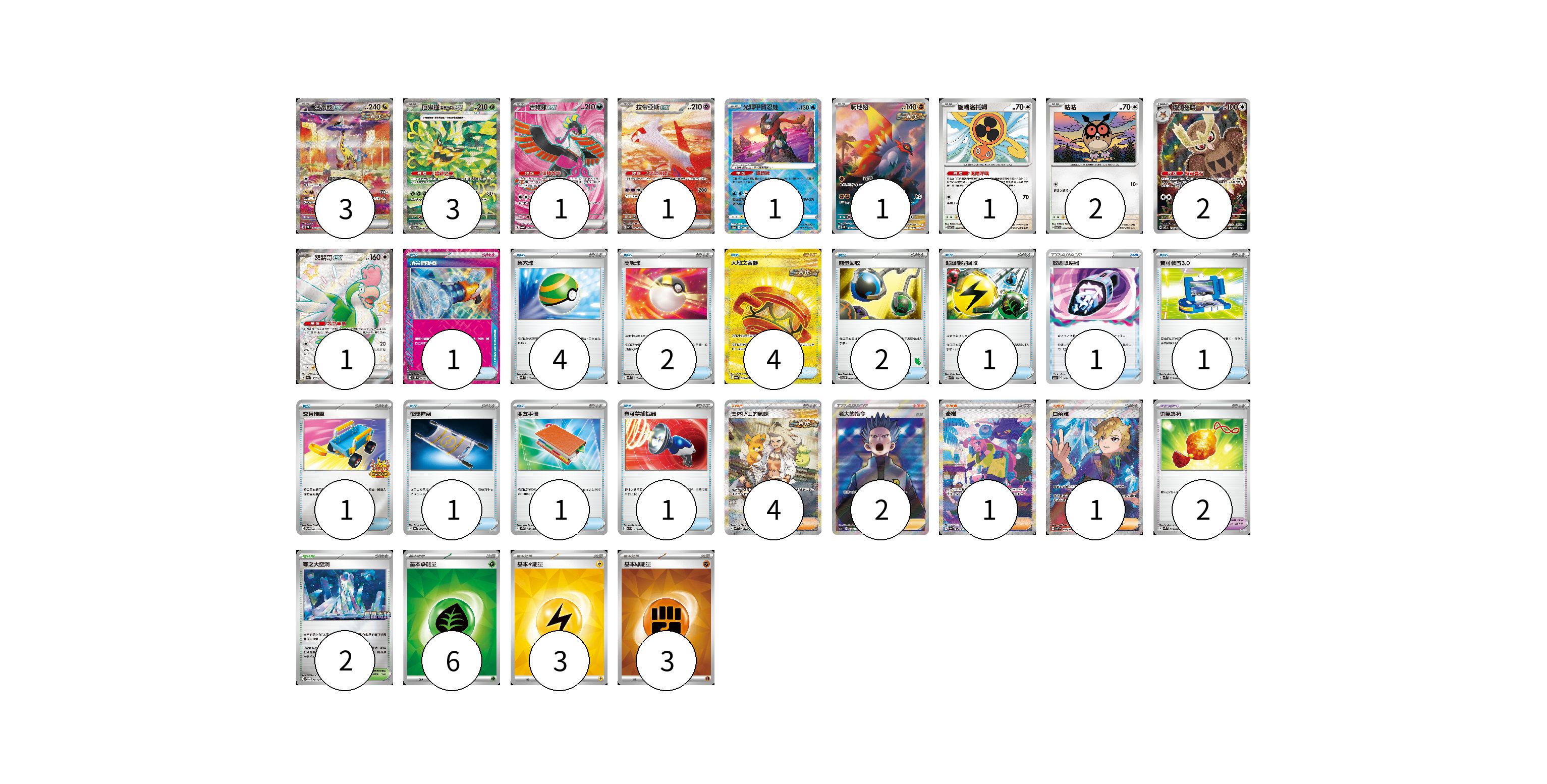 牌組構築方案 以此牌組為基礎新構築牌組 顯示卡面 顯示列表 寶可夢卡(16) 3 3 1 1 1 1 1 2 2 1 寶可夢道具(2) 2 物品卡(20) 1 4 2 4 2 1 1 1 1 1 1 1 支援者卡(8) 4 2 1 1 競技場卡(2) 2 能量卡(12) 6 3 3 寶可夢卡(16) 卡牌名稱 張數 卡牌名稱 張數 猛雷鼓ex SV5K 095/071 03 厄鬼椪 碧草面具ex SV6 125/101 03 吉雉雞ex SV6a 081/064 01 拉帝亞斯ex SV7a 087/064 01 光輝甲賀忍蛙 S12a 033/172 01 爬地翅 SV4K 074/066 01 旋轉洛托姆 SV7 080/102 01 咕咕 SV7 076/102 02 貓頭夜鷹 SV7 114/102 02 怒鸚哥ex SV4a 337/190 01 寶可夢道具(2) 卡牌名稱 張數 卡牌名稱 張數 勇氣護符 SVK 024/042 02 物品卡(20) 卡牌名稱 張數 卡牌名稱 張數 頂尖捕捉器 SV5M 062/071 01 巢穴球 SVK 016/042 04 高級球 SVK 018/042 02 大地之容器 SV6a 093/064 04 能量回收 SVI 049/066 02 超級能量回收 SVK 010/042 01 放逐吸塵器 S12a 144/172 01 寶可裝置3.0 SVK 021/042 01 交替推車 SV-P 082/SV-P 01 夜間擔架 SV6a 056/064 01 朋友手冊 SV1S 069/078 01 寶可夢捕捉器 SVC 017/021 01 支援者卡(8) 卡牌名稱 張數 卡牌名稱 張數 奧琳博士的氣魄 SV4K 091/066 04 老大的指令(赤日) S12a 250/172 02 奇樹 SV4a 350/190 01 白蕾雅 SV7 126/102 01 競技場卡(2) 卡牌名稱 張數 卡牌名稱 張數 零之大空洞 SV-P 151/SV-P 02 能量卡(12) 卡牌名稱 張數 卡牌名稱 張數 基本【草】能量 SVK GRA 06 基本【雷】能量 SVK LIG 03 基本【鬥】能量 SVK FIG 03 以此牌組為基礎新構築牌組 牌組編碼 QnikiD-cnTgWw-BjkIKI copy 列印牌組單 牌組編碼已複製 分享至SNS