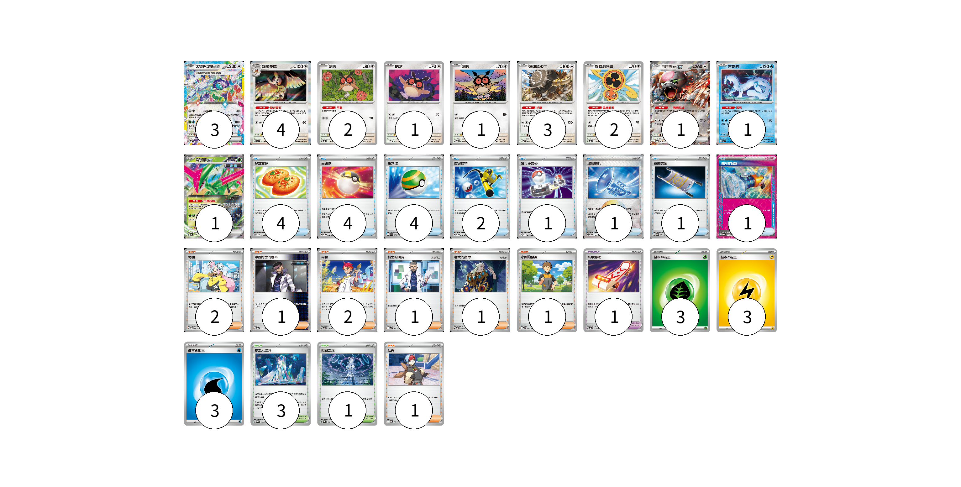 牌組構築方案 以此牌組為基礎新構築牌組 顯示卡面 顯示列表 寶可夢卡(19) 3 4 2 1 1 3 2 1 1 1 寶可夢道具(1) 1 物品卡(18) 4 4 4 2 1 1 1 1 支援者卡(9) 2 1 2 1 1 1 1 競技場卡(4) 3 1 能量卡(9) 3 3 3 寶可夢卡(19) 卡牌名稱 張數 卡牌名稱 張數 太樂巴戈斯ex SV8a 136/187 03 貓頭夜鷹 SV7 077/102 04 咕咕 SV8a 127/187 02 咕咕 SV5K 054/071 01 咕咕 SV7 076/102 01 爆炸頭水牛 SV7 081/102 03 旋轉洛托姆 SV8a 131/187 02 月月熊 赫月 ex SV5a 052/066 01 古劍豹 SV8 032/106 01 鐵斑葉ex SV8a 016/187 01 寶可夢道具(1) 卡牌名稱 張數 卡牌名稱 張數 緊急滑板 SV8a 153/187 01 物品卡(18) 卡牌名稱 張數 卡牌名稱 張數 好友寶芬 SVOD 011/020 04 高級球 SVOD 012/020 04 巢穴球 SVM 133/175 04 厲害釣竿 SVOM 011/021 02 寶可夢交替 SVOD 014/020 01 玻璃喇叭 SV8a 140/187 01 夜間擔架 SV8a 151/187 01 頂尖捕捉器 SV8a 148/187 01 支援者卡(9) 卡牌名稱 張數 卡牌名稱 張數 奇樹 SVOD 016/020 02 弗圖博士的劇本 SV8a 175/187 01 赤松 SVK 027/042 02 博士的研究 SVK 033/042 01 老大的指令 SVK 036/042 01 小剛的發掘 SV9 096/100 01 牡丹 SV4a 182/190 01 競技場卡(4) 卡牌名稱 張數 卡牌名稱 張數 零之大空洞 SV8a 182/187 03 阻礙之塔 SV8a 181/187 01 能量卡(9) 卡牌名稱 張數 卡牌名稱 張數 基本【草】能量 SVTM GRA 03 基本【雷】能量 SVTR LIG 03 基本【水】能量 SVF WAT 03 以此牌組為基礎新構築牌組 牌組編碼 QpSssQ-ZWGjYs-ZDVyDM copy 列印牌組單 牌組編碼已複製 分享至SNS