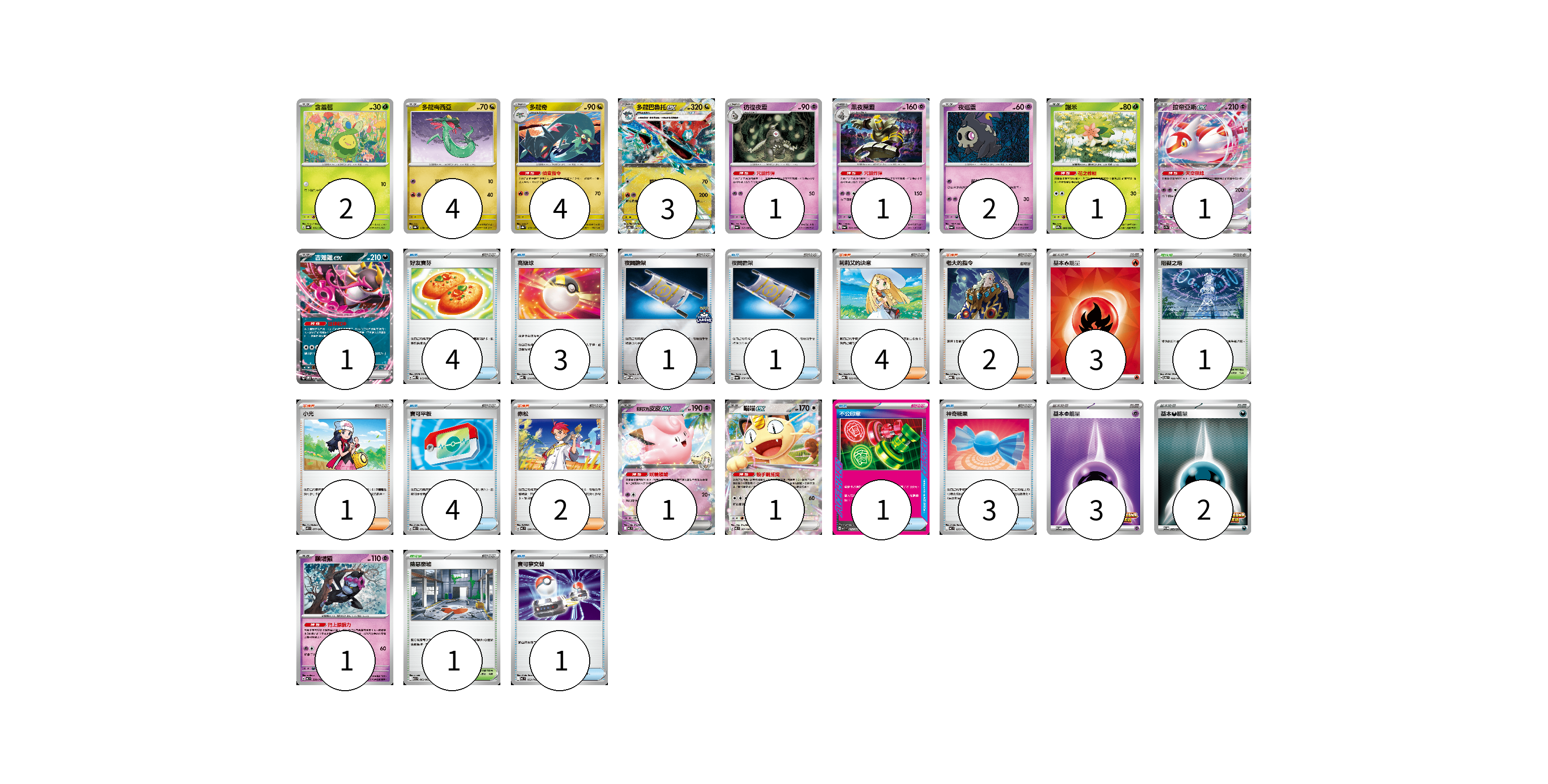 牌組構築方案 以此牌組為基礎新構築牌組 顯示卡面 顯示列表 寶可夢卡(23) 2 4 4 3 1 1 2 1 1 1 1 1 1 物品卡(18) 4 3 1 1 4 1 3 1 支援者卡(9) 4 2 1 2 競技場卡(2) 1 1 能量卡(8) 3 3 2 寶可夢卡(23) 卡牌名稱 張數 卡牌名稱 張數 含羞苞 SV8a 001/187 02 多龍梅西亞 SV8a 118/187 04 多龍奇 SV8a 119/187 04 多龍巴魯托ex SV6 081/101 03 彷徨夜靈 SV6a 019/064 01 黑夜魔靈 SV6a 020/064 01 夜巡靈 SV6a 018/064 02 謝米 SV9a 006/063 01 拉帝亞斯ex SV7a 019/064 01 吉雉雞ex SVOM 009/021 01 莉莉艾的皮皮ex MC 287/742 01 喵喵ex M3 061/080 01 願增猿 MC 358/742 01 物品卡(18) 卡牌名稱 張數 卡牌名稱 張數 好友寶芬 MBD 013/022 04 高級球 MBD 014/022 03 夜間擔架 SV-P 204/SV-P 01 夜間擔架 SV6a 056/064 01 寶可平板 M3 070/080 04 不公印章 MBD 011/022 01 神奇糖果 MC 655/742 03 寶可夢交替 MC 663/742 01 支援者卡(9) 卡牌名稱 張數 卡牌名稱 張數 莉莉艾的決意 MBG 022/022 04 老大的指令 MBG 021/022 02 小光 M2 077/080 01 赤松 MC 696/742 02 競技場卡(2) 卡牌名稱 張數 卡牌名稱 張數 阻礙之塔 SV6 100/101 01 險惡廢墟 M1L 063/063 01 能量卡(8) 卡牌名稱 張數 卡牌名稱 張數 基本【火】能量 SVQL FIR 03 基本【超】能量 SV-P 261/SV-P 03 基本【惡】能量 SV-P 263/SV-P 02 以此牌組為基礎新構築牌組 牌組編碼 QpUDGc-rhEjCv-SWYrQc copy 列印牌組單 牌組編碼已複製 分享至SNS