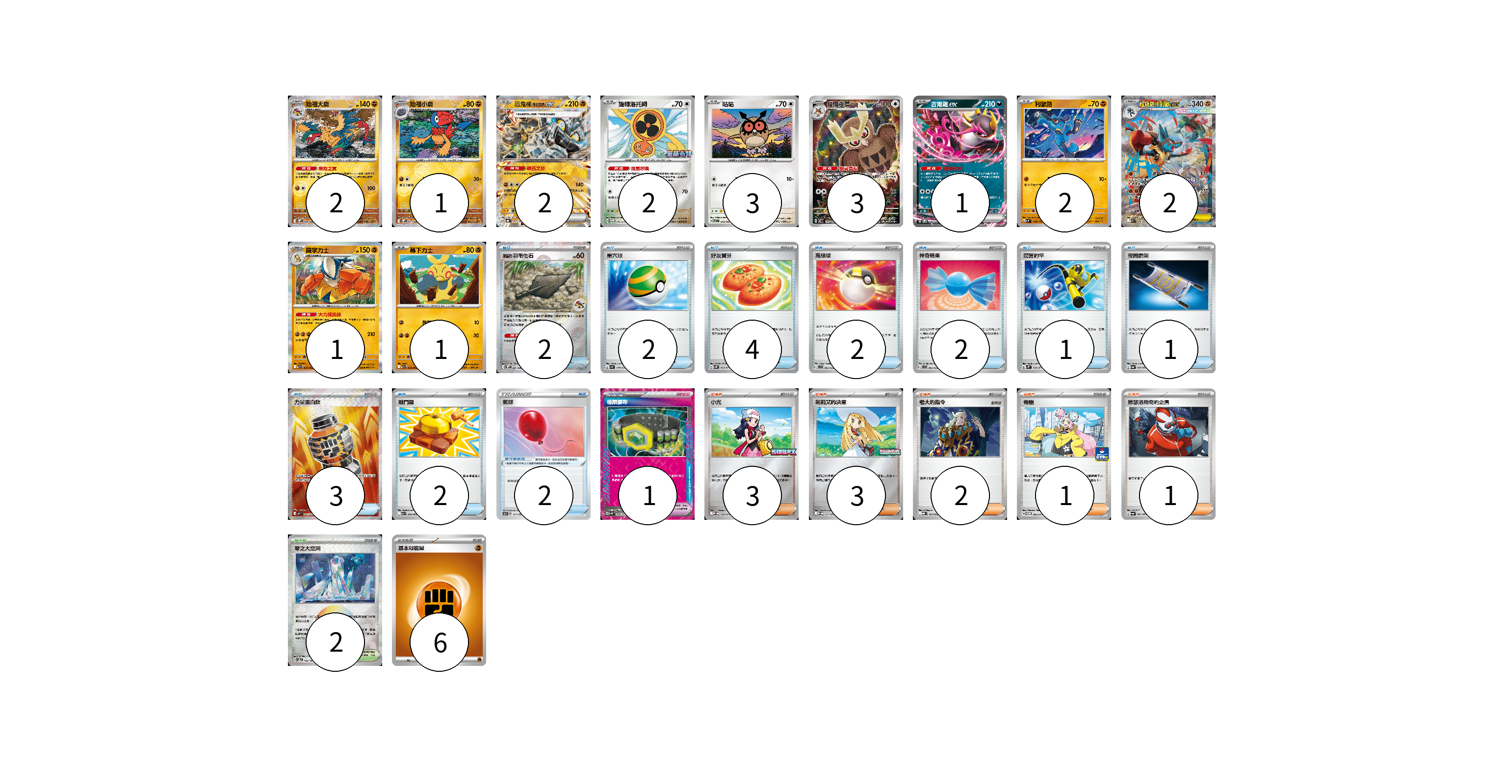 牌組構築方案 以此牌組為基礎新構築牌組 顯示卡面 顯示列表 寶可夢卡(20) 2 1 2 2 3 3 1 2 2 1 1 寶可夢道具(3) 2 1 物品卡(19) 2 2 4 2 2 1 1 3 2 支援者卡(10) 3 3 2 1 1 競技場卡(2) 2 能量卡(6) 6 寶可夢卡(20) 卡牌名稱 張數 卡牌名稱 張數 始祖大鳥 SV11W 048/086 02 始祖小鳥 SV11W 047/086 01 厄鬼椪 礎石面具ex SV8a 091/187 02 旋轉洛托姆 SV-P 146/SV-P 02 咕咕 SV7 076/102 03 貓頭夜鷹 SV7 114/102 03 吉雉雞ex SVOM 009/021 01 利歐路 SVM 064/175 02 超級路卡利歐ex M1L 088/063 02 鐵掌力士 M1L 025/063 01 幕下力士 M1L 024/063 01 寶可夢道具(3) 卡牌名稱 張數 卡牌名稱 張數 氣球 S4a 171/190 02 極限腰帶 SV5K 066/071 01 物品卡(19) 卡牌名稱 張數 卡牌名稱 張數 陳舊的羽毛化石 SV11W 081/086 02 巢穴球 SV1S 070/078 02 好友寶芬 SV5K 063/071 04 高級球 SVB 002/028 02 神奇糖果 SVB 003/028 02 厲害釣竿 SV2P 066/071 01 夜間擔架 SV6a 056/064 01 力量蛋白飲 M1L 081/063 03 戰鬥鑼 M1L 059/063 02 支援者卡(10) 卡牌名稱 張數 卡牌名稱 張數 小光 M-P 028/M-P 03 莉莉艾的決意 M-P 011/M-P 03 老大的指令 MBG 021/022 02 奇樹 SV-P 106/SV-P 01 庫瑟洛斯奇的企圖 SV6a 062/064 01 競技場卡(2) 卡牌名稱 張數 卡牌名稱 張數 零之大空洞 SV8a 182/187 02 能量卡(6) 卡牌名稱 張數 卡牌名稱 張數 基本【鬥】能量 SVAM FIG 06 以此牌組為基礎新構築牌組 牌組編碼 QqRqhy-BHdCcr-aYAQbC copy 列印牌組單 牌組編碼已複製 分享至SNS