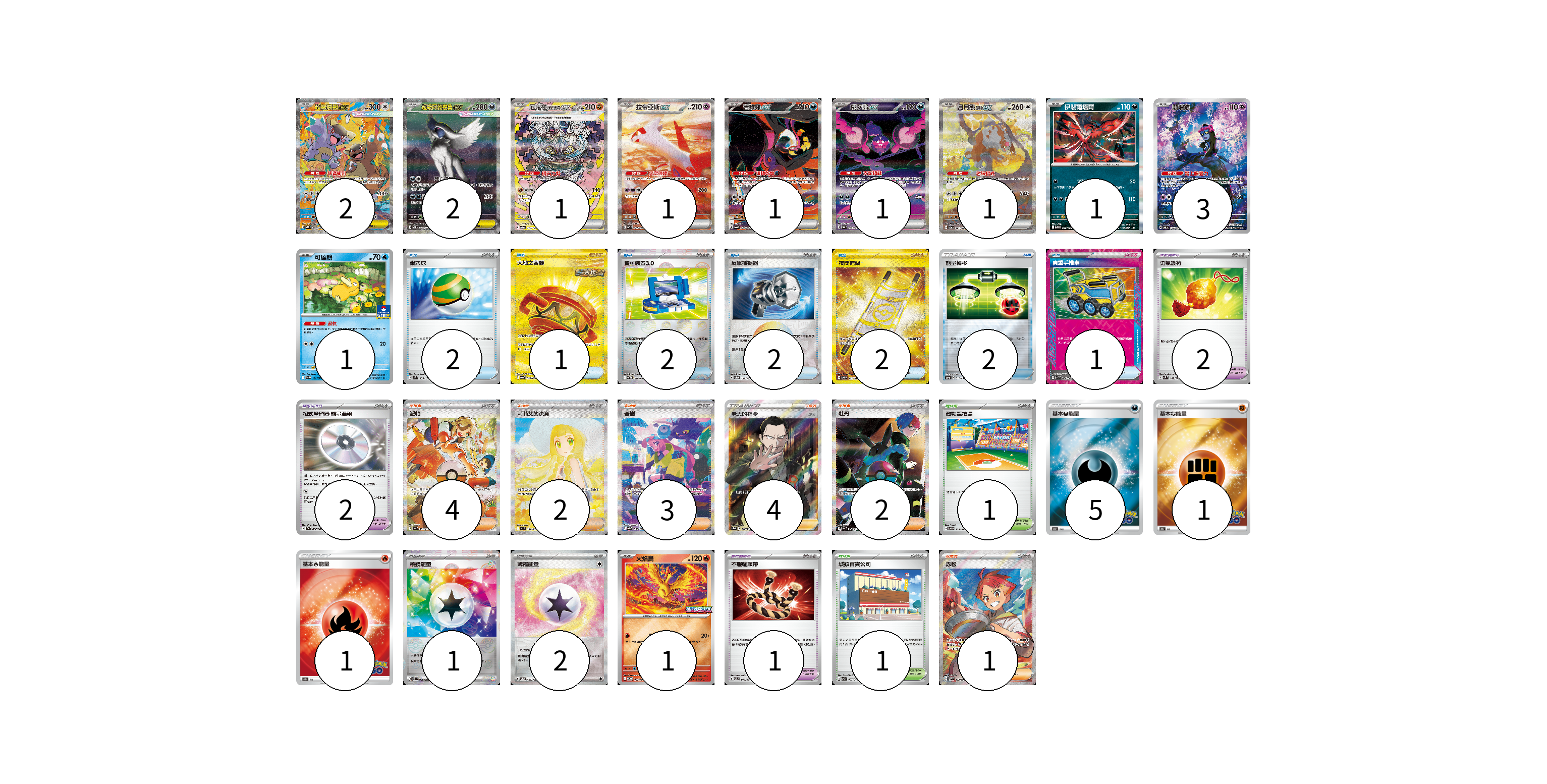 牌組構築方案 以此牌組為基礎新構築牌組 顯示卡面 顯示列表 寶可夢卡(15) 2 2 1 1 1 1 1 1 3 1 1 寶可夢道具(5) 2 2 1 物品卡(12) 2 1 2 2 2 2 1 支援者卡(16) 4 2 3 4 2 1 競技場卡(2) 1 1 能量卡(10) 5 1 1 1 2 寶可夢卡(15) 卡牌名稱 張數 卡牌名稱 張數 超級袋獸ex M1S 089/063 02 超級阿勃梭魯ex M1L 089/063 02 厄鬼椪 礎石面具ex SV8a 216/187 01 拉帝亞斯ex SV7a 087/064 01 吉雉雞ex SV6a 089/064 01 桃歹郎ex SV6a 090/064 01 月月熊 赫月 ex SV5a 091/066 01 伊裴爾塔爾 M1L 040/063 01 願增猿 SV6 107/101 03 可達鴨 SV-P 220/SV-P 01 火焰鳥 M-P 022/M-P 01 寶可夢道具(5) 卡牌名稱 張數 卡牌名稱 張數 勇氣護符 SVM 142/175 02 招式學習器 能量渦輪 SV3a 056/062 02 不服輸頭帶 SVTL 016/021 01 物品卡(12) 卡牌名稱 張數 卡牌名稱 張數 巢穴球 SVM 133/175 02 大地之容器 SV6a 093/064 01 寶可裝置3.0 SV11B 081/086 02 反擊捕捉器 SV8a 139/187 02 夜間擔架 SV8 137/106 02 能量轉移 SO 017/030 02 貴重手推車 SVK 020/042 01 支援者卡(16) 卡牌名稱 張數 卡牌名稱 張數 派帕 SV4a 353/190 04 莉莉艾的決意 M1L 091/063 02 奇樹 SV4a 350/190 03 老大的指令(坂木) SC1b 170/153 04 牡丹 SV4a 354/190 02 赤松 SV7 123/102 01 競技場卡(2) 卡牌名稱 張數 卡牌名稱 張數 激動競技場 SV8 105/106 01 城鎮百貨公司 SVK 037/042 01 能量卡(10) 卡牌名稱 張數 卡牌名稱 張數 基本惡能量 S10b DAR 05 基本鬥能量 S10b FIG 01 基本火能量 S10b FIR 01 稜鏡能量 SV11B 086/086 01 薄霧能量 SV8a 186/187 02 以此牌組為基礎新構築牌組 牌組編碼 Qrerwg-JBohNV-UIYUpz copy 列印牌組單 牌組編碼已複製 分享至SNS