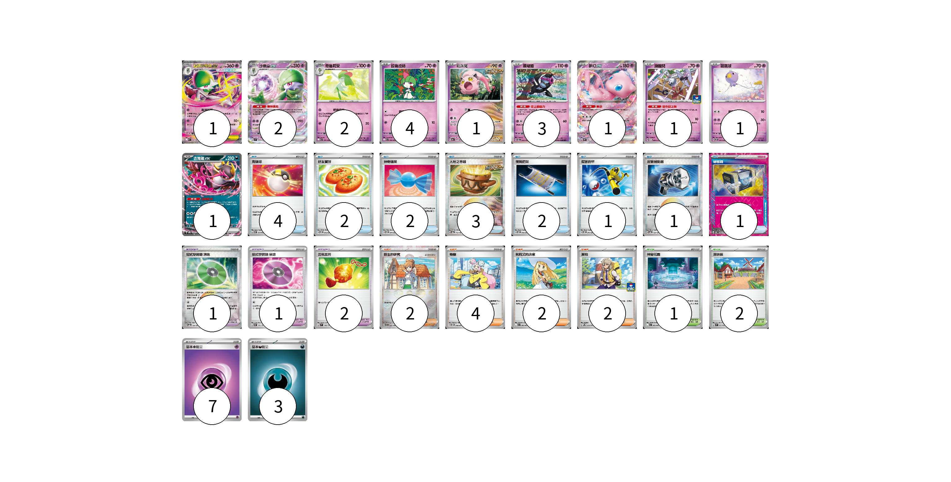 牌組構築方案 以此牌組為基礎新構築牌組 顯示卡面 顯示列表 寶可夢卡(17) 1 2 2 4 1 3 1 1 1 1 寶可夢道具(4) 1 1 2 物品卡(16) 4 2 2 3 2 1 1 1 支援者卡(10) 2 4 2 2 競技場卡(3) 1 2 能量卡(10) 7 3 寶可夢卡(17) 卡牌名稱 張數 卡牌名稱 張數 超級沙奈朵ex M1S 042/063 01 沙奈朵ex SV1S 028/078 02 奇魯莉安 M1S 041/063 02 拉魯拉絲 M1S 040/063 04 吼叫尾 SV4K 032/066 01 願增猿 SV6 055/101 03 夢幻ex SV2a 151/165 01 鑰圈兒 SV-P 089/SV-P 01 飄飄球 SVTS 005/022 01 吉雉雞ex SVOM 009/021 01 寶可夢道具(4) 卡牌名稱 張數 卡牌名稱 張數 招式學習器 演進 SV8a 160/187 01 招式學習器 衰退 SV8a 161/187 01 勇氣護符 SVM 142/175 02 物品卡(16) 卡牌名稱 張數 卡牌名稱 張數 高級球 SVQP 015/023 04 好友寶芬 SVOM 012/021 02 神奇糖果 SVOM 014/021 02 大地之容器 SV8a 143/187 03 夜間擔架 SVOM 016/021 02 厲害釣竿 SVOM 011/021 01 反擊捕捉器 SV8a 139/187 01 秘密箱 SV6 092/101 01 支援者卡(10) 卡牌名稱 張數 卡牌名稱 張數 博士的研究 SV11B 084/086 02 奇樹 SVOM 018/021 04 莉莉艾的決意 M1L 062/063 02 派帕 SV-P 213/SV-P 02 競技場卡(3) 卡牌名稱 張數 卡牌名稱 張數 神秘花園 M1S 063/063 01 深缽鎮 SVK 039/042 02 能量卡(10) 卡牌名稱 張數 卡牌名稱 張數 基本超能量 sv-p PSY 07 基本惡能量 sv-p DAR 03 以此牌組為基礎新構築牌組 牌組編碼 QuqNKk-jCOkZf-uusbpJ copy 列印牌組單 牌組編碼已複製 分享至SNS