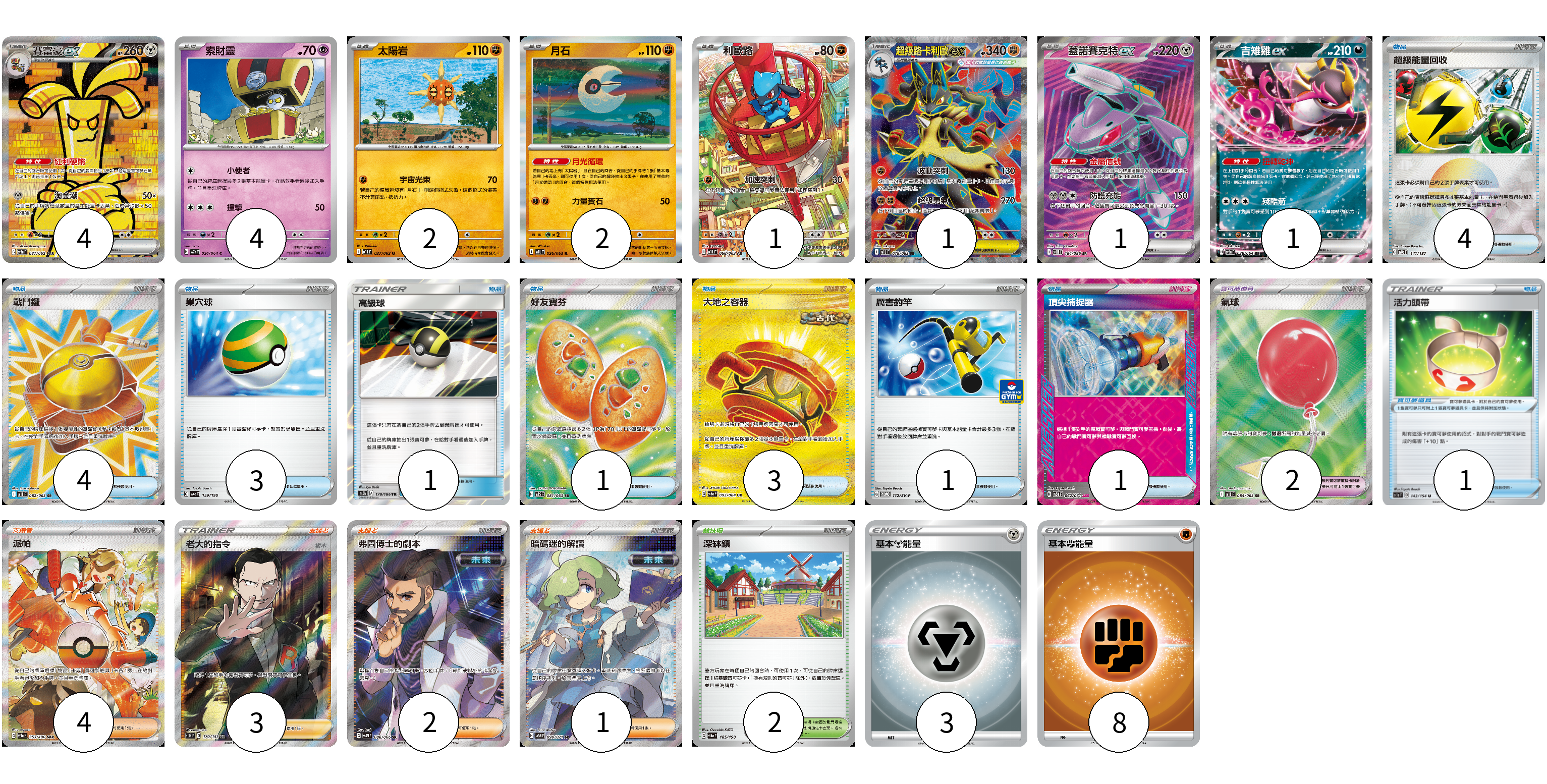 牌組構築方案 以此牌組為基礎新構築牌組 顯示卡面 顯示列表 寶可夢卡(16) 4 4 2 2 1 1 1 1 寶可夢道具(3) 2 1 物品卡(18) 4 4 3 1 1 3 1 1 支援者卡(10) 4 3 2 1 競技場卡(2) 2 能量卡(11) 3 8 寶可夢卡(16) 卡牌名稱 張數 卡牌名稱 張數 賽富豪ex SV3a 087/062 04 索財靈 SV7a 024/064 04 太陽岩 M1L 027/063 02 月石 M1L 026/063 02 利歐路 M1L 068/063 01 超級路卡利歐ex M1L 078/063 01 蓋諾賽克特ex SV11B 164/086 01 吉雉雞ex SV6a 038/064 01 寶可夢道具(3) 卡牌名稱 張數 卡牌名稱 張數 氣球 M1L 084/063 02 活力頭帶 SC1a 143/154 01 物品卡(18) 卡牌名稱 張數 卡牌名稱 張數 超級能量回收 SV8a 141/187 04 戰鬥鑼 M1L 082/063 04 巢穴球 SV4a 159/190 03 高級球 AS5b 178/186 01 好友寶芬 M1S 081/063 01 大地之容器 SV6a 093/064 03 厲害釣竿 SV-P 112/SV-P 01 頂尖捕捉器 SV5M 062/071 01 支援者卡(10) 卡牌名稱 張數 卡牌名稱 張數 派帕 SV4a 353/190 04 老大的指令(坂木) SC1b 170/153 03 弗圖博士的劇本 SV4M 086/066 02 暗碼迷的解讀 SV5M 090/071 01 競技場卡(2) 卡牌名稱 張數 卡牌名稱 張數 深缽鎮 SV4a 185/190 02 能量卡(11) 卡牌名稱 張數 卡牌名稱 張數 基本【鋼】能量 SI MET 03 基本鬥能量 SLL FIG 08 以此牌組為基礎新構築牌組 牌組編碼 QvPbxA-orjHKd-BVDTQt copy 列印牌組單 牌組編碼已複製 分享至SNS