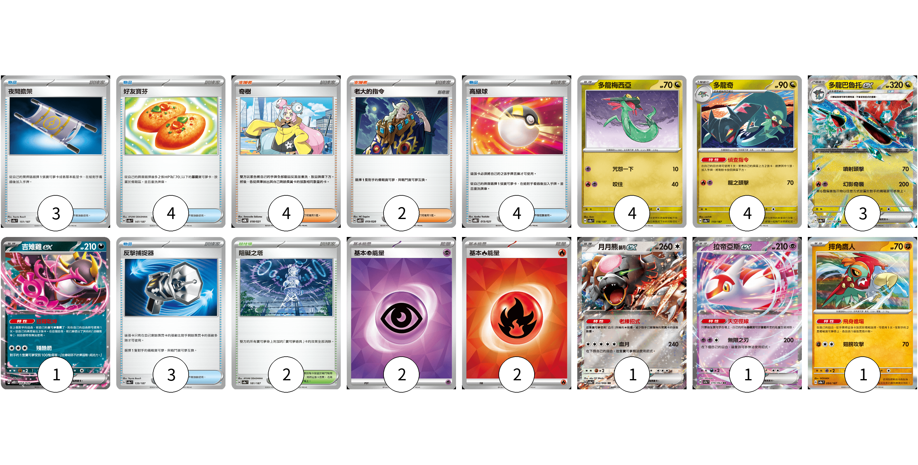牌組構築方案 以此牌組為基礎新構築牌組 顯示卡面 顯示列表 寶可夢卡(15) 4 4 3 1 1 1 1 物品卡(14) 3 4 4 3 支援者卡(6) 4 2 競技場卡(2) 2 能量卡(4) 2 2 寶可夢卡(15) 卡牌名稱 張數 卡牌名稱 張數 多龍梅西亞 SV8a 118/187 04 多龍奇 SV8a 119/187 04 多龍巴魯托ex SV8a 120/187 03 吉雉雞ex SVOD 004/020 01 月月熊 赫月 ex SV5a 052/066 01 拉帝亞斯ex SV7a 019/064 01 摔角鷹人 SV8a 084/187 01 物品卡(14) 卡牌名稱 張數 卡牌名稱 張數 夜間擔架 SV8a 151/187 03 好友寶芬 SV8a 147/187 04 高級球 SVOM 013/021 04 反擊捕捉器 SV8a 139/187 03 支援者卡(6) 卡牌名稱 張數 卡牌名稱 張數 奇樹 SVOM 018/021 04 老大的指令 SVOD 019/020 02 競技場卡(2) 卡牌名稱 張數 卡牌名稱 張數 阻礙之塔 SV8a 181/187 02 能量卡(4) 卡牌名稱 張數 卡牌名稱 張數 基本【超】能量 SVOD PSY 02 基本【火】能量 SVK FIR 02 以此牌組為基礎新構築牌組 牌組編碼 QvfbiH-OXqAUz-ZStxFp copy 列印牌組單 牌組編碼已複製 分享至SNS