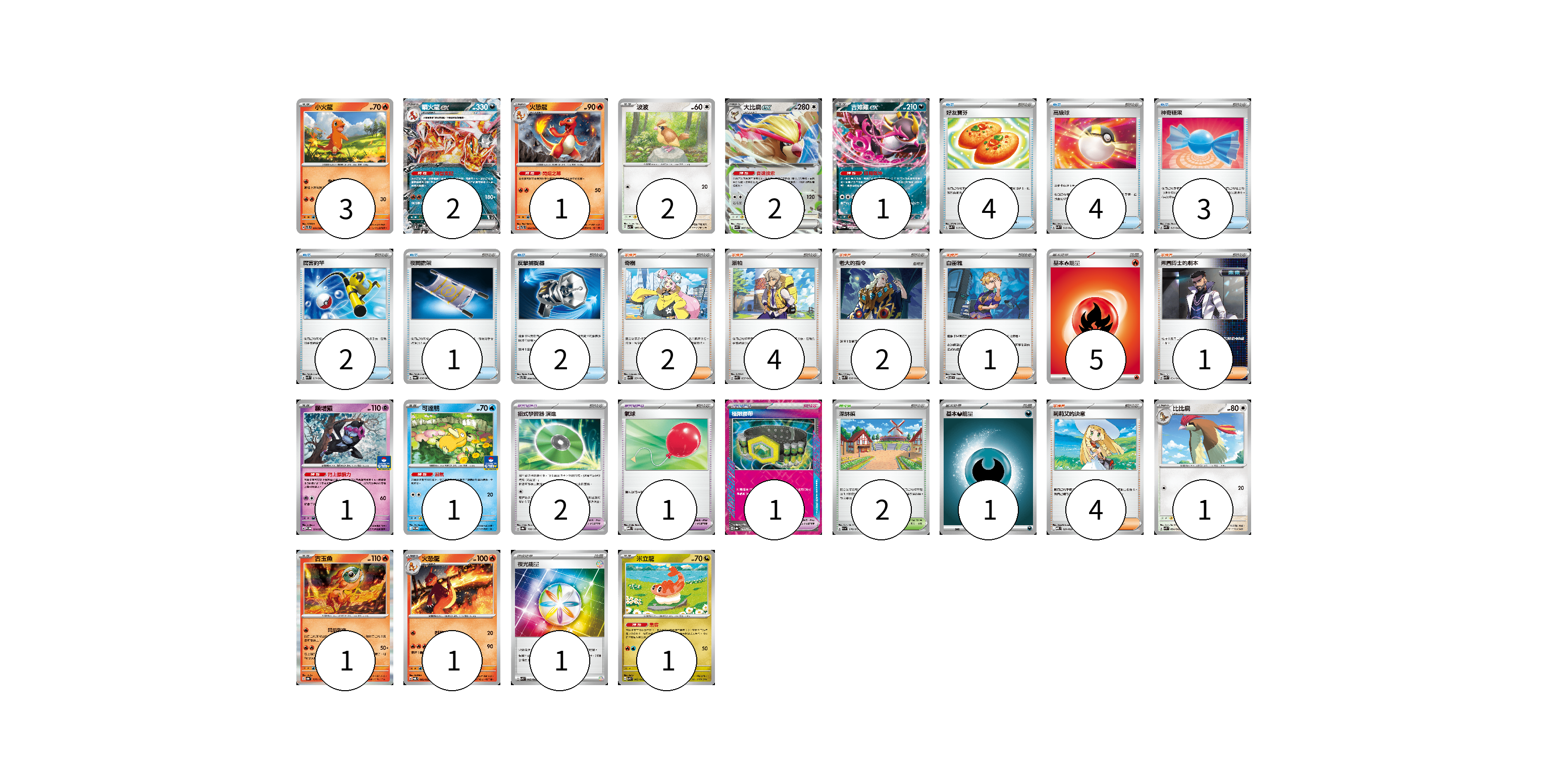 牌組構築方案 以此牌組為基礎新構築牌組 顯示卡面 顯示列表 寶可夢卡(17) 3 2 1 2 2 1 1 1 1 1 1 1 寶可夢道具(4) 2 1 1 物品卡(16) 4 4 3 2 1 2 支援者卡(14) 2 4 2 1 1 4 競技場卡(2) 2 能量卡(7) 5 1 1 寶可夢卡(17) 卡牌名稱 張數 卡牌名稱 張數 小火龍 SVTL 001/021 03 噴火龍ex SVTL 006/021 02 火恐龍 SVTL 002/021 01 波波 SV3 087/108 02 大比鳥ex SVK 005/042 02 吉雉雞ex SV6a 038/064 01 願增猿 M-P 014/M-P 01 可達鴨 SV-P 220/SV-P 01 比比鳥 SVK 004/042 01 古玉魚 SV8a 025/187 01 火恐龍 SVQL 002/022 01 米立龍 SVK 002/042 01 寶可夢道具(4) 卡牌名稱 張數 卡牌名稱 張數 招式學習器 演進 SV8a 160/187 02 氣球 MBD 018/022 01 極限腰帶 SV8a 159/187 01 物品卡(16) 卡牌名稱 張數 卡牌名稱 張數 好友寶芬 SVK 015/042 04 高級球 SVK 018/042 04 神奇糖果 SVK 019/042 03 厲害釣竿 SVK 011/042 02 夜間擔架 SV6a 056/064 01 反擊捕捉器 SVTS 009/022 02 支援者卡(14) 卡牌名稱 張數 卡牌名稱 張數 奇樹 SVK 031/042 02 派帕 SVK 035/042 04 老大的指令 SVK 036/042 02 白蕾雅 SV7 100/102 01 弗圖博士的劇本 SVK 034/042 01 莉莉艾的決意 MBD 021/022 04 競技場卡(2) 卡牌名稱 張數 卡牌名稱 張數 深缽鎮 SV1a 070/073 02 能量卡(7) 卡牌名稱 張數 卡牌名稱 張數 基本火能量 sv-p FIR 05 基本【惡】能量 MBG DAR 01 夜光能量 SVK 042/042 01 以此牌組為基礎新構築牌組 牌組編碼 QwsAzY-dFtiJk-shjDEu copy 列印牌組單 牌組編碼已複製 分享至SNS