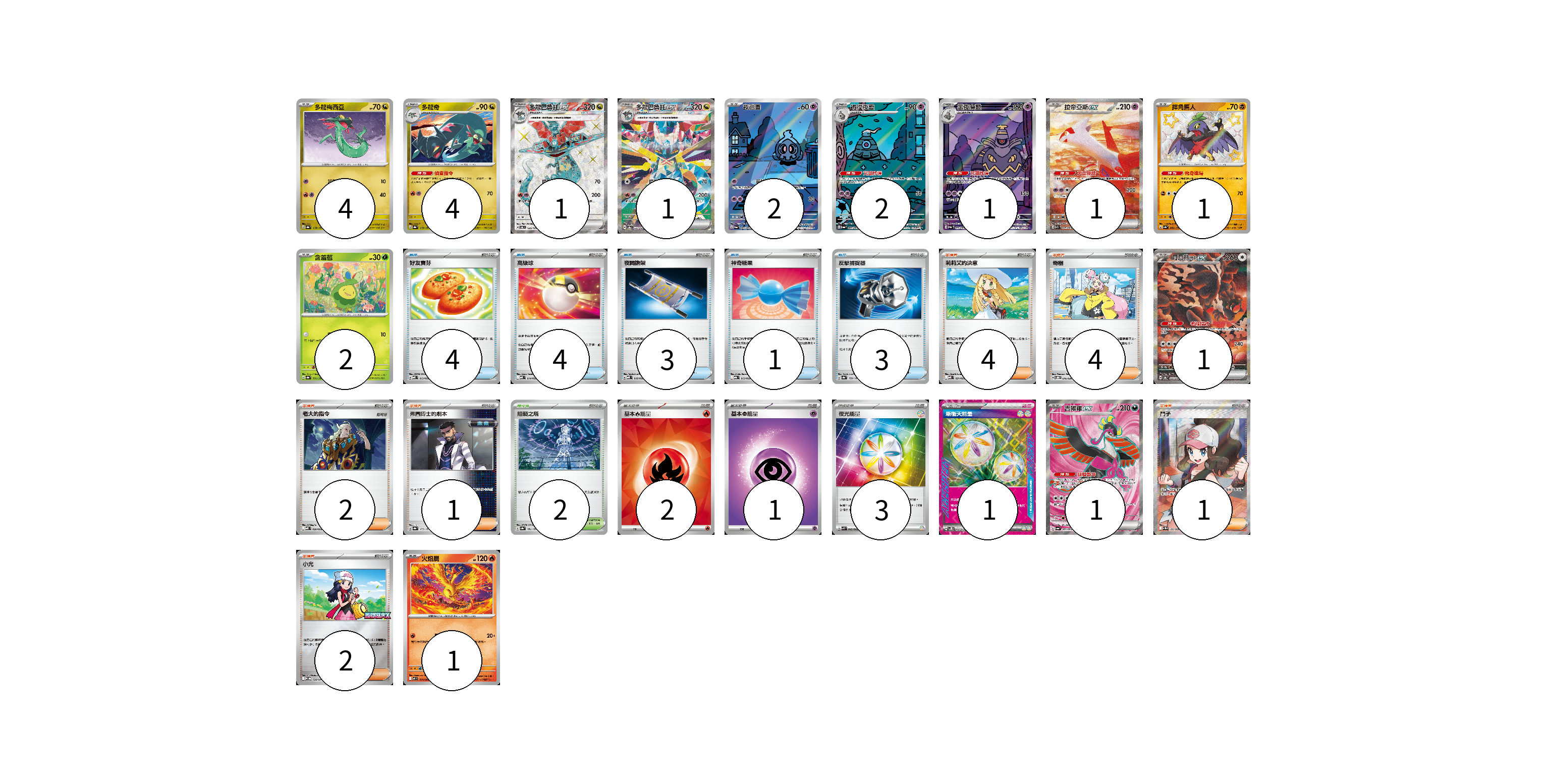 牌組構築方案 以此牌組為基礎新構築牌組 顯示卡面 顯示列表 寶可夢卡(22) 4 4 1 1 2 2 1 1 1 2 1 1 1 物品卡(15) 4 4 3 1 3 支援者卡(14) 4 4 2 1 1 2 競技場卡(2) 2 能量卡(7) 2 1 3 1 寶可夢卡(22) 卡牌名稱 張數 卡牌名稱 張數 多龍梅西亞 SV8a 118/187 04 多龍奇 SV8a 119/187 04 多龍巴魯托ex SV6 120/101 01 多龍巴魯托ex SV8a 221/187 01 夜巡靈 SV6a 068/064 02 彷徨夜靈 SV6a 069/064 02 黑夜魔靈 SV6a 070/064 01 拉帝亞斯ex SV7a 087/064 01 摔角鷹人 SV4a 282/190 01 含羞苞 SV8a 001/187 02 月月熊 赫月ex SV8a 225/187 01 吉雉雞ex SV6a 081/064 01 火焰鳥 M2 014/080 01 物品卡(15) 卡牌名稱 張數 卡牌名稱 張數 好友寶芬 MBD 013/022 04 高級球 MBD 014/022 04 夜間擔架 MBD 016/022 03 神奇糖果 MBG 013/022 01 反擊捕捉器 SV8a 139/187 03 支援者卡(14) 卡牌名稱 張數 卡牌名稱 張數 莉莉艾的決意 MBD 021/022 04 奇樹 SVOD 016/020 04 老大的指令 MBD 020/022 02 弗圖博士的劇本 SV8a 175/187 01 鬥子 SV11W 166/086 01 小光 M-P 028/M-P 02 競技場卡(2) 卡牌名稱 張數 卡牌名稱 張數 阻礙之塔 SV8a 181/187 02 能量卡(7) 卡牌名稱 張數 卡牌名稱 張數 基本【火】能量 SVQL FIR 02 基本【超】能量 MBD PSY 01 夜光能量 SVK 042/042 03 新衝天能量 SV5K 071/071 01 以此牌組為基礎新構築牌組 牌組編碼 QzApdX-CriVIi-dPBiiG copy 列印牌組單 牌組編碼已複製 分享至SNS