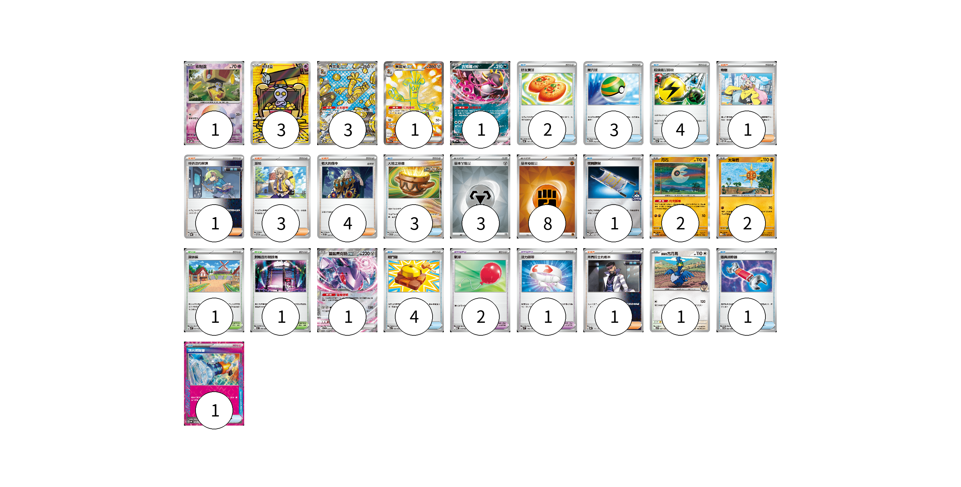 牌組構築方案 以此牌組為基礎新構築牌組 顯示卡面 顯示列表 寶可夢卡(15) 1 3 3 1 1 2 2 1 1 寶可夢道具(3) 2 1 物品卡(19) 2 3 4 3 1 4 1 1 支援者卡(10) 1 1 3 4 1 競技場卡(2) 1 1 能量卡(11) 3 8 寶可夢卡(15) 卡牌名稱 張數 卡牌名稱 張數 索財靈 SV8a 073/187 01 索財靈 SV3a 068/062 03 賽富豪ex SV8a 220/187 03 賽富豪ex SV3a 079/062 01 吉雉雞ex SV6a 038/064 01 月石 M1L 026/063 02 太陽岩 M1L 027/063 02 蓋諾賽克特ex SV11B 069/086 01 赫普的古月鳥 SV9 087/100 01 寶可夢道具(3) 卡牌名稱 張數 卡牌名稱 張數 氣球 MBG 019/022 02 活力頭帶 SVM 140/175 01 物品卡(19) 卡牌名稱 張數 卡牌名稱 張數 好友寶芬 SV8a 147/187 02 巢穴球 SVTG 012/019 03 超級能量回收 SV8a 141/187 04 大地之容器 SVTG 010/019 03 夜間擔架 SV-P 204/SV-P 01 戰鬥鑼 M1L 059/063 04 道具拆除器 SV11W 080/086 01 頂尖捕捉器 SV8a 148/187 01 支援者卡(10) 卡牌名稱 張數 卡牌名稱 張數 奇樹 SVOM 018/021 01 暗碼迷的解讀 SV8a 165/187 01 派帕 SVTM 019/022 03 老大的指令 SVTS 020/022 04 弗圖博士的劇本 SV8a 175/187 01 競技場卡(2) 卡牌名稱 張數 卡牌名稱 張數 深缽鎮 SVK 039/042 01 對戰圓形競技場 M2 079/080 01 能量卡(11) 卡牌名稱 張數 卡牌名稱 張數 基本【鋼】能量 SVOD MET 03 基本【鬥】能量 SVK FIG 08 以此牌組為基礎新構築牌組 牌組編碼 RBZUFz-ikUyYB-okjIgW copy 列印牌組單 牌組編碼已複製 分享至SNS