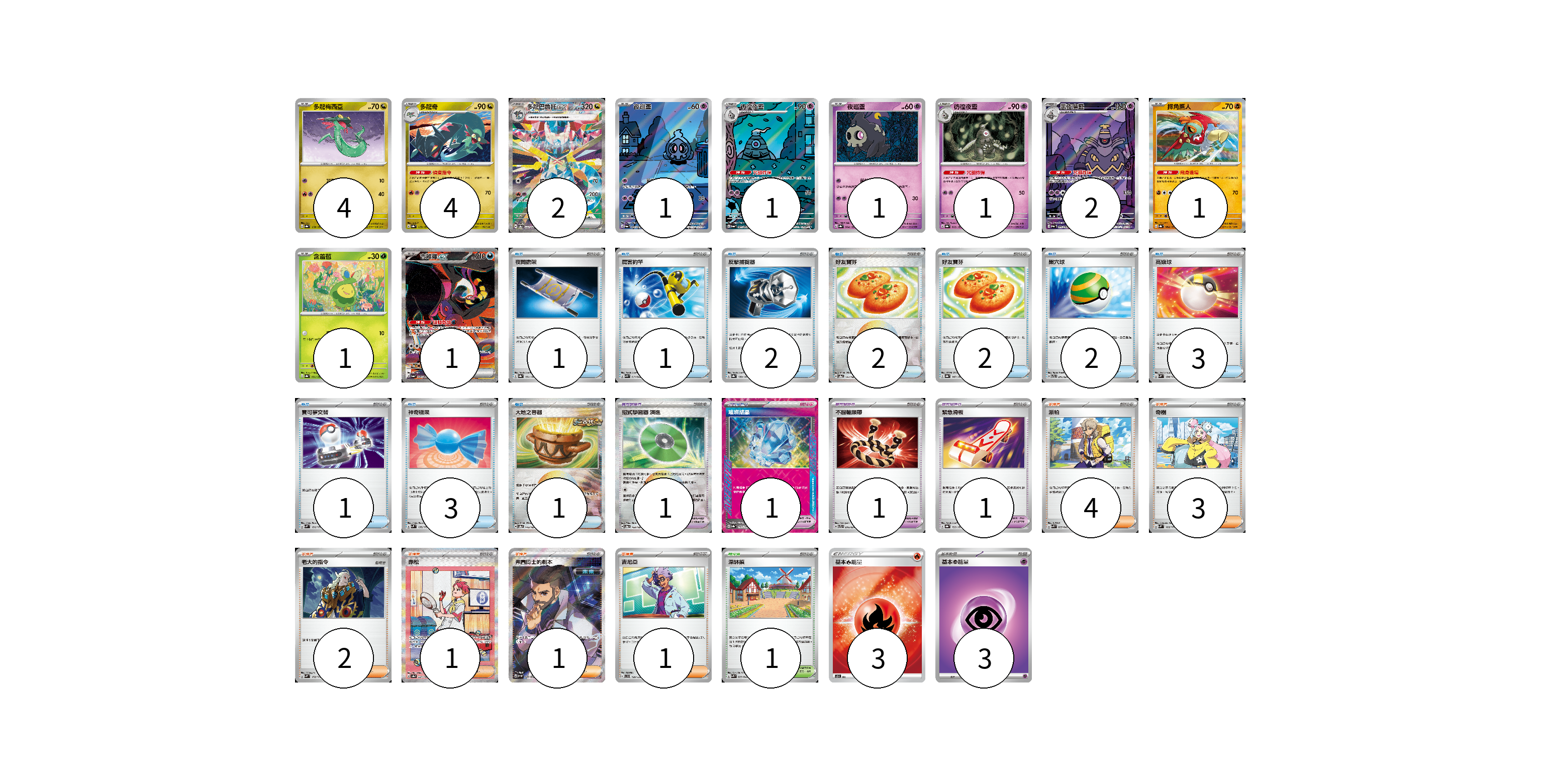 牌組構築方案 以此牌組為基礎新構築牌組 顯示卡面 顯示列表 寶可夢卡(19) 4 4 2 1 1 1 1 2 1 1 1 寶可夢道具(4) 1 1 1 1 物品卡(18) 1 1 2 2 2 2 3 1 3 1 支援者卡(12) 4 3 2 1 1 1 競技場卡(1) 1 能量卡(6) 3 3 寶可夢卡(19) 卡牌名稱 張數 卡牌名稱 張數 多龍梅西亞 SV8a 118/187 04 多龍奇 SV8a 119/187 04 多龍巴魯托ex SV8a 221/187 02 夜巡靈 SV6a 068/064 01 彷徨夜靈 SV6a 069/064 01 夜巡靈 SV8a 064/187 01 彷徨夜靈 SV8a 065/187 01 黑夜魔靈 SV6a 070/064 02 摔角鷹人 SV8a 084/187 01 含羞苞 SV8a 001/187 01 吉雉雞ex SV6a 089/064 01 寶可夢道具(4) 卡牌名稱 張數 卡牌名稱 張數 招式學習器 演進 SV8a 160/187 01 璀璨結晶 SV8a 152/187 01 不服輸頭帶 SVTL 016/021 01 緊急滑板 SV8a 153/187 01 物品卡(18) 卡牌名稱 張數 卡牌名稱 張數 夜間擔架 SV8a 151/187 01 厲害釣竿 SVK 011/042 01 反擊捕捉器 SV8a 139/187 02 好友寶芬 SV8a 147/187 02 好友寶芬 SV8a 147/187 02 巢穴球 SVTL 011/021 02 高級球 SVM 134/175 03 寶可夢交替 SVM 136/175 01 神奇糖果 SVM 135/175 03 大地之容器 SV8a 143/187 01 支援者卡(12) 卡牌名稱 張數 卡牌名稱 張數 派帕 SVK 035/042 04 奇樹 SVM 160/175 03 老大的指令 SVM 172/175 02 赤松 SV8a 227/187 01 弗圖博士的劇本 SV4M 086/066 01 吉尼亞 SVD 129/139 01 競技場卡(1) 卡牌名稱 張數 卡牌名稱 張數 深缽鎮 SVK 039/042 01 能量卡(6) 卡牌名稱 張數 卡牌名稱 張數 基本【火】能量 SO FIR 03 基本【超】能量 SVB PSY 03 以此牌組為基礎新構築牌組 牌組編碼 RCzZKl-nGfYjz-TArnvT copy 列印牌組單 牌組編碼已複製 分享至SNS