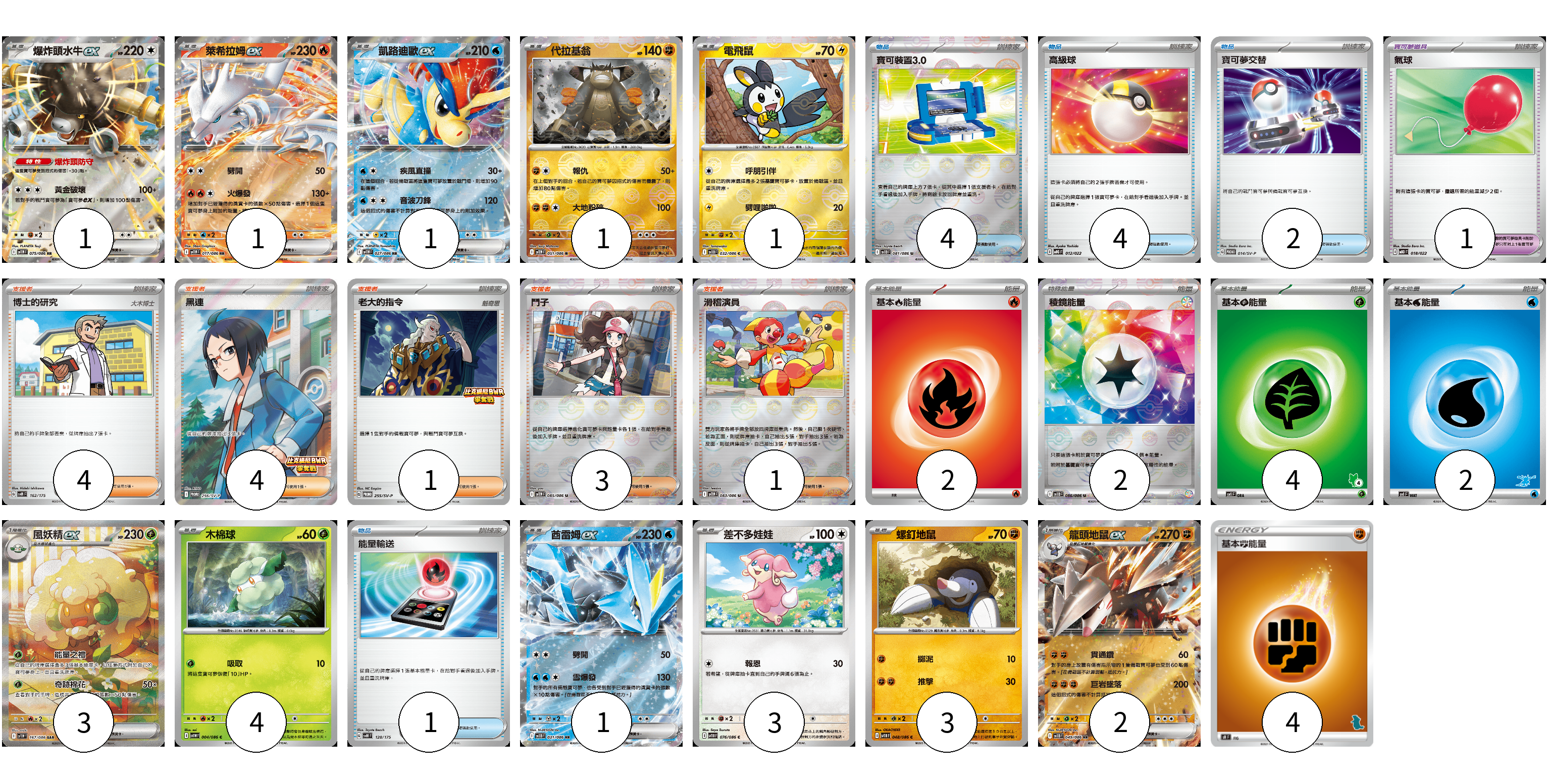 牌組構築方案 以此牌組為基礎新構築牌組 顯示卡面 顯示列表 寶可夢卡(21) 1 1 1 1 1 3 4 1 3 3 2 寶可夢道具(1) 1 物品卡(11) 4 4 2 1 支援者卡(13) 4 4 1 3 1 能量卡(14) 2 2 4 2 4 寶可夢卡(21) 卡牌名稱 張數 卡牌名稱 張數 爆炸頭水牛ex SV11W 075/086 01 萊希拉姆ex SV11W 017/086 01 凱路迪歐ex SV11W 027/086 01 代拉基翁 SV11W 051/086 01 電飛鼠 SV11B 032/086 01 風妖精ex SV11W 167/086 03 木棉球 SV11W 004/086 04 酋雷姆ex SV11B 031/086 01 差不多娃娃 SV11B 076/086 03 螺釘地鼠 SV11B 048/086 03 龍頭地鼠ex SV11B 049/086 02 寶可夢道具(1) 卡牌名稱 張數 卡牌名稱 張數 氣球 MBD 018/022 01 物品卡(11) 卡牌名稱 張數 卡牌名稱 張數 寶可裝置3.0 SV11B 081/086 04 高級球 MBG 012/022 04 寶可夢交替 SV-P 014/SV-P 02 能量輸送 SVM 128/175 01 支援者卡(13) 卡牌名稱 張數 卡牌名稱 張數 博士的研究 SVM 162/175 04 黑連 SV-P 256/SV-P 04 老大的指令 SV-P 255/SV-P 01 鬥子 SV11W 085/086 03 滑稽演員 SV11W 083/086 01 能量卡(14) 卡牌名稱 張數 卡牌名稱 張數 基本火能量 sv-p FIR 02 稜鏡能量 SV11B 086/086 02 基本【草】能量 SVI GRA 04 基本【水】能量 SVI WAT 02 基本鬥能量 SH FIG 04 以此牌組為基礎新構築牌組 牌組編碼 REFFjf-IunTQj-WflRAK copy 列印牌組單 牌組編碼已複製 分享至SNS
