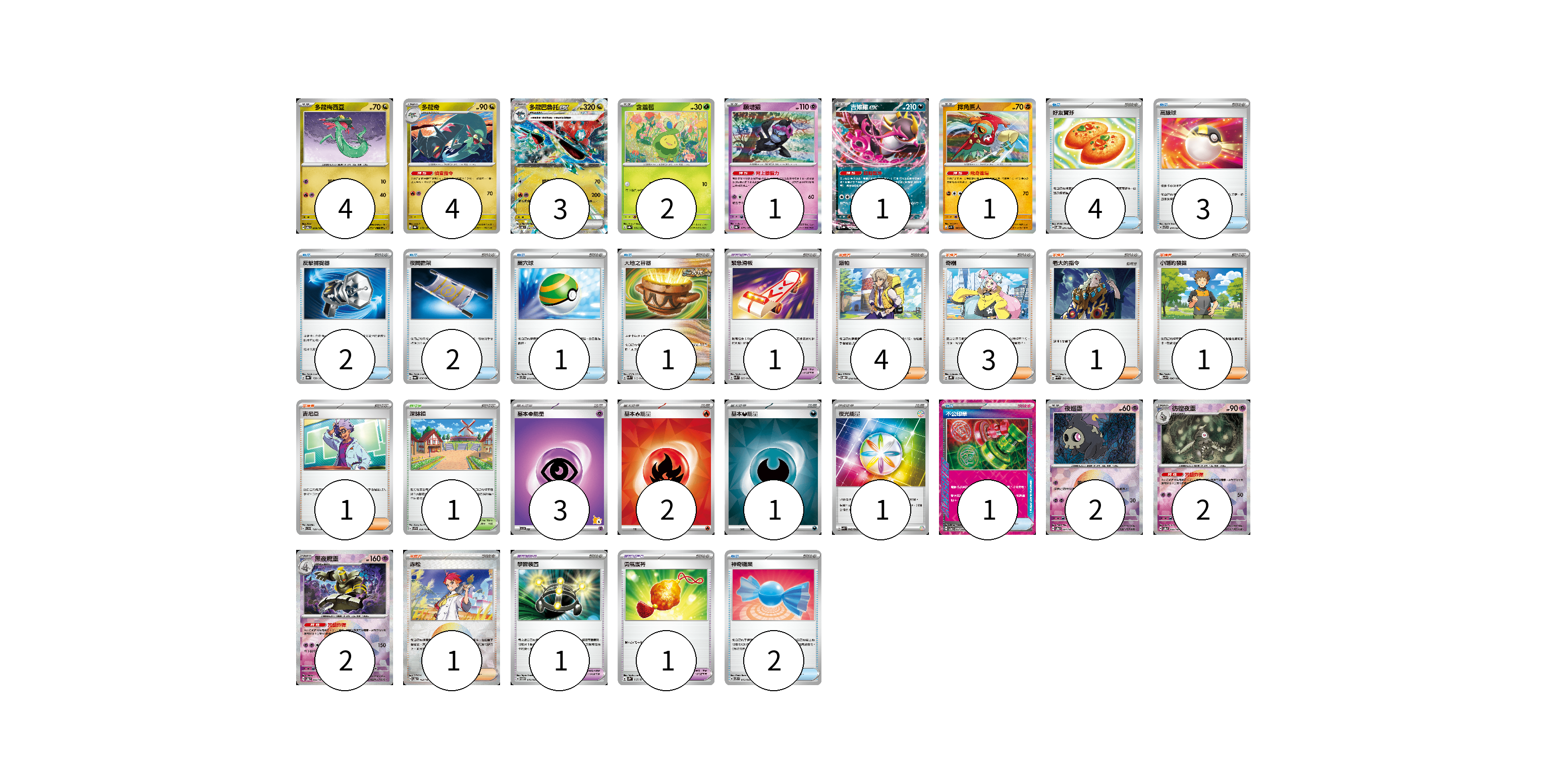 牌組構築方案 以此牌組為基礎新構築牌組 顯示卡面 顯示列表 寶可夢卡(22) 4 4 3 2 1 1 1 2 2 2 寶可夢道具(3) 1 1 1 物品卡(16) 4 3 2 2 1 1 1 2 支援者卡(11) 4 3 1 1 1 1 競技場卡(1) 1 能量卡(7) 3 2 1 1 寶可夢卡(22) 卡牌名稱 張數 卡牌名稱 張數 多龍梅西亞 SV6 079/101 04 多龍奇 SV8a 119/187 04 多龍巴魯托ex SV6 081/101 03 含羞苞 SV8a 001/187 02 願增猿 SV8a 075/187 01 吉雉雞ex SV8a 104/187 01 摔角鷹人 SV1S 045/078 01 夜巡靈 SV8a 064/187 02 彷徨夜靈 SV8a 065/187 02 黑夜魔靈 SV8a 066/187 02 寶可夢道具(3) 卡牌名稱 張數 卡牌名稱 張數 緊急滑板 SVK 023/042 01 學習裝置 SVTM 016/022 01 勇氣護符 SV2D 067/071 01 物品卡(16) 卡牌名稱 張數 卡牌名稱 張數 好友寶芬 SVOD 011/020 04 高級球 SVTR 014/021 03 反擊捕捉器 SV8a 139/187 02 夜間擔架 SV6a 056/064 02 巢穴球 SVTS 013/022 01 大地之容器 SVK 012/042 01 不公印章 SV5a 053/066 01 神奇糖果 SVTS 015/022 02 支援者卡(11) 卡牌名稱 張數 卡牌名稱 張數 派帕 SVOD 018/020 04 奇樹 SVHK 019/022 03 老大的指令 SVHM 022/022 01 小剛的發掘 SV9 096/100 01 吉尼亞 SVD 129/139 01 赤松 SV8a 163/187 01 競技場卡(1) 卡牌名稱 張數 卡牌名稱 張數 深缽鎮 SVF 036/038 01 能量卡(7) 卡牌名稱 張數 卡牌名稱 張數 基本【超】能量 SVI PSY 03 基本【火】能量 SVK FIR 02 基本【惡】能量 SVK DAR 01 夜光能量 SVK 042/042 01 以此牌組為基礎新構築牌組 牌組編碼 REiSVS-rWxoDE-qfTlfd copy 列印牌組單 牌組編碼已複製 分享至SNS
