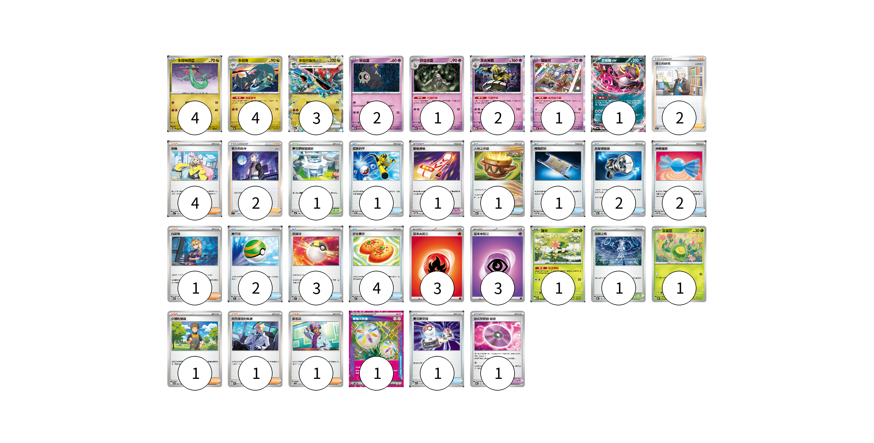 牌組構築方案 以此牌組為基礎新構築牌組 顯示卡面 顯示列表 寶可夢卡(20) 4 4 3 2 1 2 1 1 1 1 寶可夢道具(2) 1 1 物品卡(17) 1 1 1 2 2 2 3 4 1 支援者卡(12) 2 4 2 1 1 1 1 競技場卡(2) 1 1 能量卡(7) 3 3 1 寶可夢卡(20) 卡牌名稱 張數 卡牌名稱 張數 多龍梅西亞 SV6 079/101 04 多龍奇 SV8a 119/187 04 多龍巴魯托ex SV8a 120/187 03 夜巡靈 SV8a 064/187 02 彷徨夜靈 SV8a 065/187 01 黑夜魔靈 SV8a 066/187 02 鑰圈兒 SV4a 087/190 01 吉雉雞ex SV8a 104/187 01 謝米 SV9a 006/063 01 含羞苞 SV8a 001/187 01 寶可夢道具(2) 卡牌名稱 張數 卡牌名稱 張數 緊急滑板 SVOD 015/020 01 招式學習器 衰退 SV8a 161/187 01 物品卡(17) 卡牌名稱 張數 卡牌名稱 張數 厲害釣竿 SVTL 009/021 01 大地之容器 SV8a 143/187 01 夜間擔架 SVOM 016/021 01 反擊捕捉器 SV8a 139/187 02 神奇糖果 SVOD 013/020 02 巢穴球 SVM 133/175 02 高級球 SVM 134/175 03 好友寶芬 SVK 015/042 04 寶可夢交替 SVHM 014/022 01 支援者卡(12) 卡牌名稱 張數 卡牌名稱 張數 博士的研究(山梨博士) SK 024/030 02 奇樹 SVM 160/175 04 老大的指令(赤日) SI 406/414 02 白蕾雅 SV8a 176/187 01 小剛的發掘 SV9 096/100 01 阿克羅瑪的執著 SV6a 059/064 01 吉尼亞 SVD 129/139 01 競技場卡(2) 卡牌名稱 張數 卡牌名稱 張數 寶可夢聯盟總部 SV4a 186/190 01 阻礙之塔 SV8a 181/187 01 能量卡(7) 卡牌名稱 張數 卡牌名稱 張數 基本【火】能量 SVTL FIR 03 基本【超】能量 SVTS PSY 03 新衝天能量 SV5K 071/071 01 以此牌組為基礎新構築牌組 牌組編碼 REsnpA-nJXrTv-YsnJGE copy 列印牌組單 牌組編碼已複製 分享至SNS