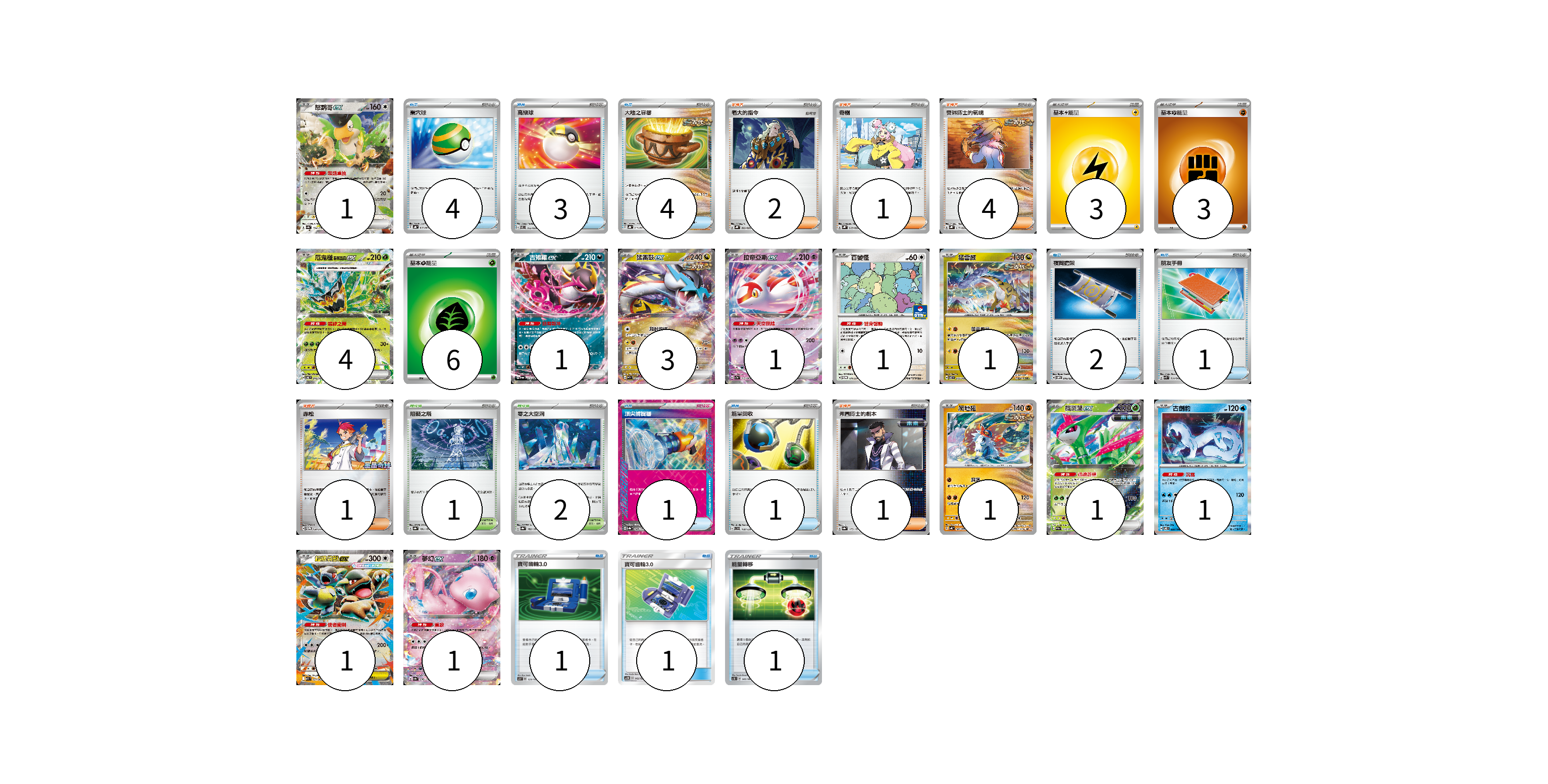 牌組構築方案 以此牌組為基礎新構築牌組 顯示卡面 顯示列表 寶可夢卡(17) 1 4 1 3 1 1 1 1 1 1 1 1 物品卡(19) 4 3 4 2 1 1 1 1 1 1 支援者卡(9) 2 1 4 1 1 競技場卡(3) 1 2 能量卡(12) 3 3 6 寶可夢卡(17) 卡牌名稱 張數 卡牌名稱 張數 怒鸚哥ex SV4a 154/190 01 厄鬼椪 碧草面具ex SV6 016/101 04 吉雉雞ex SV6a 038/064 01 猛雷鼓ex SV5K 053/071 03 拉帝亞斯ex SV7a 019/064 01 百變怪 SV-P 111/SV-P 01 猛雷鼓 SV7 075/102 01 爬地翅 SV4K 041/066 01 鐵斑葉ex SV5M 016/071 01 古劍豹 SV8 032/106 01 超級袋獸ex M1S 051/063 01 夢幻ex SV4a 076/190 01 物品卡(19) 卡牌名稱 張數 卡牌名稱 張數 巢穴球 SVHK 012/022 04 高級球 SVEL 012/020 03 大地之容器 SVHK 011/022 04 夜間擔架 SVOM 016/021 02 朋友手冊 SVK 014/042 01 頂尖捕捉器 SV8a 148/187 01 能量回收 SVD 110/139 01 寶可齒輪3.0 SCD 129/159 01 寶可齒輪3.0 AS5D 149/169 01 能量轉移 SC1D 146/164 01 支援者卡(9) 卡牌名稱 張數 卡牌名稱 張數 老大的指令 SVHK 022/022 02 奇樹 SVHK 019/022 01 奧琳博士的氣魄 SVHK 017/022 04 赤松 SV-P 150/SV-P 01 弗圖博士的劇本 SV8a 175/187 01 競技場卡(3) 卡牌名稱 張數 卡牌名稱 張數 阻礙之塔 SV8a 181/187 01 零之大空洞 SV8a 182/187 02 能量卡(12) 卡牌名稱 張數 卡牌名稱 張數 基本【雷】能量 SVHM LIG 03 基本【鬥】能量 SVHK FIG 03 基本草能量 sv-p GRA 06 以此牌組為基礎新構築牌組 牌組編碼 RFdeaY-ABligl-gHpVxI copy 列印牌組單 牌組編碼已複製 分享至SNS