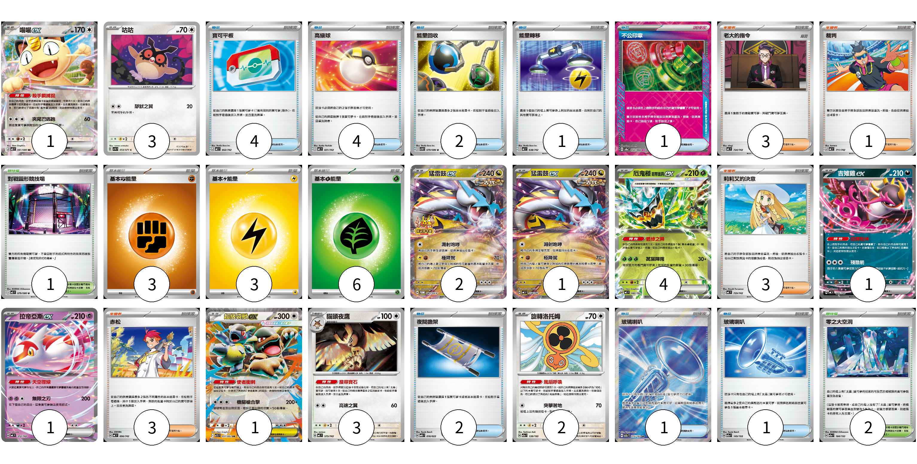 牌組構築方案 以此牌組為基礎新構築牌組 顯示卡面 顯示列表 寶可夢卡(19) 1 3 2 1 4 1 1 1 3 2 物品卡(16) 4 4 2 1 1 2 1 1 支援者卡(10) 3 1 3 3 競技場卡(3) 1 2 能量卡(12) 3 3 6 寶可夢卡(19) 卡牌名稱 張數 卡牌名稱 張數 喵喵ex M3 061/080 01 咕咕 SV5K 054/071 03 猛雷鼓ex SV-P 081/SV-P 02 猛雷鼓ex MC 554/742 01 厄鬼椪 碧草面具ex MC 082/742 04 吉雉雞ex MC 489/742 01 拉帝亞斯ex MC 312/742 01 超級袋獸ex M1S 051/063 01 貓頭夜鷹 MC 573/742 03 旋轉洛托姆 M2a 139/193 02 物品卡(16) 卡牌名稱 張數 卡牌名稱 張數 寶可平板 MC 662/742 04 高級球 MC 651/742 04 能量回收 SV11W 079/086 02 能量轉移 MC 638/742 01 不公印章 SV5a 053/066 01 夜間擔架 MBD 016/022 02 玻璃喇叭 M2a 215/193 01 玻璃喇叭 M2a 149/193 01 支援者卡(10) 卡牌名稱 張數 卡牌名稱 張數 老大的指令 MC 724/742 03 裁判 MC 711/742 01 莉莉艾的決意 MC 729/742 03 赤松 MC 696/742 03 競技場卡(3) 卡牌名稱 張數 卡牌名稱 張數 對戰圓形競技場 M2 079/080 01 零之大空洞 M2a 184/193 02 能量卡(12) 卡牌名稱 張數 卡牌名稱 張數 基本【鬥】能量 MC FIG 03 基本【雷】能量 MC LIG 03 基本【草】能量 MC GRA 06 以此牌組為基礎新構築牌組 牌組編碼 RHARjP-SVWVxQ-oprmks copy 列印牌組單 牌組編碼已複製 分享至SNS
