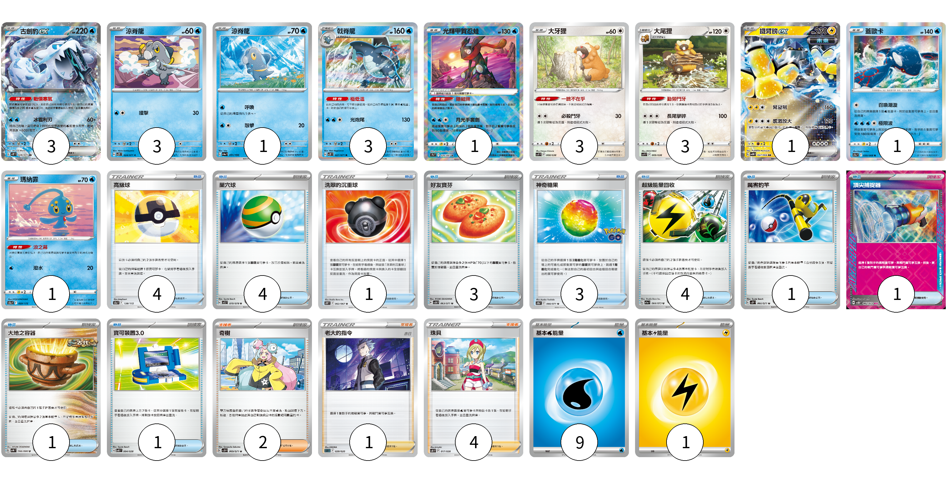 牌組構築方案 以此牌組為基礎新構築牌組 顯示卡面 顯示列表 寶可夢卡(20) 3 3 1 3 1 3 3 1 1 1 物品卡(23) 4 4 1 3 3 4 1 1 1 1 支援者卡(7) 2 1 4 能量卡(10) 9 1 寶可夢卡(20) 卡牌名稱 張數 卡牌名稱 張數 古劍豹ex SV2P 028/071 03 涼脊龍 SV2P 024/071 03 涼脊龍 SV4a 051/190 01 戟脊龍 SV2P 027/071 03 光輝甲賀忍蛙 S9a 026/067 01 大牙狸 SVF 008/038 03 大尾狸 SVF 009/038 03 鐵臂膀ex SV4M 027/066 01 蓋歐卡 S11a 030/068 01 瑪納霏 S12a 029/172 01 物品卡(23) 卡牌名稱 張數 卡牌名稱 張數 高級球 S12a 138/172 04 巢穴球 SV1S 070/078 04 洗翠的沉重球 S10P 062/067 01 好友寶芬 SV5K 063/071 03 神奇糖果 S10b 066/071 03 超級能量回收 SV1a 064/073 04 厲害釣竿 SV2P 066/071 01 頂尖捕捉器 SV5M 062/071 01 大地之容器 SV4K 060/066 01 寶可裝置3.0 SVB 004/028 01 支援者卡(7) 卡牌名稱 張數 卡牌名稱 張數 奇樹 SV2D 069/071 02 老大的指令(赤日) SLD 020/020 01 珠貝 SVB 017/028 04 能量卡(10) 卡牌名稱 張數 卡牌名稱 張數 基本水能量 sv-p WAT 09 基本雷能量 sv-p LIG 01 以此牌組為基礎新構築牌組 牌組編碼 RJQbxc-qVpEPr-CfwLbh copy 列印牌組單 牌組編碼已複製 分享至SNS