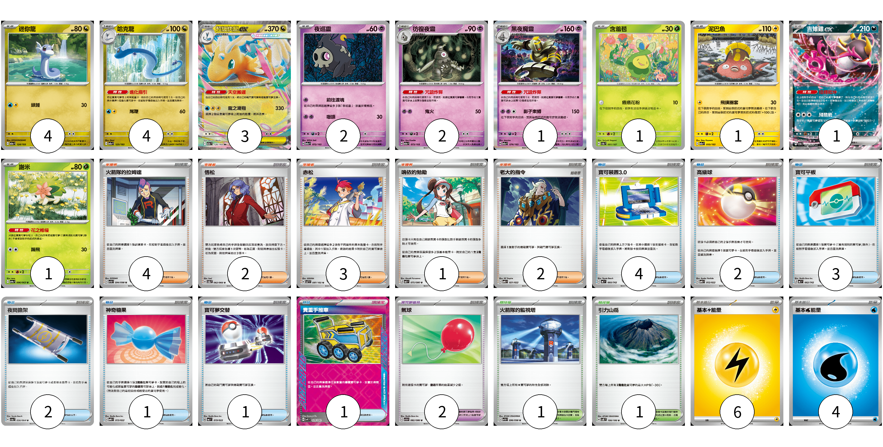 牌組構築方案 以此牌組為基礎新構築牌組 顯示卡面 顯示列表 寶可夢卡(20) 4 4 3 2 2 1 1 1 1 1 寶可夢道具(2) 2 物品卡(14) 4 2 3 2 1 1 1 支援者卡(12) 4 2 3 1 2 競技場卡(2) 1 1 能量卡(10) 6 4 寶可夢卡(20) 卡牌名稱 張數 卡牌名稱 張數 迷你龍 M2a 124/193 04 哈克龍 M2a 125/193 04 超級快龍ex M2a 126/193 03 夜巡靈 M2a 072/193 02 彷徨夜靈 M2a 073/193 02 黑夜魔靈 M2a 074/193 01 含羞苞 SV8a 001/187 01 泥巴魚 M2a 050/193 01 吉雉雞ex SV6a 038/064 01 謝米 SV9a 006/063 01 寶可夢道具(2) 卡牌名稱 張數 卡牌名稱 張數 氣球 SV11B 082/086 02 物品卡(14) 卡牌名稱 張數 卡牌名稱 張數 寶可裝置3.0 MC 660/742 04 高級球 MBG 012/022 02 寶可平板 MC 662/742 03 夜間擔架 SV6a 056/064 02 神奇糖果 MBG 013/022 01 寶可夢交替 MJ 019/022 01 貴重手推車 SVK 020/042 01 支援者卡(12) 卡牌名稱 張數 卡牌名稱 張數 火箭隊的拉姆達 SV10 094/098 04 悟松 SV5a 062/066 02 赤松 SV7 097/102 03 鳴依的勉勵 M3 075/080 01 老大的指令 MBG 021/022 02 競技場卡(2) 卡牌名稱 張數 卡牌名稱 張數 火箭隊的監視塔 SV10 096/098 01 引力山岳 SV8 106/106 01 能量卡(10) 卡牌名稱 張數 卡牌名稱 張數 基本【雷】能量 MC LIG 06 基本【水】能量 MC WAT 04 以此牌組為基礎新構築牌組 牌組編碼 RNcVeu-mjxuek-IXkiWY copy 列印牌組單 牌組編碼已複製 分享至SNS