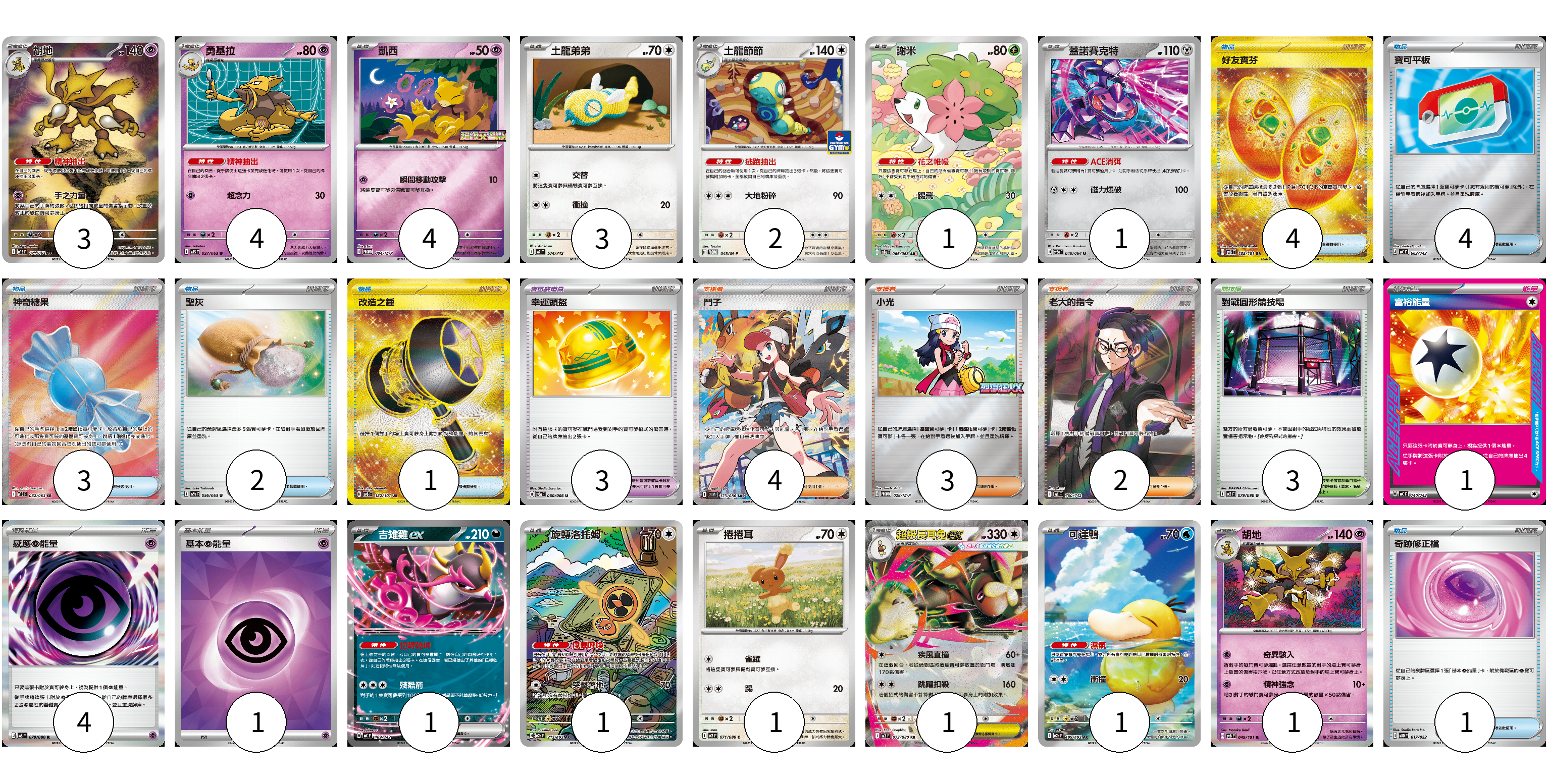 牌組構築方案 以此牌組為基礎新構築牌組 顯示卡面 顯示列表 寶可夢卡(24) 3 4 4 3 2 1 1 1 1 1 1 1 1 寶可夢道具(3) 3 物品卡(15) 4 4 3 2 1 1 支援者卡(9) 4 3 2 競技場卡(3) 3 能量卡(6) 1 4 1 寶可夢卡(24) 卡牌名稱 張數 卡牌名稱 張數 胡地 M1S 071/063 03 勇基拉 M1S 037/063 04 凱西 M-P 004/M-P 04 土龍弟弟 MC 574/742 03 土龍節節 M-P 045/M-P 02 謝米 SV9a 066/063 01 蓋諾賽克特 SV6a 040/064 01 吉雉雞ex MC 489/742 01 旋轉洛托姆 M2a 213/193 01 捲捲耳 M2 071/080 01 超級長耳兔ex M2 072/080 01 可達鴨 M2a 199/193 01 胡地 SV6 049/101 01 寶可夢道具(3) 卡牌名稱 張數 卡牌名稱 張數 幸運頭盔 SV5a 060/066 03 物品卡(15) 卡牌名稱 張數 卡牌名稱 張數 好友寶芬 SV6 133/101 04 寶可平板 MC 662/742 04 神奇糖果 M1S 082/063 03 聖灰 SV9a 056/063 02 改造之錘 SV6 132/101 01 奇跡修正檔 MBD 017/022 01 支援者卡(9) 卡牌名稱 張數 卡牌名稱 張數 鬥子 SV11W 173/086 04 小光 M-P 028/M-P 03 老大的指令(烏羽) MC 760/742 02 競技場卡(3) 卡牌名稱 張數 卡牌名稱 張數 對戰圓形競技場 M2 079/080 03 能量卡(6) 卡牌名稱 張數 卡牌名稱 張數 富裕能量 MC 740/742 01 感應【超】能量 M3 079/080 04 基本【超】能量 SVM PSY 01 以此牌組為基礎新構築牌組 牌組編碼 RPGoTm-nGlqVe-vOJhOK copy 列印牌組單 牌組編碼已複製 分享至SNS