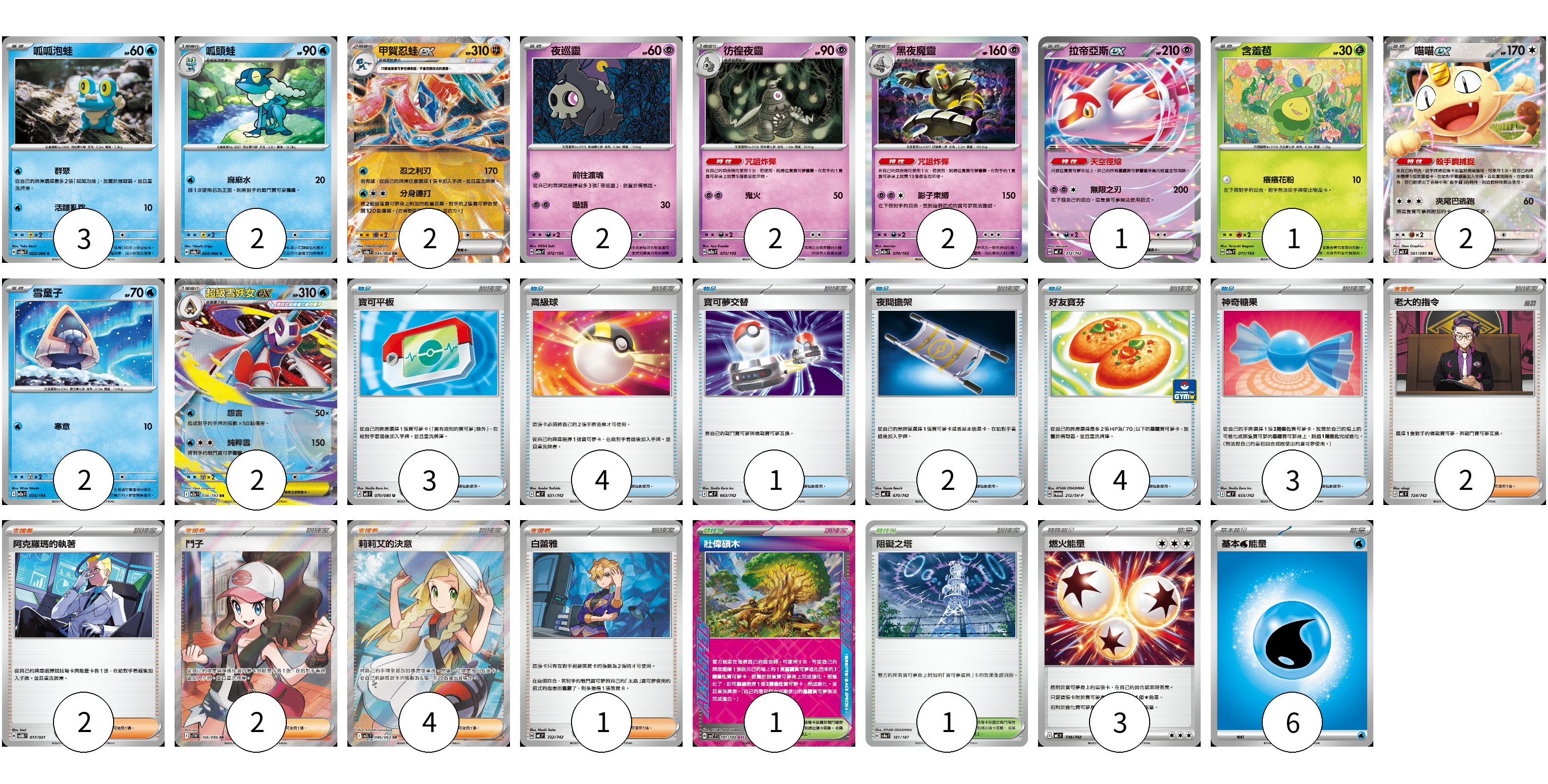 牌組構築方案 以此牌組為基礎新構築牌組 顯示卡面 顯示列表 寶可夢卡(21) 3 2 2 2 2 2 1 1 2 2 2 物品卡(17) 3 4 1 2 4 3 支援者卡(11) 2 2 2 4 1 競技場卡(2) 1 1 能量卡(9) 3 6 寶可夢卡(21) 卡牌名稱 張數 卡牌名稱 張數 呱呱泡蛙 SV5a 023/066 03 呱頭蛙 SV5a 024/066 02 甲賀忍蛙ex SV5a 045/066 02 夜巡靈 M2a 072/193 02 彷徨夜靈 M2a 073/193 02 黑夜魔靈 M2a 074/193 02 拉帝亞斯ex MC 312/742 01 含羞苞 M2a 011/193 01 喵喵ex M3 061/080 02 雪童子 M2a 035/193 02 超級雪妖女ex M2a 036/193 02 物品卡(17) 卡牌名稱 張數 卡牌名稱 張數 寶可平板 M3 070/080 03 高級球 MC 651/742 04 寶可夢交替 MC 663/742 01 夜間擔架 MC 670/742 02 好友寶芬 SV-P 212/SV-P 04 神奇糖果 MC 655/742 03 支援者卡(11) 卡牌名稱 張數 卡牌名稱 張數 老大的指令 MC 724/742 02 阿克羅瑪的執著 SVOM 017/021 02 鬥子 SV11W 166/086 02 莉莉艾的決意 M1L 086/063 04 白蕾雅 MC 722/742 01 競技場卡(2) 卡牌名稱 張數 卡牌名稱 張數 壯偉碩木 SV7 101/102 01 阻礙之塔 SV8a 181/187 01 能量卡(9) 卡牌名稱 張數 卡牌名稱 張數 燃火能量 MC 736/742 03 基本【水】能量 MC WAT 06 以此牌組為基礎新構築牌組 牌組編碼 RQUDXq-WtBueA-JwtFGG copy 列印牌組單 牌組編碼已複製 分享至SNS
