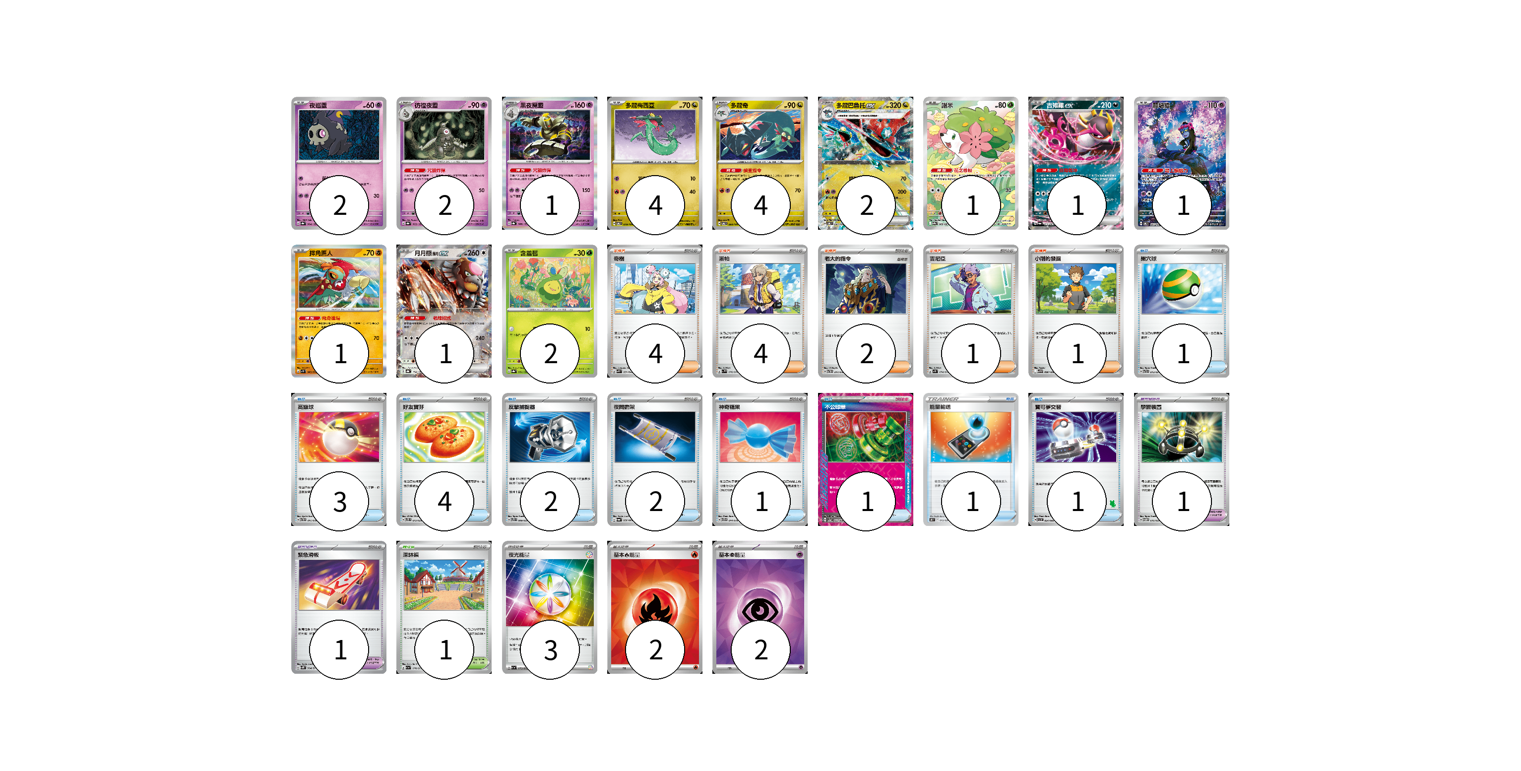 牌組構築方案 以此牌組為基礎新構築牌組 顯示卡面 顯示列表 寶可夢卡(22) 2 2 1 4 4 2 1 1 1 1 1 2 寶可夢道具(2) 1 1 物品卡(16) 1 3 4 2 2 1 1 1 1 支援者卡(12) 4 4 2 1 1 競技場卡(1) 1 能量卡(7) 3 2 2 寶可夢卡(22) 卡牌名稱 張數 卡牌名稱 張數 夜巡靈 SV8a 064/187 02 彷徨夜靈 SV8a 065/187 02 黑夜魔靈 SV8a 066/187 01 多龍梅西亞 SV6 079/101 04 多龍奇 SV6 080/101 04 多龍巴魯托ex SV6 081/101 02 謝米 SV9a 066/063 01 吉雉雞ex SV6a 038/064 01 願增猿 SV6 107/101 01 摔角鷹人 SV1S 045/078 01 月月熊 赫月ex SV8a 134/187 01 含羞苞 SV8a 001/187 02 寶可夢道具(2) 卡牌名稱 張數 卡牌名稱 張數 學習裝置 SVTM 016/022 01 緊急滑板 SV5K 064/071 01 物品卡(16) 卡牌名稱 張數 卡牌名稱 張數 巢穴球 SVTR 013/021 01 高級球 SVTH 011/018 03 好友寶芬 SVTS 012/022 04 反擊捕捉器 SVTS 009/022 02 夜間擔架 SV6a 056/064 02 神奇糖果 SVTG 014/019 01 不公印章 SV5a 053/066 01 能量輸送 SN 013/024 01 寶可夢交替 SVI 054/066 01 支援者卡(12) 卡牌名稱 張數 卡牌名稱 張數 奇樹 SVK 031/042 04 派帕 SV1V 076/078 04 老大的指令 SVTH 017/018 02 吉尼亞 SV1S 074/078 01 小剛的發掘 SV9 096/100 01 競技場卡(1) 卡牌名稱 張數 卡牌名稱 張數 深缽鎮 SV1a 070/073 01 能量卡(7) 卡牌名稱 張數 卡牌名稱 張數 夜光能量 SV1a 073/073 03 基本【火】能量 SVK FIR 02 基本【超】能量 SVM PSY 02 以此牌組為基礎新構築牌組 牌組編碼 RTEcwE-jbbwKx-cmTWsv copy 列印牌組單 牌組編碼已複製 分享至SNS