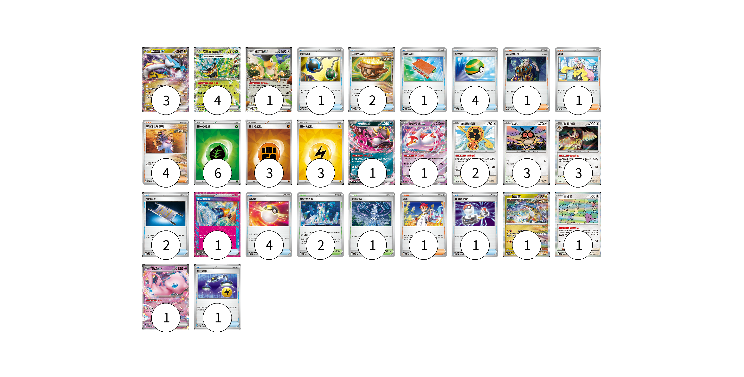 牌組構築方案 以此牌組為基礎新構築牌組 顯示卡面 顯示列表 寶可夢卡(21) 3 4 1 1 1 2 3 3 1 1 1 物品卡(17) 1 2 1 4 2 1 4 1 1 支援者卡(7) 1 1 4 1 競技場卡(3) 2 1 能量卡(12) 6 3 3 寶可夢卡(21) 卡牌名稱 張數 卡牌名稱 張數 猛雷鼓ex SV5K 053/071 03 厄鬼椪 碧草面具ex SV6 016/101 04 怒鸚哥ex SVK 006/042 01 吉雉雞ex SV8a 104/187 01 拉帝亞斯ex SV7a 019/064 01 旋轉洛托姆 SV8a 131/187 02 咕咕 SV7 076/102 03 貓頭夜鷹 SV7 077/102 03 猛雷鼓 SV7 075/102 01 百變怪 SV4a 144/190 01 夢幻ex SVK 001/042 01 物品卡(17) 卡牌名稱 張數 卡牌名稱 張數 能量回收 SVTM 009/022 01 大地之容器 SVK 012/042 02 朋友手冊 SV1S 069/078 01 巢穴球 SV1S 070/078 04 夜間擔架 SV8a 151/187 02 頂尖捕捉器 SV8a 148/187 01 高級球 SVEL 012/020 04 寶可夢交替 SVOD 014/020 01 能量轉移 SVM 127/175 01 支援者卡(7) 卡牌名稱 張數 卡牌名稱 張數 老大的指令 SVF 032/038 01 奇樹 SVEM 017/020 01 奧琳博士的氣魄 SV4K 064/066 04 赤松 SV8a 163/187 01 競技場卡(3) 卡牌名稱 張數 卡牌名稱 張數 零之大空洞 SV8a 182/187 02 阻礙之塔 SV8a 181/187 01 能量卡(12) 卡牌名稱 張數 卡牌名稱 張數 基本【草】能量 SVK GRA 06 基本【鬥】能量 SVK FIG 03 基本【雷】能量 SVK LIG 03 以此牌組為基礎新構築牌組 牌組編碼 RTdLKa-hfCDSP-XjILiB copy 列印牌組單 牌組編碼已複製 分享至SNS