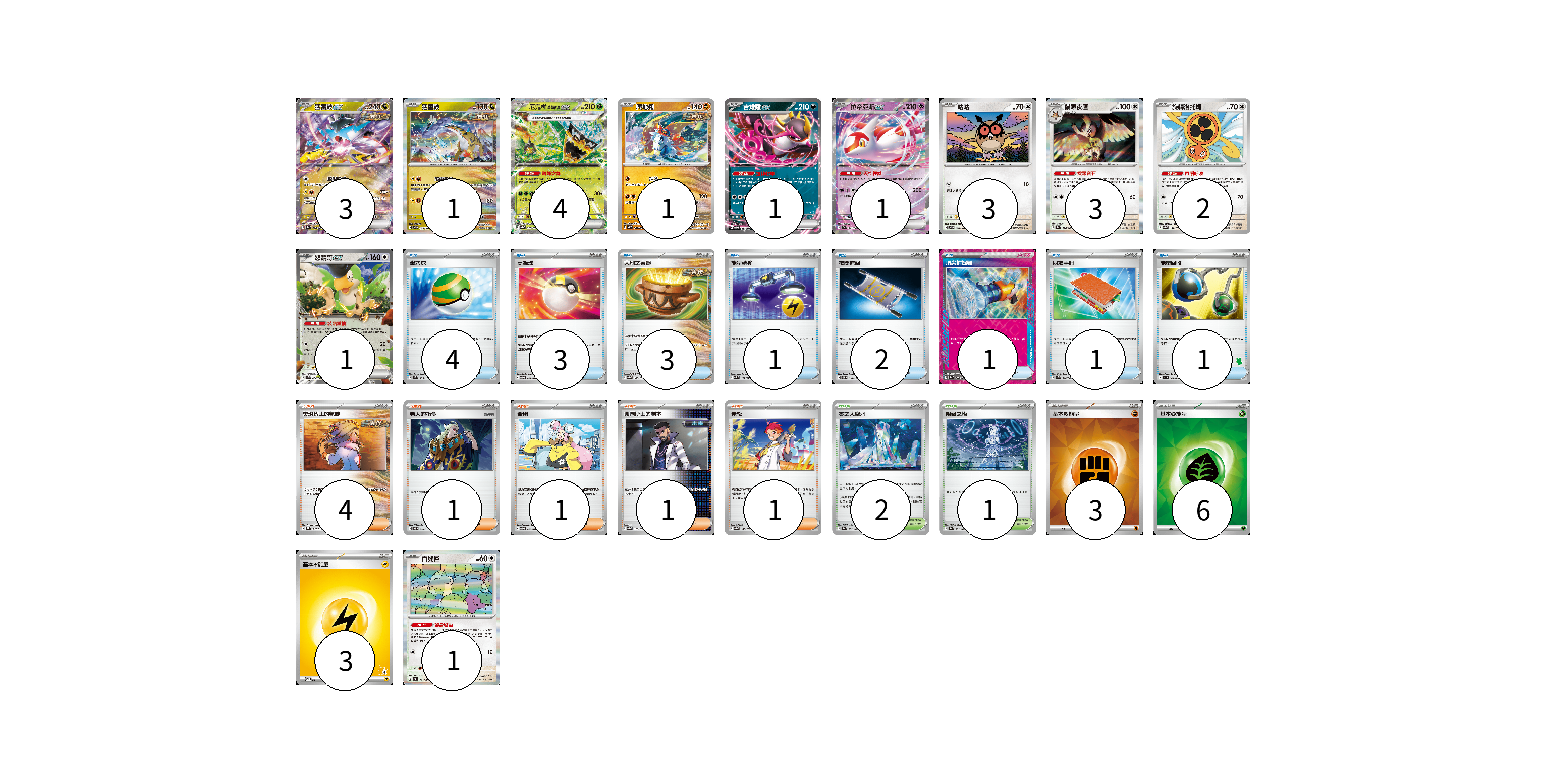牌組構築方案 以此牌組為基礎新構築牌組 顯示卡面 顯示列表 寶可夢卡(21) 3 1 4 1 1 1 3 3 2 1 1 物品卡(16) 4 3 3 1 2 1 1 1 支援者卡(8) 4 1 1 1 1 競技場卡(3) 2 1 能量卡(12) 3 6 3 寶可夢卡(21) 卡牌名稱 張數 卡牌名稱 張數 猛雷鼓ex SV8a 124/187 03 猛雷鼓 SV7 075/102 01 厄鬼椪 碧草面具ex SV8a 020/187 04 爬地翅 SV4K 041/066 01 吉雉雞ex SVOD 004/020 01 拉帝亞斯ex SV7a 019/064 01 咕咕 SV7 076/102 03 貓頭夜鷹 SV8a 128/187 03 旋轉洛托姆 SV8a 131/187 02 怒鸚哥ex SVK 006/042 01 百變怪 SV4a 144/190 01 物品卡(16) 卡牌名稱 張數 卡牌名稱 張數 巢穴球 SVM 133/175 04 高級球 SVOD 012/020 03 大地之容器 SV8a 143/187 03 能量轉移 SVM 127/175 01 夜間擔架 SVOM 016/021 02 頂尖捕捉器 SV8a 148/187 01 朋友手冊 SVK 014/042 01 能量回收 SVI 049/066 01 支援者卡(8) 卡牌名稱 張數 卡牌名稱 張數 奧琳博士的氣魄 SVHK 017/022 04 老大的指令 SVOD 019/020 01 奇樹 SVOD 016/020 01 弗圖博士的劇本 SV8a 175/187 01 赤松 SV8a 163/187 01 競技場卡(3) 卡牌名稱 張數 卡牌名稱 張數 零之大空洞 SV8a 182/187 02 阻礙之塔 SV8a 181/187 01 能量卡(12) 卡牌名稱 張數 卡牌名稱 張數 基本【鬥】能量 SVK FIG 03 基本【草】能量 SVK GRA 06 基本【雷】能量 SVI LIG 03 以此牌組為基礎新構築牌組 牌組編碼 RTseyZ-VNJzkE-rYVGJb copy 列印牌組單 牌組編碼已複製 分享至SNS