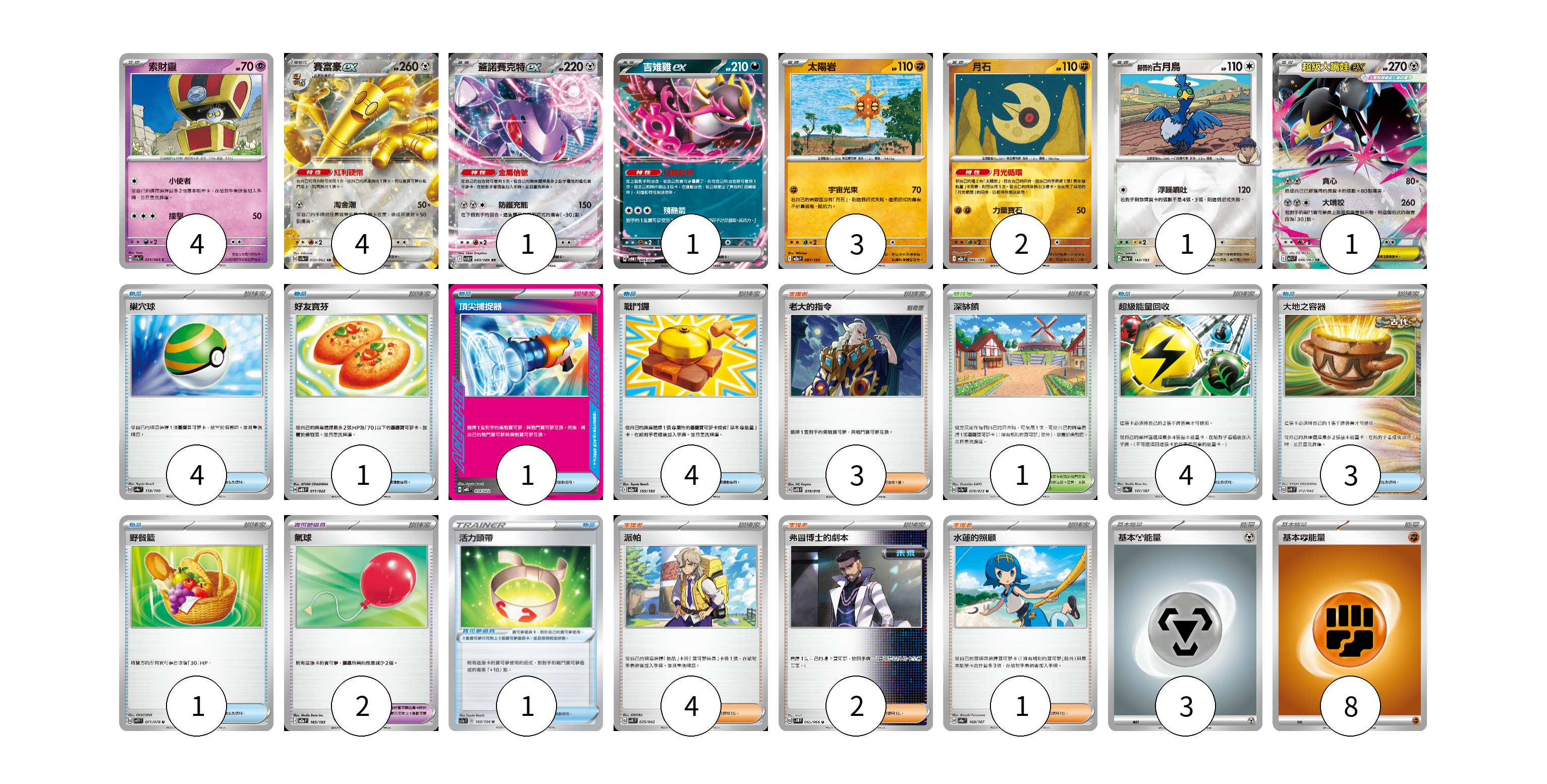 牌組構築方案 以此牌組為基礎新構築牌組 顯示卡面 顯示列表 寶可夢卡(17) 4 4 1 1 3 2 1 1 寶可夢道具(3) 2 1 物品卡(18) 4 1 1 4 4 3 1 支援者卡(10) 3 4 2 1 競技場卡(1) 1 能量卡(11) 3 8 寶可夢卡(17) 卡牌名稱 張數 卡牌名稱 張數 索財靈 SV7a 024/064 04 賽富豪ex SV3a 050/062 04 蓋諾賽克特ex SV11B 069/086 01 吉雉雞ex SVOM 009/021 01 太陽岩 M2a 087/193 03 月石 M2a 086/193 02 赫普的古月鳥 M2a 143/193 01 超級大嘴娃ex M1L 046/063 01 寶可夢道具(3) 卡牌名稱 張數 卡牌名稱 張數 氣球 M2a 165/193 02 活力頭帶 SC1a 143/154 01 物品卡(18) 卡牌名稱 張數 卡牌名稱 張數 巢穴球 SV4a 159/190 04 好友寶芬 MBG 011/022 01 頂尖捕捉器 MBG 014/022 01 戰鬥鑼 M2a 155/193 04 超級能量回收 SV8a 141/187 04 大地之容器 SVK 012/042 03 野餐籃 SV1V 071/078 01 支援者卡(10) 卡牌名稱 張數 卡牌名稱 張數 老大的指令 SVTG 019/019 03 派帕 SVK 035/042 04 弗圖博士的劇本 SV4M 065/066 02 水蓮的照顧 SV8a 168/187 01 競技場卡(1) 卡牌名稱 張數 卡牌名稱 張數 深缽鎮 SV1a 070/073 01 能量卡(11) 卡牌名稱 張數 卡牌名稱 張數 基本【鋼】能量 SVD MET 03 基本【鬥】能量 SVF FIG 08 以此牌組為基礎新構築牌組 牌組編碼 RVHOqD-tGBfAH-WsJtxa copy 列印牌組單 牌組編碼已複製 分享至SNS