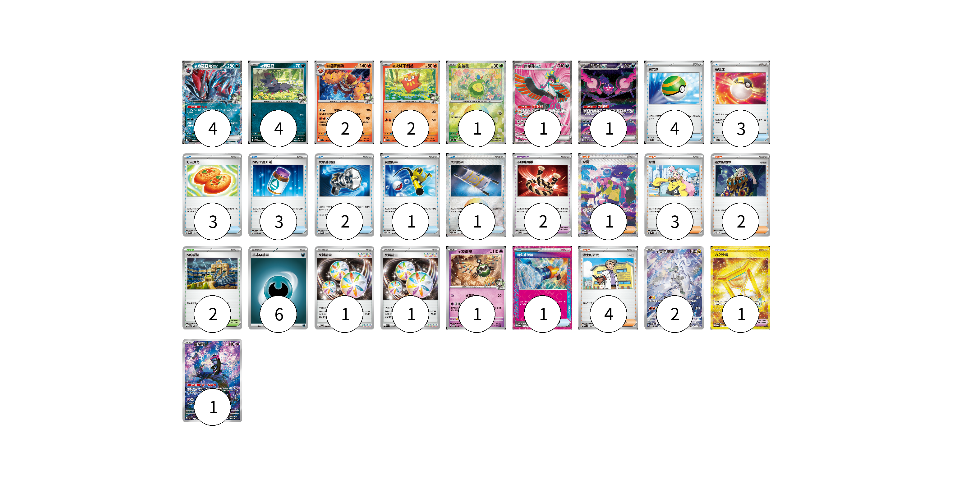 牌組構築方案 以此牌組為基礎新構築牌組 顯示卡面 顯示列表 寶可夢卡(19) 4 4 2 2 1 1 1 1 2 1 寶可夢道具(3) 2 1 物品卡(18) 4 3 3 3 2 1 1 1 支援者卡(10) 1 3 2 4 競技場卡(2) 2 能量卡(8) 6 1 1 寶可夢卡(19) 卡牌名稱 張數 卡牌名稱 張數 N的索羅亞克ex SV9 061/100 04 N的索羅亞 SV9 060/100 04 N的達摩狒狒 SV9 016/100 02 N的火紅不倒翁 SV9 015/100 02 含羞苞 SV8a 001/187 01 吉雉雞ex SV6a 081/064 01 桃歹郎ex SV6a 090/064 01 N的象徵鳥 SV9 040/100 01 N的萊希拉姆 SV9 109/100 02 願增猿 SV6 107/101 01 寶可夢道具(3) 卡牌名稱 張數 卡牌名稱 張數 不服輸頭帶 SVTL 016/021 02 力之沙漏 SV6a 094/064 01 物品卡(18) 卡牌名稱 張數 卡牌名稱 張數 巢穴球 SVM 133/175 04 高級球 SVM 134/175 03 好友寶芬 SV8a 147/187 03 N的PP提升劑 SV9 089/100 03 反擊捕捉器 SV8a 139/187 02 厲害釣竿 SVOD 010/020 01 夜間擔架 SV8a 151/187 01 頂尖捕捉器 SV8a 148/187 01 支援者卡(10) 卡牌名稱 張數 卡牌名稱 張數 奇樹 SV4a 350/190 01 奇樹 SVHK 019/022 03 老大的指令 SVOD 019/020 02 博士的研究 SVM 162/175 04 競技場卡(2) 卡牌名稱 張數 卡牌名稱 張數 N的城堡 SV9 097/100 02 能量卡(8) 卡牌名稱 張數 卡牌名稱 張數 基本【惡】能量 SVD DAR 06 反轉能量 SVD 139/139 01 反轉能量 SV2P 071/071 01 以此牌組為基礎新構築牌組 牌組編碼 RWtIHP-sVvEKT-IBUvFK copy 列印牌組單 牌組編碼已複製 分享至SNS