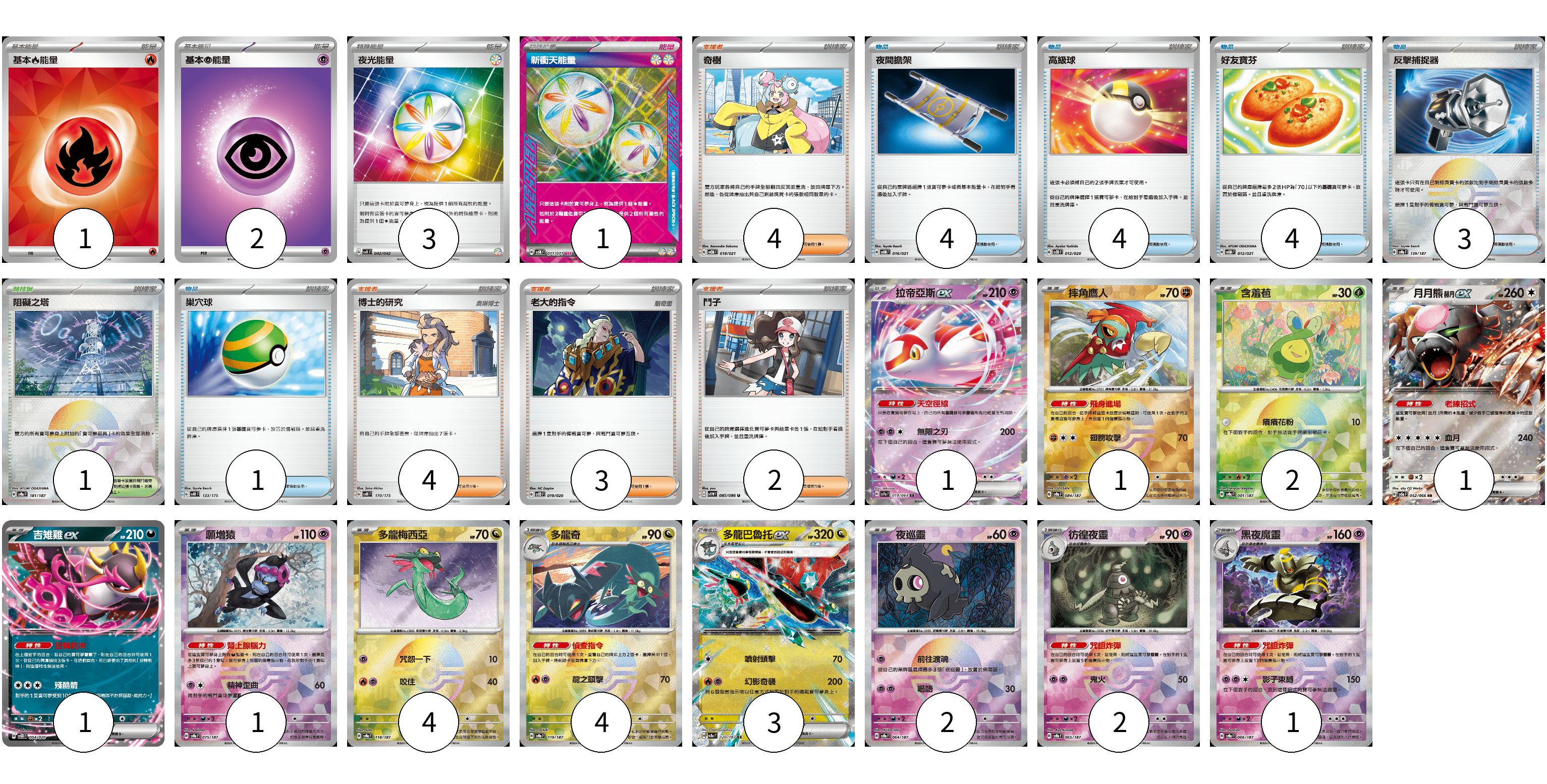 牌組構築方案 以此牌組為基礎新構築牌組 顯示卡面 顯示列表 寶可夢卡(23) 1 1 2 1 1 1 4 4 3 2 2 1 物品卡(16) 4 4 4 3 1 支援者卡(13) 4 4 3 2 競技場卡(1) 1 能量卡(7) 1 2 3 1 寶可夢卡(23) 卡牌名稱 張數 卡牌名稱 張數 拉帝亞斯ex SV7a 019/064 01 摔角鷹人 SV8a 084/187 01 含羞苞 SV8a 001/187 02 月月熊 赫月 ex SV5a 052/066 01 吉雉雞ex SVOD 004/020 01 願增猿 SV8a 075/187 01 多龍梅西亞 SV8a 118/187 04 多龍奇 SV8a 119/187 04 多龍巴魯托ex SV8a 120/187 03 夜巡靈 SV8a 064/187 02 彷徨夜靈 SV8a 065/187 02 黑夜魔靈 SV8a 066/187 01 物品卡(16) 卡牌名稱 張數 卡牌名稱 張數 夜間擔架 SVOM 016/021 04 高級球 SVOD 012/020 04 好友寶芬 SVOM 012/021 04 反擊捕捉器 SV8a 139/187 03 巢穴球 SVM 133/175 01 支援者卡(13) 卡牌名稱 張數 卡牌名稱 張數 奇樹 SVOM 018/021 04 博士的研究 SVM 170/175 04 老大的指令 SVOD 019/020 03 鬥子 SV11W 085/086 02 競技場卡(1) 卡牌名稱 張數 卡牌名稱 張數 阻礙之塔 SV8a 181/187 01 能量卡(7) 卡牌名稱 張數 卡牌名稱 張數 基本【火】能量 SVQL FIR 01 基本【超】能量 M-P PSY 02 夜光能量 SVK 042/042 03 新衝天能量 SV5K 071/071 01 以此牌組為基礎新構築牌組 牌組編碼 RbZgTy-jhjGvA-cPVuzE copy 列印牌組單 牌組編碼已複製 分享至SNS