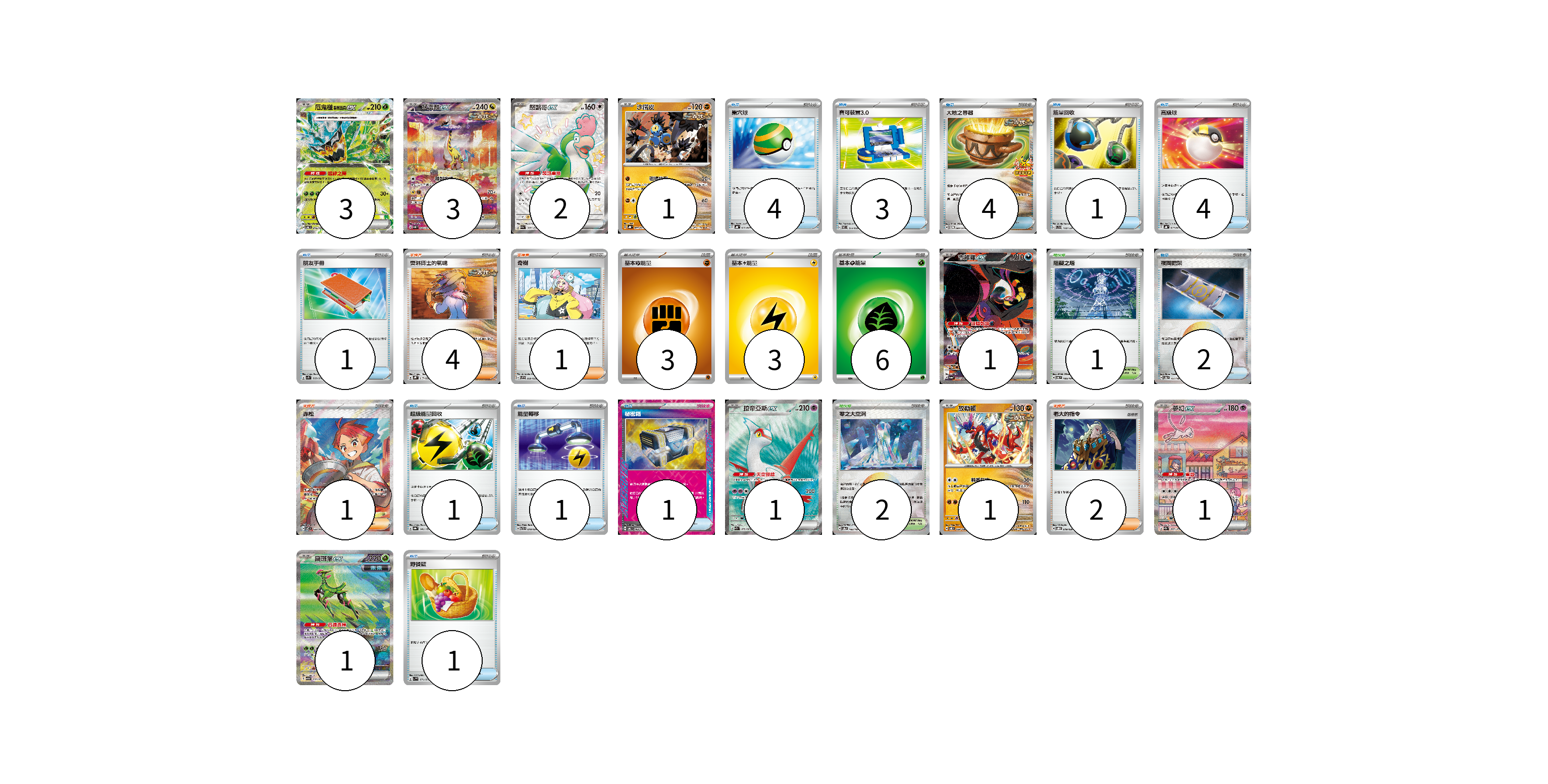 牌組構築方案 以此牌組為基礎新構築牌組 顯示卡面 顯示列表 寶可夢卡(14) 3 3 2 1 1 1 1 1 1 物品卡(23) 4 3 4 1 4 1 2 1 1 1 1 支援者卡(8) 4 1 1 2 競技場卡(3) 1 2 能量卡(12) 3 3 6 寶可夢卡(14) 卡牌名稱 張數 卡牌名稱 張數 厄鬼椪 碧草面具ex SV6 016/101 03 猛雷鼓ex SV5K 095/071 03 怒鸚哥ex SV4a 337/190 02 沙鐵皮 SVHK 009/022 01 吉雉雞ex SV6a 089/064 01 拉帝亞斯ex SV7a 078/064 01 故勒頓 SV8 069/106 01 夢幻ex SV2a 205/165 01 鐵斑葉ex SV5M 093/071 01 物品卡(23) 卡牌名稱 張數 卡牌名稱 張數 巢穴球 SVHK 012/022 04 寶可裝置3.0 SVEL 014/020 03 大地之容器 SV-P 084/SV-P 04 能量回收 SVD 110/139 01 高級球 SVHK 013/022 04 朋友手冊 SV1S 069/078 01 夜間擔架 SV8a 151/187 02 超級能量回收 SV8a 141/187 01 能量轉移 SVTR 010/021 01 秘密箱 SV6 092/101 01 野餐籃 SV1V 071/078 01 支援者卡(8) 卡牌名稱 張數 卡牌名稱 張數 奧琳博士的氣魄 SVHK 017/022 04 奇樹 SVF 029/038 01 赤松 SV7 123/102 01 老大的指令 SVOD 019/020 02 競技場卡(3) 卡牌名稱 張數 卡牌名稱 張數 阻礙之塔 SV6 100/101 01 零之大空洞 SV8a 182/187 02 能量卡(12) 卡牌名稱 張數 卡牌名稱 張數 基本【鬥】能量 SVHK FIG 03 基本【雷】能量 SVHM LIG 03 基本【草】能量 SVF GRA 06 以此牌組為基礎新構築牌組 牌組編碼 RbrGoC-GfibsS-xHXxgN copy 列印牌組單 牌組編碼已複製 分享至SNS