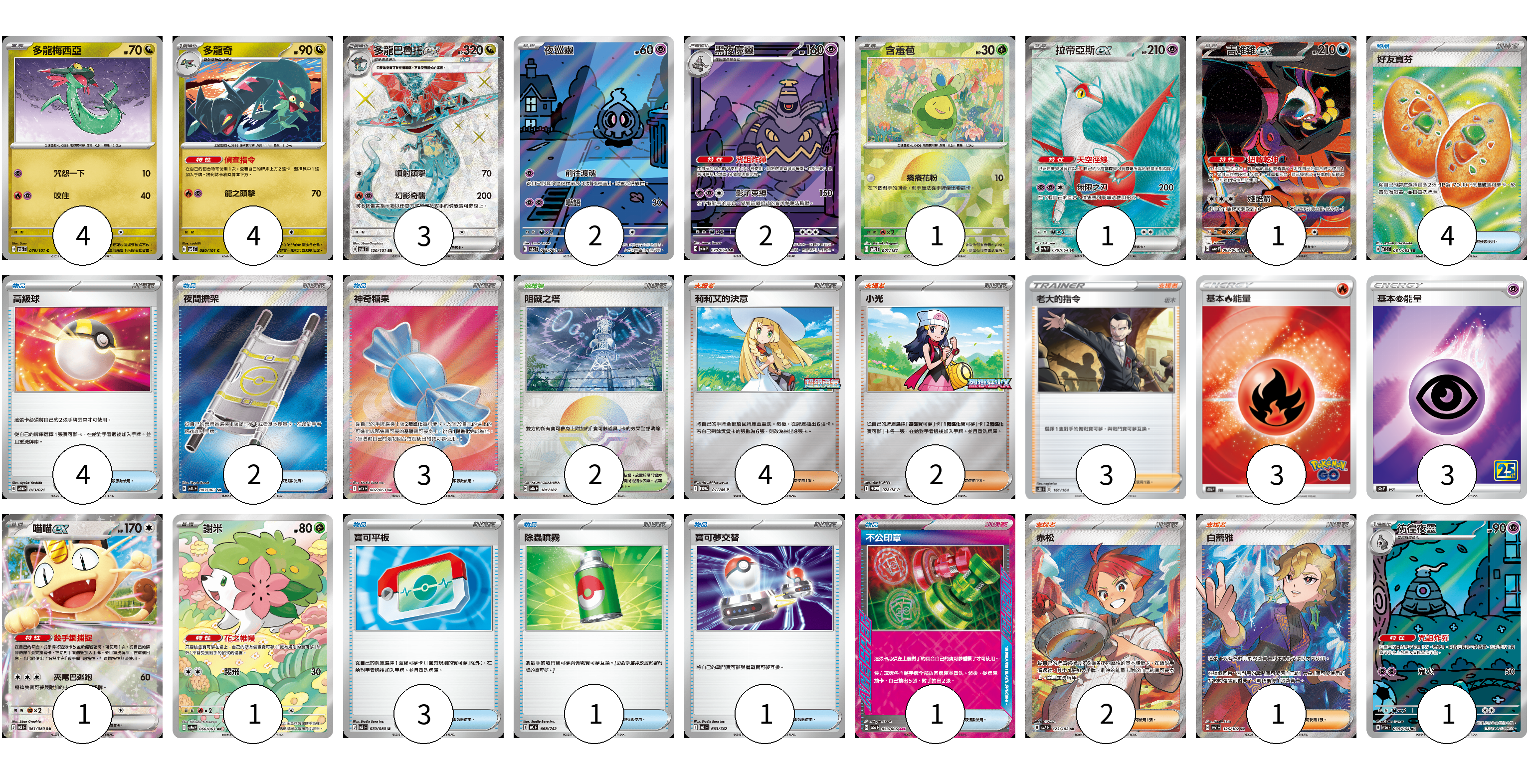 牌組構築方案 以此牌組為基礎新構築牌組 顯示卡面 顯示列表 寶可夢卡(21) 4 4 3 2 2 1 1 1 1 1 1 物品卡(19) 4 4 2 3 3 1 1 1 支援者卡(12) 4 2 3 2 1 競技場卡(2) 2 能量卡(6) 3 3 寶可夢卡(21) 卡牌名稱 張數 卡牌名稱 張數 多龍梅西亞 SV6 079/101 04 多龍奇 SV6 080/101 04 多龍巴魯托ex SV6 120/101 03 夜巡靈 SV6a 068/064 02 黑夜魔靈 SV6a 070/064 02 含羞苞 SV8a 001/187 01 拉帝亞斯ex SV7a 078/064 01 吉雉雞ex SV6a 089/064 01 喵喵ex M3 061/080 01 謝米 SV9a 066/063 01 彷徨夜靈 SV6a 069/064 01 物品卡(19) 卡牌名稱 張數 卡牌名稱 張數 好友寶芬 M1S 081/063 04 高級球 SVOM 013/021 04 夜間擔架 M1L 083/063 02 神奇糖果 M1S 082/063 03 寶可平板 M3 070/080 03 除蟲噴霧 MC 668/742 01 寶可夢交替 MC 663/742 01 不公印章 SV5a 053/066 01 支援者卡(12) 卡牌名稱 張數 卡牌名稱 張數 莉莉艾的決意 M-P 011/M-P 04 小光 M-P 028/M-P 02 老大的指令(坂木) SC1D 161/164 03 赤松 SV7 123/102 02 白蕾雅 SV7 126/102 01 競技場卡(2) 卡牌名稱 張數 卡牌名稱 張數 阻礙之塔 SV8a 181/187 02 能量卡(6) 卡牌名稱 張數 卡牌名稱 張數 基本火能量 S10b FIR 03 基本超能量 S8a PSY 03 以此牌組為基礎新構築牌組 牌組編碼 RcDGdM-bsarSZ-lKtytd copy 列印牌組單 牌組編碼已複製 分享至SNS