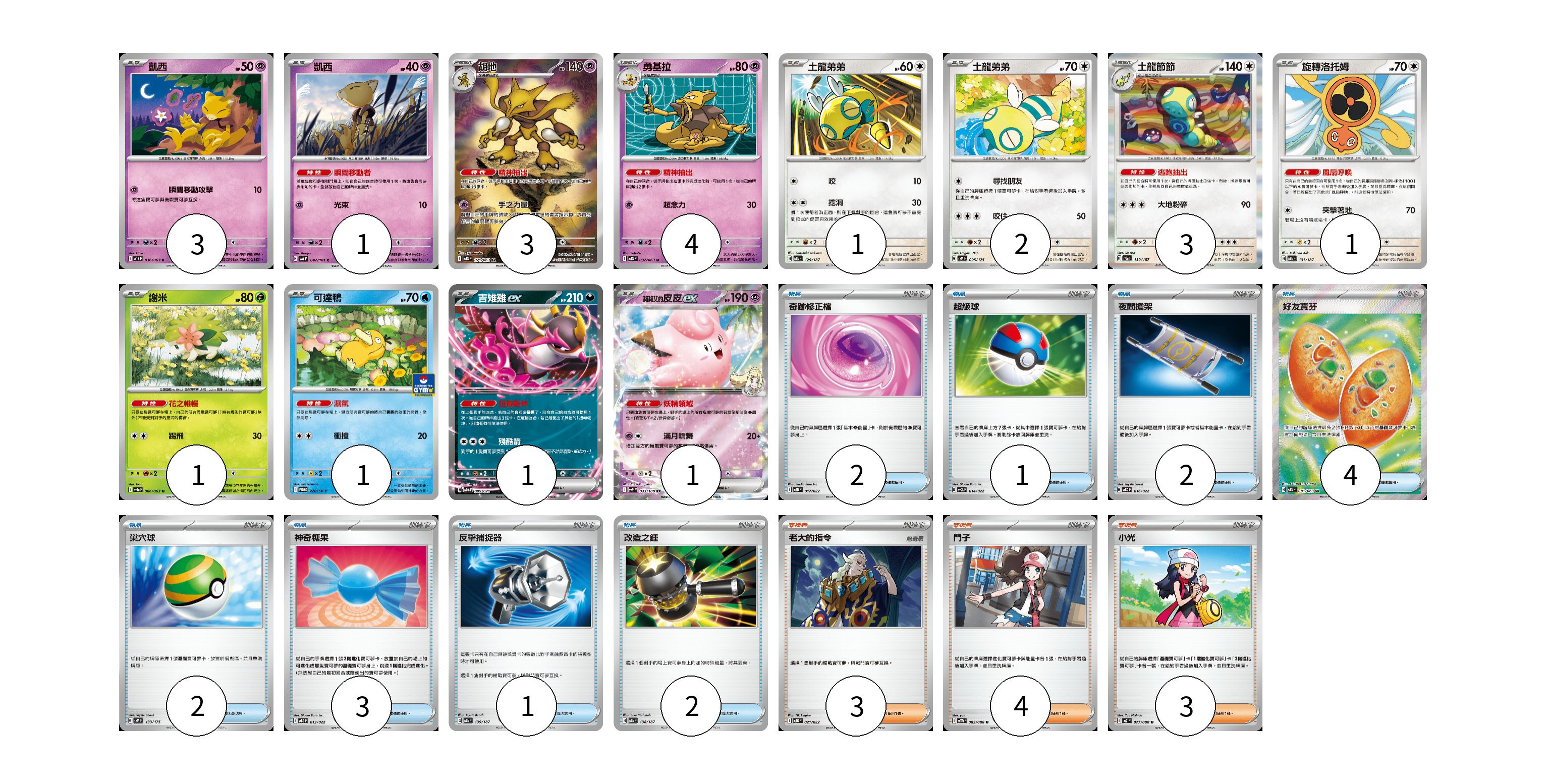 牌組構築方案 以此牌組為基礎新構築牌組 顯示卡面 顯示列表 寶可夢卡(22) 3 1 3 4 1 2 3 1 1 1 1 1 物品卡(17) 2 1 2 4 2 3 1 2 支援者卡(10) 3 4 3 寶可夢卡(22) 卡牌名稱 張數 卡牌名稱 張數 凱西 M1S 036/063 03 凱西 SV6 047/101 01 胡地 M1S 071/063 03 勇基拉 M1S 037/063 04 土龍弟弟 SV8a 129/187 01 土龍弟弟 SVM 095/175 02 土龍節節 SV8a 130/187 03 旋轉洛托姆 SV8a 131/187 01 謝米 SV9a 006/063 01 可達鴨 SV-P 220/SV-P 01 吉雉雞ex SVOM 009/021 01 莉莉艾的皮皮ex SV9 033/100 01 物品卡(17) 卡牌名稱 張數 卡牌名稱 張數 奇跡修正檔 MBD 017/022 02 超級球 SVQL 014/022 01 夜間擔架 MBD 016/022 02 好友寶芬 M1S 081/063 04 巢穴球 SVM 133/175 02 神奇糖果 MBG 013/022 03 反擊捕捉器 SV8a 139/187 01 改造之錘 SV8a 138/187 02 支援者卡(10) 卡牌名稱 張數 卡牌名稱 張數 老大的指令 MBG 021/022 03 鬥子 SV11W 085/086 04 小光 M2 077/080 03 以此牌組為基礎新構築牌組 牌組編碼 Rdwmyv-EnDLaN-VvmHqD copy 列印牌組單 牌組編碼已複製 分享至SNS