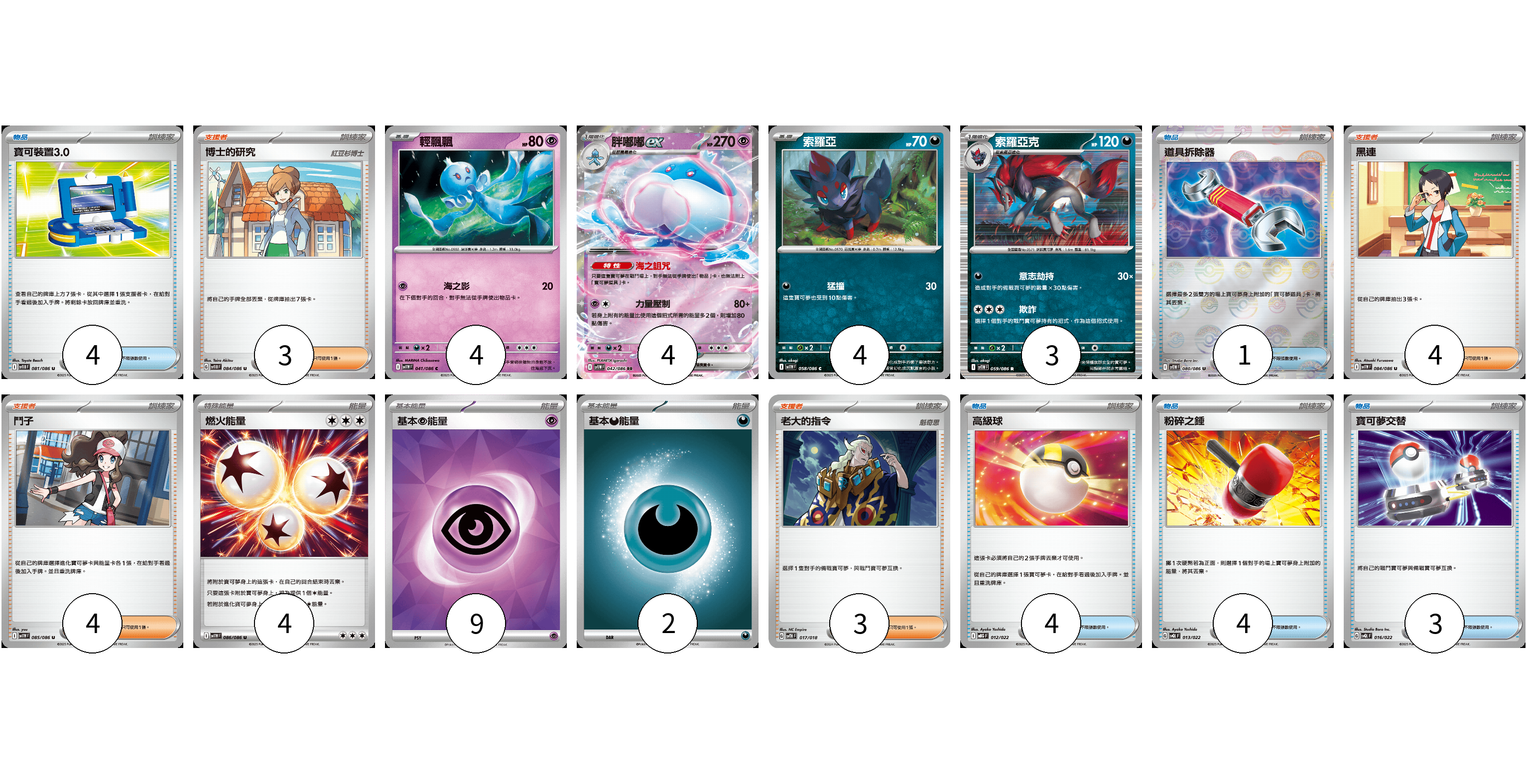 牌組構築方案 以此牌組為基礎新構築牌組 顯示卡面 顯示列表 寶可夢卡(15) 4 4 4 3 物品卡(16) 4 1 4 4 3 支援者卡(14) 3 4 4 3 能量卡(15) 4 9 2 寶可夢卡(15) 卡牌名稱 張數 卡牌名稱 張數 輕飄飄 SV11W 041/086 04 胖嘟嘟ex SV11W 042/086 04 索羅亞 SV11W 058/086 04 索羅亞克 SV11W 059/086 03 物品卡(16) 卡牌名稱 張數 卡牌名稱 張數 寶可裝置3.0 SV11B 081/086 04 道具拆除器 SV11W 080/086 01 高級球 MBG 012/022 04 粉碎之錘 SVQL 013/022 04 寶可夢交替 SVQL 016/022 03 支援者卡(14) 卡牌名稱 張數 卡牌名稱 張數 博士的研究 SV11B 084/086 03 黑連 SV11W 084/086 04 鬥子 SV11W 085/086 04 老大的指令 SVTH 017/018 03 能量卡(15) 卡牌名稱 張數 卡牌名稱 張數 燃火能量 SV11W 086/086 04 基本【超】能量 SVOD PSY 09 基本【惡】能量 M-P DAR 02 以此牌組為基礎新構築牌組 牌組編碼 ReGCWh-njyeDD-SdZsBC copy 列印牌組單 牌組編碼已複製 分享至SNS