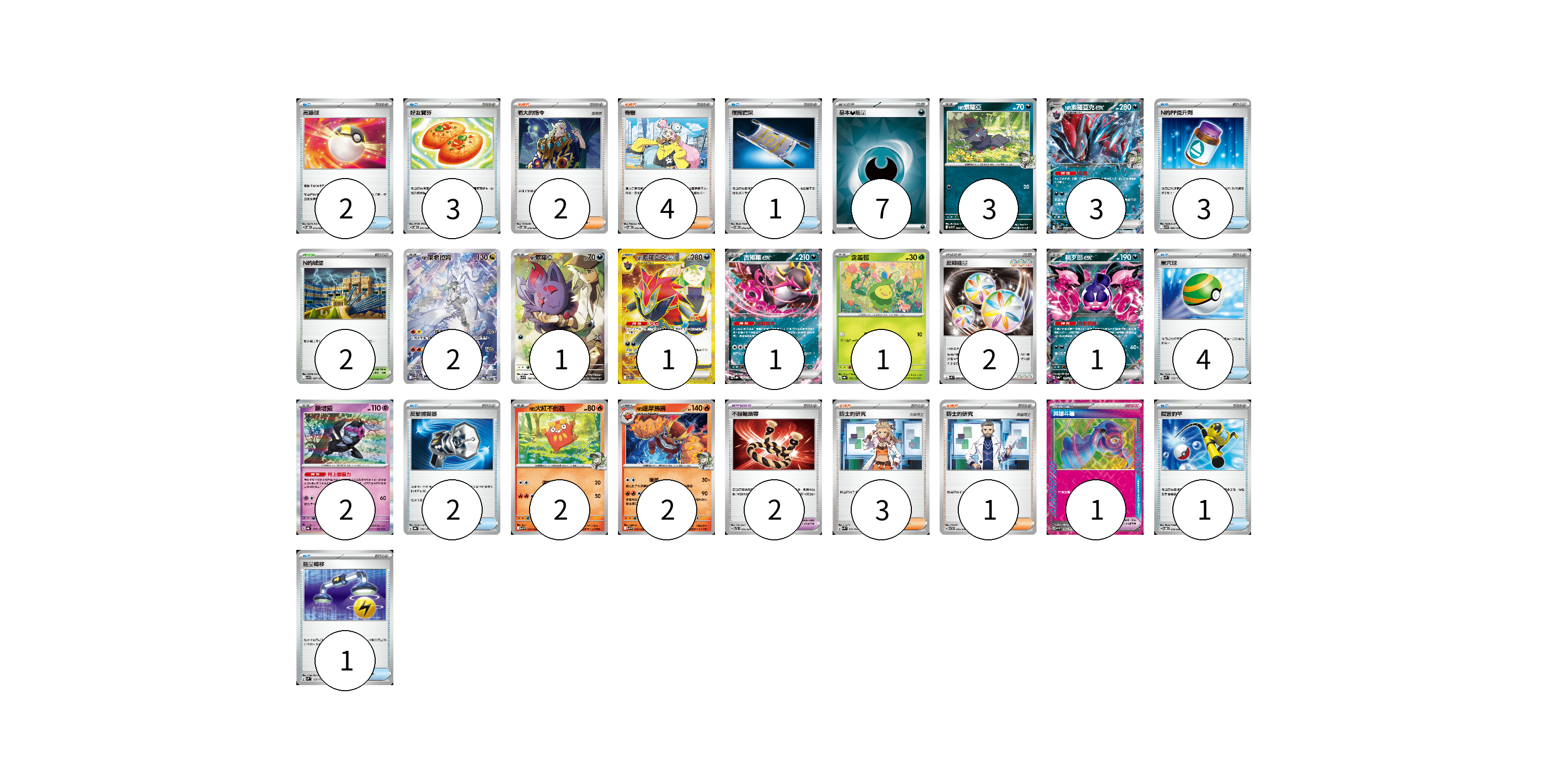 牌組構築方案 以此牌組為基礎新構築牌組 顯示卡面 顯示列表 寶可夢卡(19) 3 3 2 1 1 1 1 1 2 2 2 寶可夢道具(3) 2 1 物品卡(17) 2 3 1 3 4 2 1 1 支援者卡(10) 2 4 3 1 競技場卡(2) 2 能量卡(9) 7 2 寶可夢卡(19) 卡牌名稱 張數 卡牌名稱 張數 N的索羅亞 SV9 060/100 03 N的索羅亞克ex SV9 061/100 03 N的萊希拉姆 SV9 109/100 02 N的索羅亞 SV9 108/100 01 N的索羅亞克ex SV9 131/100 01 吉雉雞ex SV8a 104/187 01 含羞苞 SV8a 001/187 01 桃歹郎ex SV8a 105/187 01 願增猿 SV8a 075/187 02 N的火紅不倒翁 SV9 015/100 02 N的達摩狒狒 SV9 016/100 02 寶可夢道具(3) 卡牌名稱 張數 卡牌名稱 張數 不服輸頭帶 SVTL 016/021 02 英雄斗篷 SV5M 064/071 01 物品卡(17) 卡牌名稱 張數 卡牌名稱 張數 高級球 SVOD 012/020 02 好友寶芬 SVOD 011/020 03 夜間擔架 SVOM 016/021 01 N的PP提升劑 SV9 089/100 03 巢穴球 SVM 133/175 04 反擊捕捉器 SV8a 139/187 02 厲害釣竿 SVOD 010/020 01 能量轉移 SVM 127/175 01 支援者卡(10) 卡牌名稱 張數 卡牌名稱 張數 老大的指令 SVOD 019/020 02 奇樹 SVOD 016/020 04 博士的研究 SVK 032/042 03 博士的研究 SVTH 016/018 01 競技場卡(2) 卡牌名稱 張數 卡牌名稱 張數 N的城堡 SV9 097/100 02 能量卡(9) 卡牌名稱 張數 卡牌名稱 張數 基本【惡】能量 SVOM DAR 07 反轉能量 SVK 041/042 02 以此牌組為基礎新構築牌組 牌組編碼 RiXRrs-FJXimK-EEsjRE copy 列印牌組單 牌組編碼已複製 分享至SNS