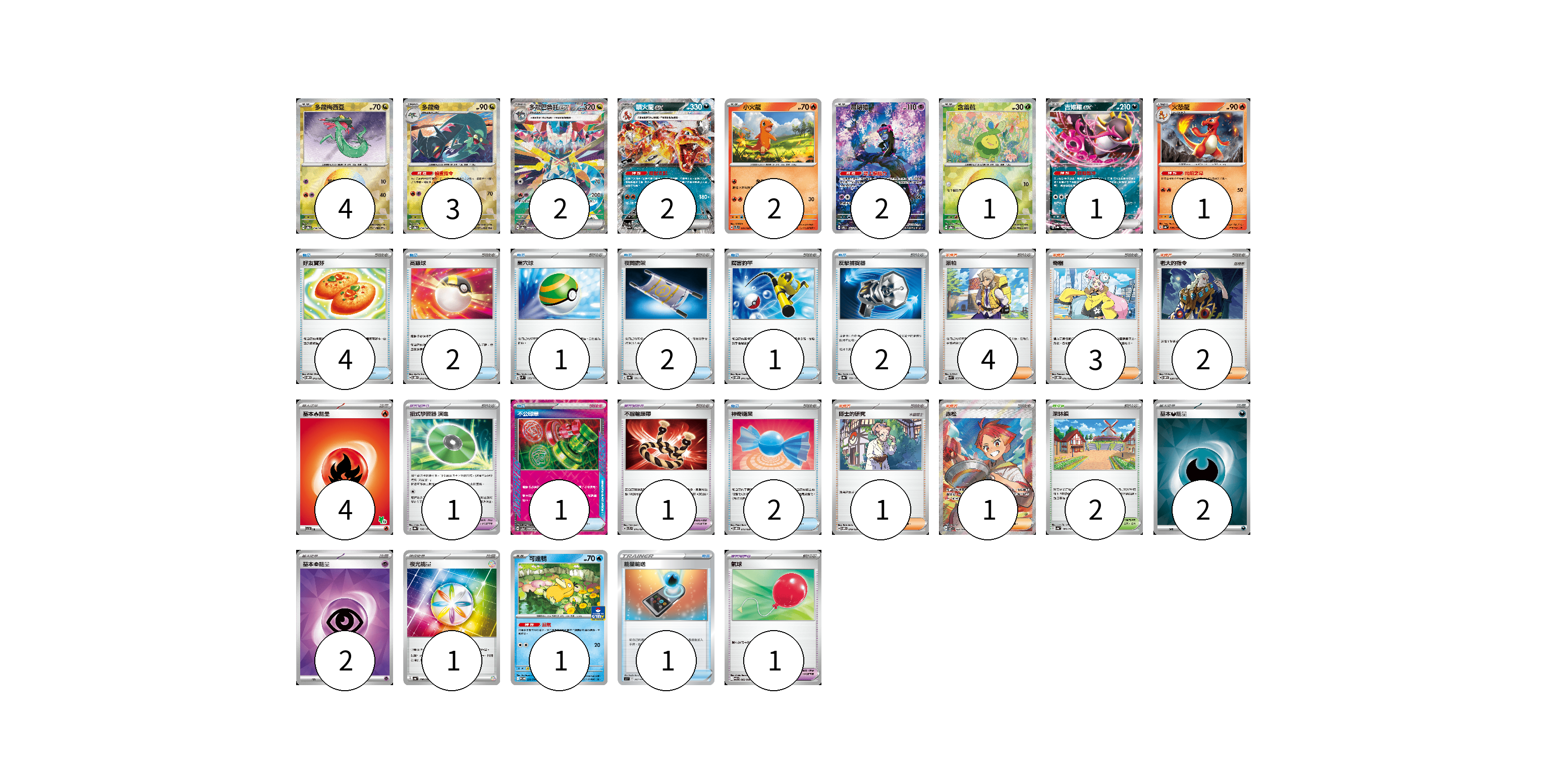 牌組構築方案 以此牌組為基礎新構築牌組 顯示卡面 顯示列表 寶可夢卡(19) 4 3 2 2 2 2 1 1 1 1 寶可夢道具(3) 1 1 1 物品卡(16) 4 2 1 2 1 2 1 2 1 支援者卡(11) 4 3 2 1 1 競技場卡(2) 2 能量卡(9) 4 2 2 1 寶可夢卡(19) 卡牌名稱 張數 卡牌名稱 張數 多龍梅西亞 SV8a 118/187 04 多龍奇 SV8a 119/187 03 多龍巴魯托ex SV8a 221/187 02 噴火龍ex SV4a 115/190 02 小火龍 SVTL 001/021 02 願增猿 SV6 107/101 02 含羞苞 SV8a 001/187 01 吉雉雞ex SV8a 104/187 01 火恐龍 SV4a 026/190 01 可達鴨 SV-P 220/SV-P 01 寶可夢道具(3) 卡牌名稱 張數 卡牌名稱 張數 招式學習器 演進 SV8a 160/187 01 不服輸頭帶 SVTL 016/021 01 氣球 SV11B 082/086 01 物品卡(16) 卡牌名稱 張數 卡牌名稱 張數 好友寶芬 SVOM 012/021 04 高級球 SVOD 012/020 02 巢穴球 SVM 133/175 01 夜間擔架 SV8a 151/187 02 厲害釣竿 SVOM 011/021 01 反擊捕捉器 SV8a 139/187 02 不公印章 SV5a 053/066 01 神奇糖果 SVOD 013/020 02 能量輸送 SI 367/414 01 支援者卡(11) 卡牌名稱 張數 卡牌名稱 張數 派帕 SVK 035/042 04 奇樹 SVOD 016/020 03 老大的指令 SVOM 020/021 02 博士的研究 SVOM 019/021 01 赤松 SV7 123/102 01 競技場卡(2) 卡牌名稱 張數 卡牌名稱 張數 深缽鎮 SV4a 185/190 02 能量卡(9) 卡牌名稱 張數 卡牌名稱 張數 基本【火】能量 SVI FIR 04 基本【惡】能量 SVK DAR 02 基本【超】能量 SVOD PSY 02 夜光能量 SV4a 190/190 01 以此牌組為基礎新構築牌組 牌組編碼 RjLVkw-kpBAkA-UixIyY copy 列印牌組單 牌組編碼已複製 分享至SNS