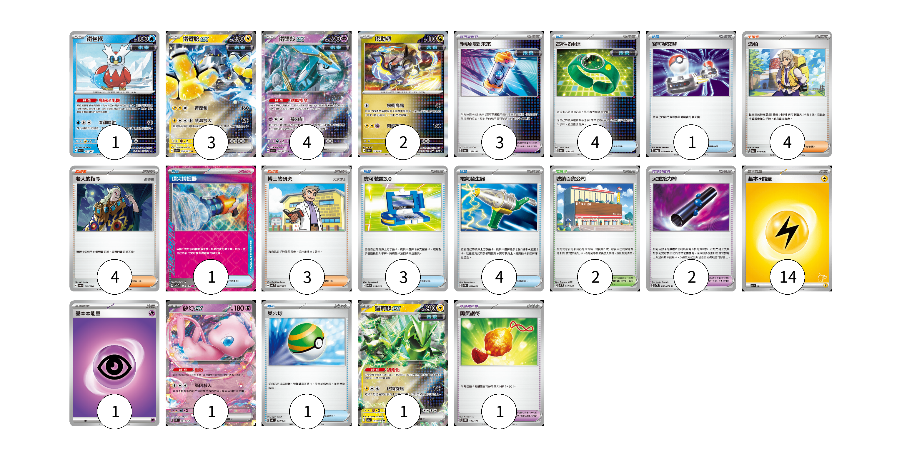 牌組構築方案 以此牌組為基礎新構築牌組 顯示卡面 顯示列表 寶可夢卡(12) 1 3 4 2 1 1 寶可夢道具(6) 3 2 1 物品卡(14) 4 1 1 3 4 1 支援者卡(11) 4 4 3 競技場卡(2) 2 能量卡(15) 14 1 寶可夢卡(12) 卡牌名稱 張數 卡牌名稱 張數 鐵包袱 SV8a 047/187 01 鐵臂膀ex SV8a 054/187 03 鐵頭殼ex SV8a 078/187 04 密勒頓 SV8a 123/187 02 夢幻ex SVK 001/042 01 鐵荊棘ex SV8a 056/187 01 寶可夢道具(6) 卡牌名稱 張數 卡牌名稱 張數 驅勁能量 未來 SV8a 158/187 03 沉重接力棒 SV5M 066/071 02 勇氣護符 SVM 142/175 01 物品卡(14) 卡牌名稱 張數 卡牌名稱 張數 高科技雷達 SV8a 144/187 04 寶可夢交替 SV9a 058/063 01 頂尖捕捉器 SV8a 148/187 01 寶可裝置3.0 SVTL 014/021 03 電氣發生器 SVTR 011/021 04 巢穴球 SVM 133/175 01 支援者卡(11) 卡牌名稱 張數 卡牌名稱 張數 派帕 SVOD 018/020 04 老大的指令 SVOD 019/020 04 博士的研究 SVM 162/175 03 競技場卡(2) 卡牌名稱 張數 卡牌名稱 張數 城鎮百貨公司 SVK 037/042 02 能量卡(15) 卡牌名稱 張數 卡牌名稱 張數 基本【雷】能量 SVI LIG 14 基本【超】能量 SVTS PSY 01 以此牌組為基礎新構築牌組 牌組編碼 RkmnoD-oGMQtv-besNXa copy 列印牌組單 牌組編碼已複製 分享至SNS