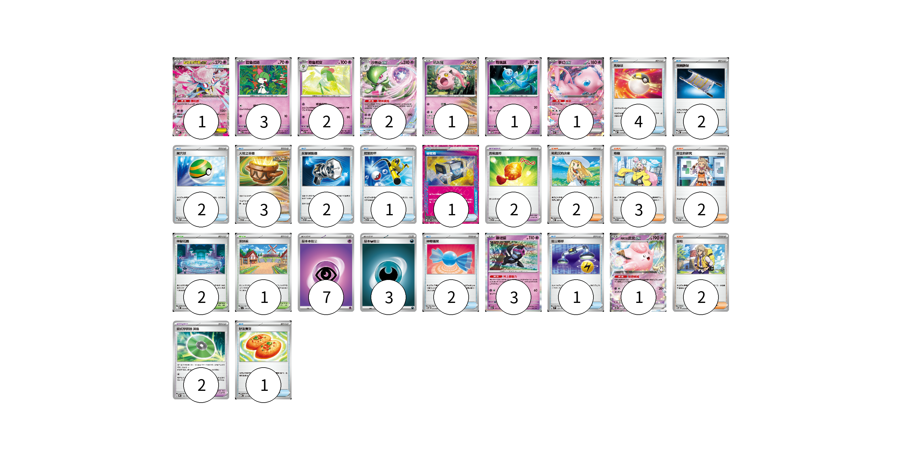 牌組構築方案 以此牌組為基礎新構築牌組 顯示卡面 顯示列表 寶可夢卡(15) 1 3 2 2 1 1 1 3 1 寶可夢道具(4) 2 2 物品卡(19) 4 2 2 3 2 1 1 2 1 1 支援者卡(9) 2 3 2 2 競技場卡(3) 2 1 能量卡(10) 7 3 寶可夢卡(15) 卡牌名稱 張數 卡牌名稱 張數 超級蒂安希ex MBD 006/022 01 拉魯拉絲 M1S 040/063 03 奇魯莉安 M1S 041/063 02 沙奈朵ex SVTS 004/022 02 吼叫尾 SVTS 007/022 01 輕飄飄 SV11W 041/086 01 夢幻ex SVK 001/042 01 願增猿 SV8a 075/187 03 莉莉艾的皮皮ex SV9 033/100 01 寶可夢道具(4) 卡牌名稱 張數 卡牌名稱 張數 勇氣護符 SVTS 017/022 02 招式學習器 演進 SV8a 160/187 02 物品卡(19) 卡牌名稱 張數 卡牌名稱 張數 高級球 MBD 014/022 04 夜間擔架 MBD 016/022 02 巢穴球 SVTS 013/022 02 大地之容器 SVTS 011/022 03 反擊捕捉器 SVTS 009/022 02 厲害釣竿 SVTS 010/022 01 秘密箱 SV6 092/101 01 神奇糖果 SVOD 013/020 02 能量轉移 SVM 127/175 01 好友寶芬 MBD 013/022 01 支援者卡(9) 卡牌名稱 張數 卡牌名稱 張數 莉莉艾的決意 MBD 021/022 02 奇樹 SVTS 018/022 03 博士的研究 SVTS 019/022 02 派帕 SVOD 018/020 02 競技場卡(3) 卡牌名稱 張數 卡牌名稱 張數 神秘花園 MBD 022/022 02 深缽鎮 SV1a 070/073 01 能量卡(10) 卡牌名稱 張數 卡牌名稱 張數 基本超能量 sv-p PSY 07 基本惡能量 sv-p DAR 03 以此牌組為基礎新構築牌組 牌組編碼 RlzdUB-PAQvQW-ouBGuQ copy 列印牌組單 牌組編碼已複製 分享至SNS