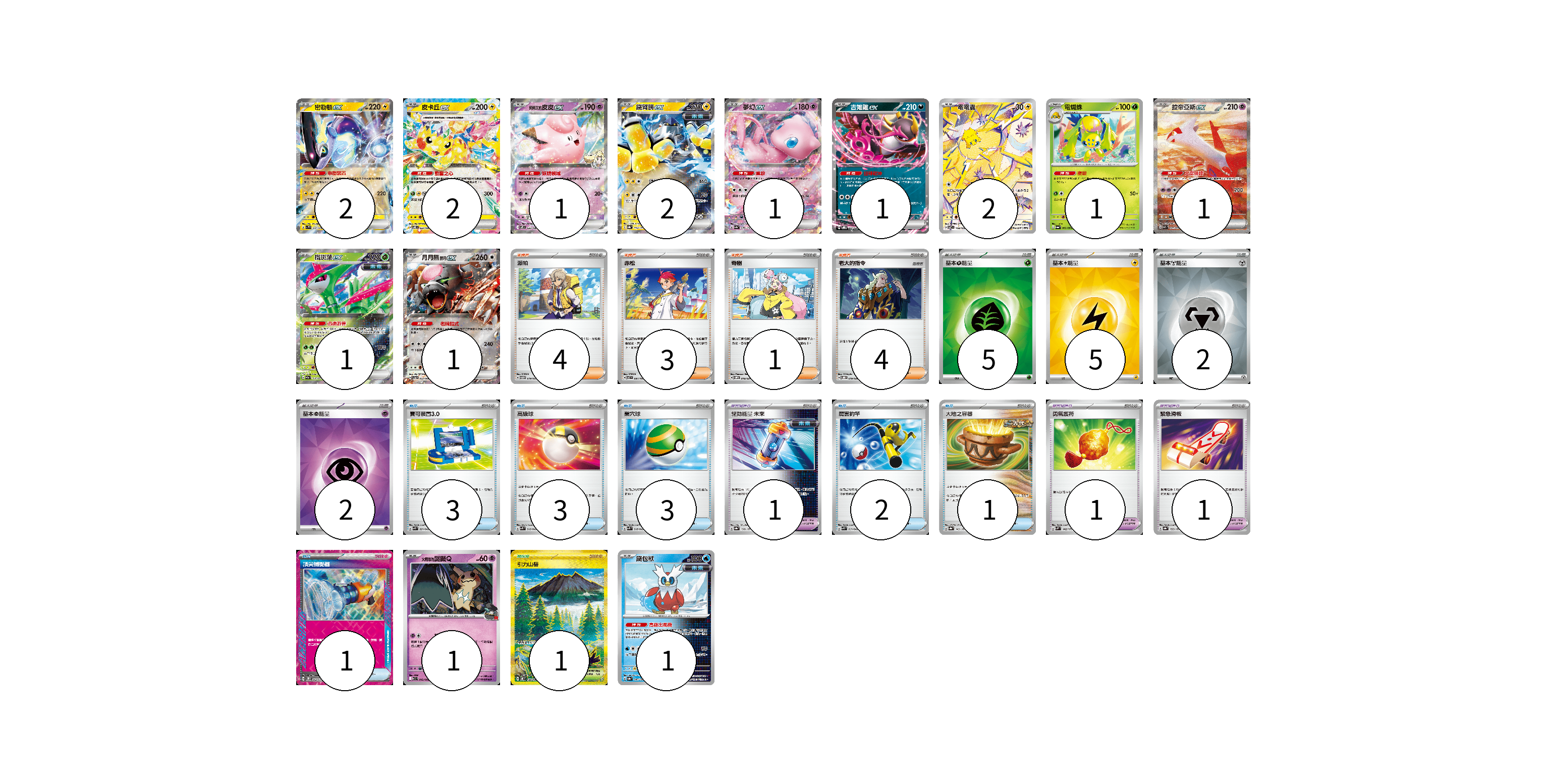 牌組構築方案 以此牌組為基礎新構築牌組 顯示卡面 顯示列表 寶可夢卡(17) 2 2 1 2 1 1 2 1 1 1 1 1 1 寶可夢道具(3) 1 1 1 物品卡(13) 3 3 3 2 1 1 支援者卡(12) 4 3 1 4 競技場卡(1) 1 能量卡(14) 5 5 2 2 寶可夢卡(17) 卡牌名稱 張數 卡牌名稱 張數 密勒頓ex SV1V 037/078 02 皮卡丘ex SV8 033/106 02 莉莉艾的皮皮ex SV9 033/100 01 鐵臂膀ex SV8a 054/187 02 夢幻ex SV4a 076/190 01 吉雉雞ex SVOD 004/020 01 電電蟲 SV7 108/102 02 電蜘蛛 SV6a 002/064 01 拉帝亞斯ex SV7a 087/064 01 鐵斑葉ex SV5M 016/071 01 月月熊 赫月 ex SV5a 052/066 01 <火箭隊的>謎擬Q SV10 042/098 01 鐵包袱 SV8a 047/187 01 寶可夢道具(3) 卡牌名稱 張數 卡牌名稱 張數 驅勁能量 未來 SV8a 158/187 01 勇氣護符 SVM 142/175 01 緊急滑板 SV8a 153/187 01 物品卡(13) 卡牌名稱 張數 卡牌名稱 張數 寶可裝置3.0 SVK 021/042 03 高級球 SVK 018/042 03 巢穴球 SVK 016/042 03 厲害釣竿 SVK 011/042 02 大地之容器 SV8a 143/187 01 頂尖捕捉器 SV5M 062/071 01 支援者卡(12) 卡牌名稱 張數 卡牌名稱 張數 派帕 SVTM 019/022 04 赤松 SV7 097/102 03 奇樹 SVOM 018/021 01 老大的指令 SVOD 019/020 04 競技場卡(1) 卡牌名稱 張數 卡牌名稱 張數 引力山岳 SV8 138/106 01 能量卡(14) 卡牌名稱 張數 卡牌名稱 張數 基本【草】能量 SVK GRA 05 基本【雷】能量 SVK LIG 05 基本【鋼】能量 SVK MET 02 基本【超】能量 SVK PSY 02 以此牌組為基礎新構築牌組 牌組編碼 RnBYiM-FcTRAA-vwnBye copy 列印牌組單 牌組編碼已複製 分享至SNS