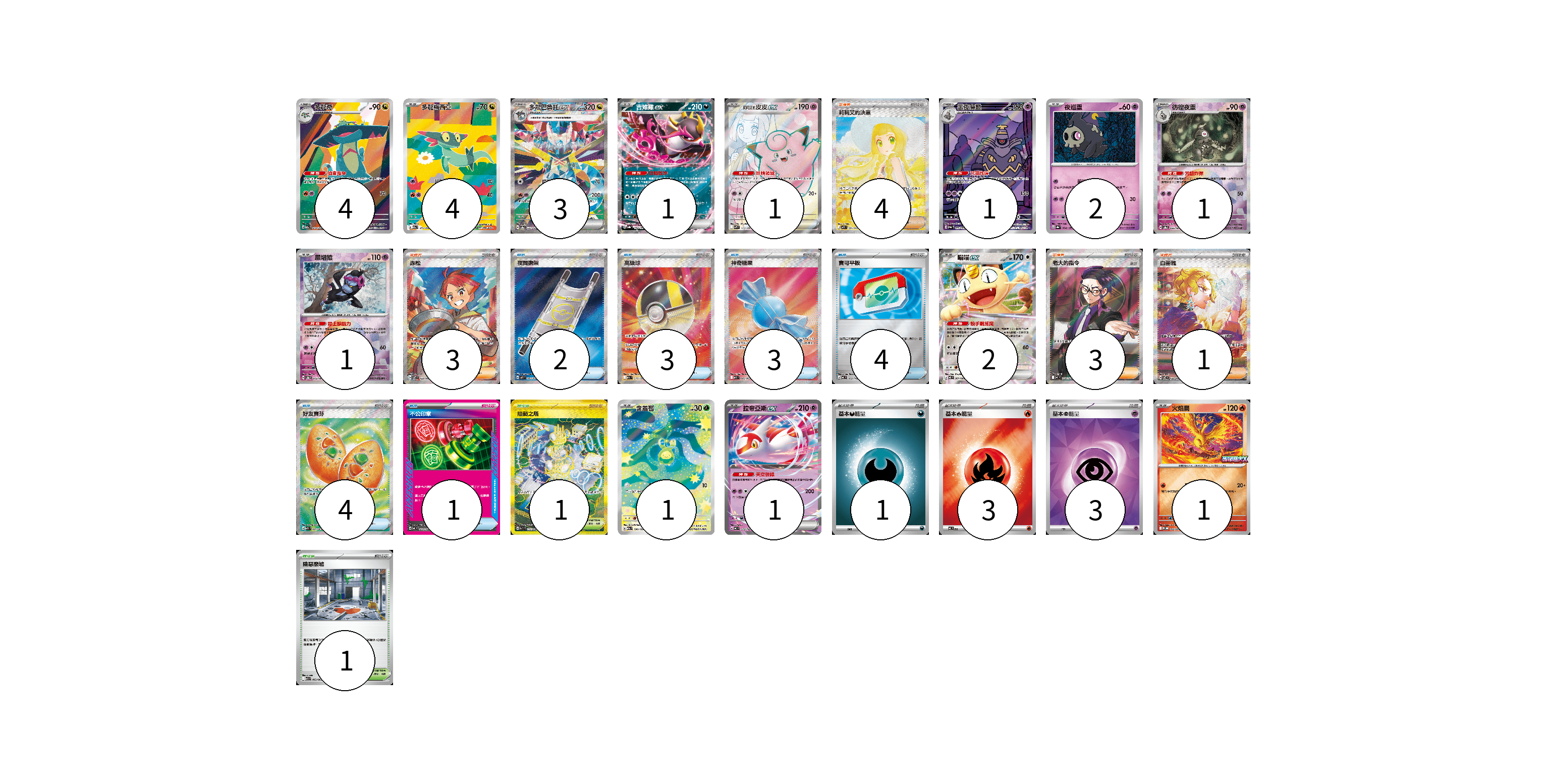 牌組構築方案 以此牌組為基礎新構築牌組 顯示卡面 顯示列表 寶可夢卡(23) 4 4 3 1 1 1 2 1 1 2 1 1 1 物品卡(17) 2 3 3 4 4 1 支援者卡(11) 4 3 3 1 競技場卡(2) 1 1 能量卡(7) 1 3 3 寶可夢卡(23) 卡牌名稱 張數 卡牌名稱 張數 多龍奇 M2a 212/193 04 多龍梅西亞 M2a 211/193 04 多龍巴魯托ex SV8a 221/187 03 吉雉雞ex SV8a 104/187 01 莉莉艾的皮皮ex SV9 115/100 01 黑夜魔靈 SV6a 070/064 01 夜巡靈 SV8a 064/187 02 彷徨夜靈 SV8a 065/187 01 願增猿 SV8a 075/187 01 喵喵ex M3 061/080 02 含羞苞 M2a 196/193 01 拉帝亞斯ex MC 312/742 01 火焰鳥 M-P 022/M-P 01 物品卡(17) 卡牌名稱 張數 卡牌名稱 張數 夜間擔架 M1L 083/063 02 高級球 M2a 216/193 03 神奇糖果 M1S 082/063 03 寶可平板 MC 662/742 04 好友寶芬 M1S 081/063 04 不公印章 MC 633/742 01 支援者卡(11) 卡牌名稱 張數 卡牌名稱 張數 莉莉艾的決意 M1L 091/063 04 赤松 SV7 123/102 03 老大的指令(烏羽) MC 760/742 03 白蕾雅 SV7 132/102 01 競技場卡(2) 卡牌名稱 張數 卡牌名稱 張數 阻礙之塔 SV10 132/098 01 險惡廢墟 M1L 063/063 01 能量卡(7) 卡牌名稱 張數 卡牌名稱 張數 基本【惡】能量 MC DAR 01 基本【火】能量 MC FIR 03 基本【超】能量 SVOD PSY 03 以此牌組為基礎新構築牌組 牌組編碼 RnkcWz-JbLxHw-VBYsan copy 列印牌組單 牌組編碼已複製 分享至SNS