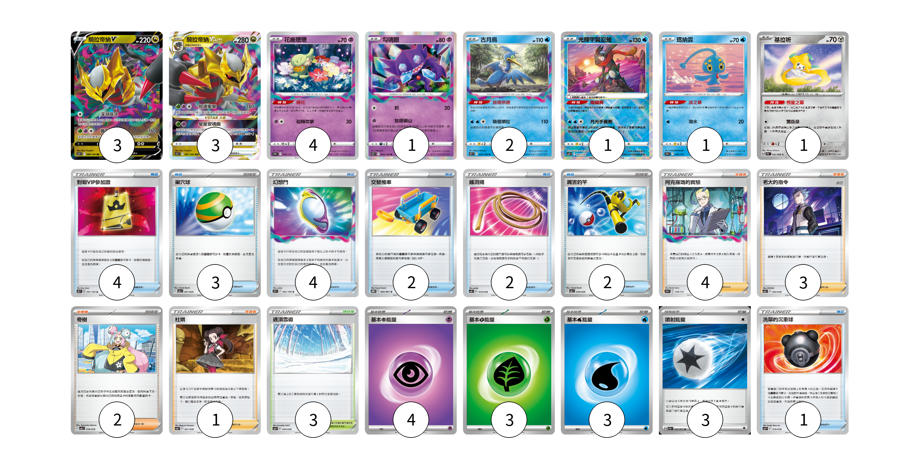 牌組構築方案 以此牌組為基礎新構築牌組 顯示卡面 顯示列表 寶可夢卡(18) 3 3 4 1 2 1 1 1 2 物品卡(16) 4 3 4 2 2 1 支援者卡(10) 4 3 2 1 競技場卡(3) 3 能量卡(13) 4 3 3 3 寶可夢卡(18) 卡牌名稱 張數 卡牌名稱 張數 騎拉帝納V S11 080/100 03 騎拉帝納VSTAR S11 081/100 03 花療環環 S12a 064/172 04 勾魂眼 S11 044/100 01 古月鳥 S11 033/100 02 光輝甲賀忍蛙 SVF 004/038 01 瑪納霏 S12a 029/172 01 基拉祈 SV3a 042/062 01 厲害釣竿 SVEL 010/020 02 物品卡(16) 卡牌名稱 張數 卡牌名稱 張數 對戰VIP參加證 S8 091/100 04 巢穴球 SVEL 011/020 03 幻想門 S11 092/100 04 交替推車 S10D 060/067 02 離洞繩 SVF 010/038 02 洗翠的沉重球 SVF 019/038 01 支援者卡(10) 卡牌名稱 張數 卡牌名稱 張數 阿克羅瑪的實驗 S12a 148/172 04 老大的指令(赤日) SVB 024/028 03 奇樹 SVEL 016/020 02 杜娟 SVB 021/028 01 競技場卡(3) 卡牌名稱 張數 卡牌名稱 張數 通頂雪道 SVF 034/038 03 能量卡(13) 卡牌名稱 張數 卡牌名稱 張數 基本超能量 sv-p PSY 04 基本草能量 sv-p GRA 03 基本水能量 sv-p WAT 03 噴射能量 SV1a 072/073 03 以此牌組為基礎新構築牌組 牌組編碼 Rnmece-vUdhOo-hwWlKg copy 列印牌組單 牌組編碼已複製 分享至SNS