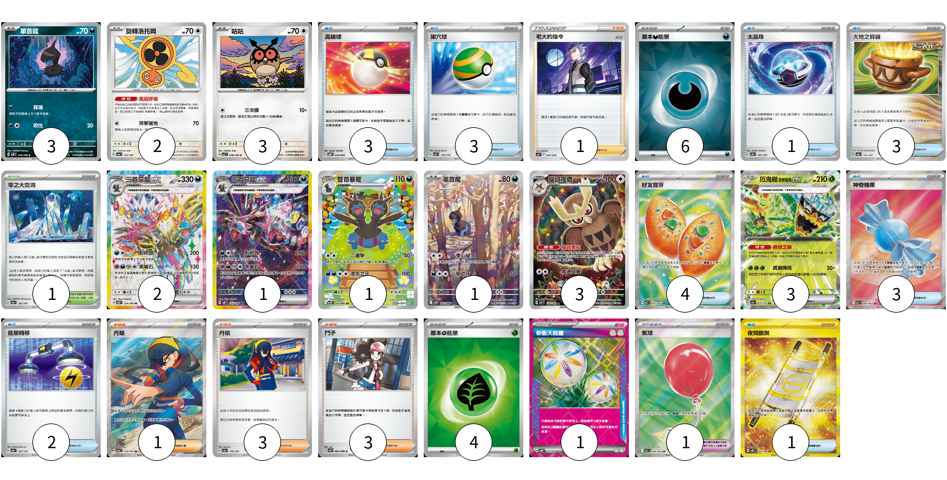 牌組構築方案 以此牌組為基礎新構築牌組 顯示卡面 顯示列表 寶可夢卡(19) 3 2 3 2 1 1 1 3 3 寶可夢道具(1) 1 物品卡(20) 3 3 1 3 4 3 2 1 支援者卡(8) 1 1 3 3 競技場卡(1) 1 能量卡(11) 6 4 1 寶可夢卡(19) 卡牌名稱 張數 卡牌名稱 張數 單首龍 SV8 070/106 03 旋轉洛托姆 SV8a 131/187 02 咕咕 SV7 076/102 03 三首惡龍ex SV8 124/106 02 三首惡龍ex SV8 133/106 01 雙首暴龍 SV11W 143/086 01 單首龍 SV11W 142/086 01 貓頭夜鷹 SV7 114/102 03 厄鬼椪 碧草面具ex SV8a 020/187 03 寶可夢道具(1) 卡牌名稱 張數 卡牌名稱 張數 氣球 M1L 084/063 01 物品卡(20) 卡牌名稱 張數 卡牌名稱 張數 高級球 SVOD 012/020 03 巢穴球 SVM 133/175 03 太晶珠 SV8a 145/187 01 大地之容器 SV8a 143/187 03 好友寶芬 M1S 081/063 04 神奇糖果 M1S 082/063 03 能量轉移 SVM 127/175 02 夜間擔架 SV8 137/106 01 支援者卡(8) 卡牌名稱 張數 卡牌名稱 張數 老大的指令(赤日) SVB 024/028 01 丹瑜 SV6 123/101 01 丹瑜 SV8a 170/187 03 鬥子 SV11W 085/086 03 競技場卡(1) 卡牌名稱 張數 卡牌名稱 張數 零之大空洞 SV8a 182/187 01 能量卡(11) 卡牌名稱 張數 卡牌名稱 張數 基本【惡】能量 SVOM DAR 06 基本【草】能量 SVM GRA 04 新衝天能量 SV5K 071/071 01 以此牌組為基礎新構築牌組 牌組編碼 RoWlkT-crXKlG-dtcFLF copy 列印牌組單 牌組編碼已複製 分享至SNS