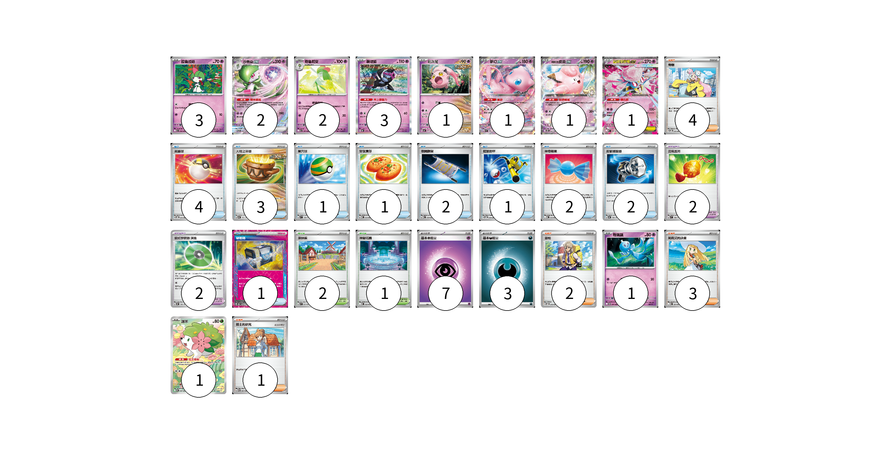 牌組構築方案 以此牌組為基礎新構築牌組 顯示卡面 顯示列表 寶可夢卡(16) 3 2 2 3 1 1 1 1 1 1 寶可夢道具(4) 2 2 物品卡(17) 4 3 1 1 2 1 2 2 1 支援者卡(10) 4 2 3 1 競技場卡(3) 2 1 能量卡(10) 7 3 寶可夢卡(16) 卡牌名稱 張數 卡牌名稱 張數 拉魯拉絲 M1S 040/063 03 沙奈朵ex SVTS 004/022 02 奇魯莉安 M1S 041/063 02 願增猿 SV8a 075/187 03 吼叫尾 SV4K 032/066 01 夢幻ex SV4a 076/190 01 莉莉艾的皮皮ex SV9 033/100 01 超級蒂安希ex MBD 006/022 01 輕飄飄 SV11W 041/086 01 謝米 SV9a 066/063 01 寶可夢道具(4) 卡牌名稱 張數 卡牌名稱 張數 勇氣護符 SVM 142/175 02 招式學習器 演進 SV8a 160/187 02 物品卡(17) 卡牌名稱 張數 卡牌名稱 張數 高級球 SVOD 012/020 04 大地之容器 SV8a 143/187 03 巢穴球 SVM 133/175 01 好友寶芬 MBD 013/022 01 夜間擔架 MBD 016/022 02 厲害釣竿 SVOD 010/020 01 神奇糖果 MBG 013/022 02 反擊捕捉器 SV8a 139/187 02 秘密箱 SV6 092/101 01 支援者卡(10) 卡牌名稱 張數 卡牌名稱 張數 奇樹 SVOD 016/020 04 派帕 SVOD 018/020 02 莉莉艾的決意 MBD 021/022 03 博士的研究 SV11B 084/086 01 競技場卡(3) 卡牌名稱 張數 卡牌名稱 張數 深缽鎮 SVK 039/042 02 神秘花園 MBD 022/022 01 能量卡(10) 卡牌名稱 張數 卡牌名稱 張數 基本【超】能量 MBD PSY 07 基本【惡】能量 MBG DAR 03 以此牌組為基礎新構築牌組 牌組編碼 RoYKRL-bfgYHc-IERAIX copy 列印牌組單 牌組編碼已複製 分享至SNS