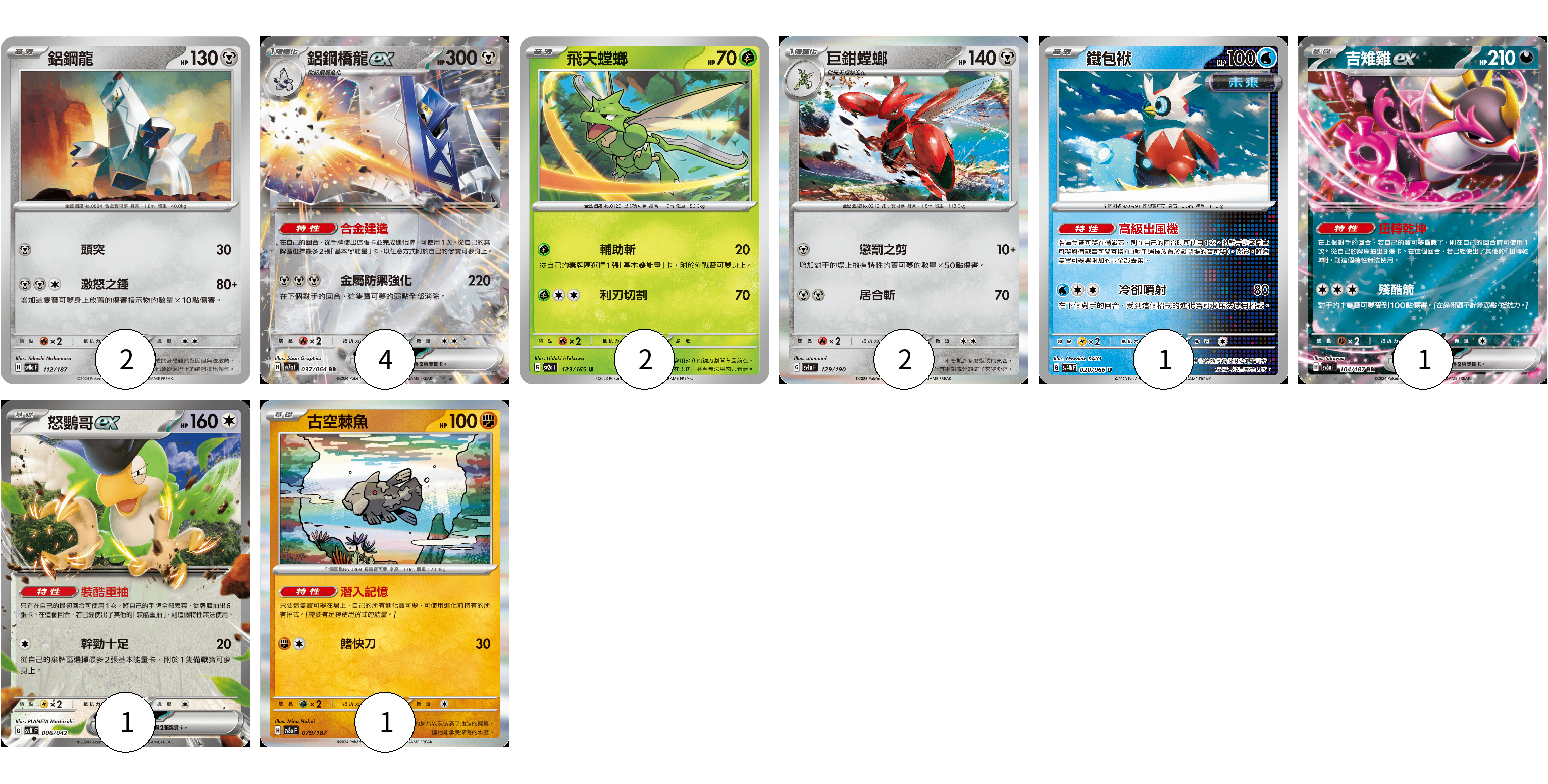 牌組構築方案 以此牌組為基礎新構築牌組 顯示卡面 顯示列表 寶可夢卡(14) 2 4 2 2 1 1 1 1 寶可夢卡(14) 卡牌名稱 張數 卡牌名稱 張數 鋁鋼龍 SV8a 112/187 02 鋁鋼橋龍ex SV7a 037/064 04 飛天螳螂 SV2a 123/165 02 巨鉗螳螂 SV4a 129/190 02 鐵包袱 SV4M 020/066 01 吉雉雞ex SV8a 104/187 01 怒鸚哥ex SVK 006/042 01 古空棘魚 SV8a 079/187 01 以此牌組為基礎新構築牌組 牌組編碼 RogfkO-GwSDmU-YMWBUd copy 列印牌組單 牌組編碼已複製 分享至SNS
